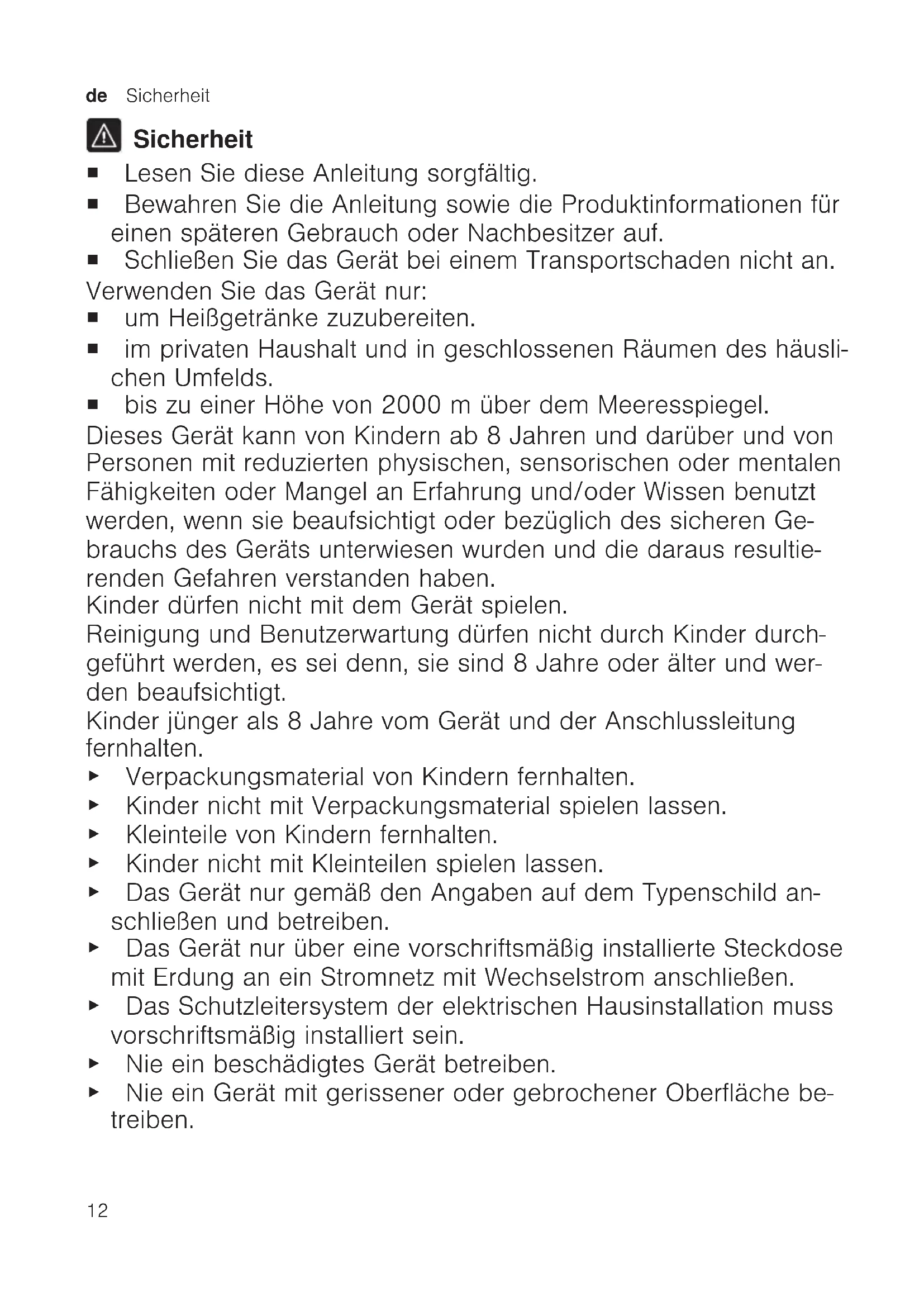 Sicherheit ¡ Lesen Sie diese Anleitung sorgfältig. ¡ Bewahren Sie die Anleitung sowie die Produktinformationen für einen späteren Gebrauch oder Nachbesitzer auf. ¡ Schließen Sie das Gerät bei einem Transportschaden nicht an. Verwenden Sie das Gerät nur: ¡ um Heißgetränke zuzubereiten. ¡ im privaten Haushalt und in geschlossenen Räumen des häusli- chen Umfelds. ¡ bis zu einer Höhe von 2000m über dem Meeresspiegel. Dieses Gerät kann von Kindern ab 8 Jahren und darüber und von Personen mit reduzierten physischen, sensorischen oder mentalen Fähigkeiten oder Mangel an Erfahrung und/oder Wissen benutzt werden, wenn sie beaufsichtigt oder bezüglich des sicheren Ge- brauchs des Geräts unterwiesen wurden und die daraus resultie- renden Gefahren verstanden haben. Kinder dürfen nicht mit dem Gerät spielen. Reinigung und Benutzerwartung dürfen nicht durch Kinder durch- geführt werden, es sei denn, sie sind 8 Jahre oder älter und wer- den beaufsichtigt. Kinder jünger als 8 Jahre vom Gerät und der Anschlussleitung fernhalten. ▶ Verpackungsmaterial von Kindern fernhalten. ▶ Kinder nicht mit Verpackungsmaterial spielen lassen. ▶ Kleinteile von Kindern fernhalten. ▶ Kinder nicht mit Kleinteilen spielen lassen. ▶ Das Gerät nur gemäß den Angaben auf dem Typenschild an- schließen und betreiben. ▶ Das Gerät nur über eine vorschriftsmäßig installierte Steckdose mit Erdung an ein Stromnetz mit Wechselstrom anschließen. ▶ Das Schutzleitersystem der elektrischen Hausinstallation muss vorschriftsmäßig installiert sein. ▶ Nie ein beschädigtes Gerät betreiben. ▶ Nie ein Gerät mit gerissener oder gebrochener Oberfläche be- treiben.Sicherheit de Gedruckt auf 100% Recyclingpapier 13 ▶ Nie an der Netzanschlussleitung ziehen, um das Gerät vom Stromnetz zu trennen. Immer am Netzstecker der Netzanschluss- leitung ziehen. ▶ Wenn das Gerät oder die Netzanschlussleitung beschädigt ist, sofort den Netzstecker der Netzanschlussleitung ziehen oder die Sicherung im Sicherungskasten ausschalten. ▶ Den Kundendienst rufen. →Seite17 ▶ Nur dafür geschultes Fachpersonal darf Reparaturen am Gerät durchführen. ▶ Nur Original-Ersatzteile dürfen zur Reparatur des Geräts verwen- det werden. ▶ Wenn die Netzanschlussleitung dieses Geräts beschädigt wird, muss sie durch den Hersteller oder seinen Kundendienst oder eine ähnlich qualifizierte Person ersetzt werden, um Gefährdun- gen zu vermeiden. ▶ Nie das Gerät oder die Netzanschlussleitung in Wasser tauchen. ▶ Auf die Gerätesteckverbindung darf keine Flüssigkeit überlaufen. ▶ Das Gerät nur in geschlossenen Räumen verwenden. ▶ Nie das Gerät großer Hitze und Nässe aussetzen. ▶ Keinen Dampfreiniger oder Hochdruckreiniger verwenden, um das Gerät zu reinigen. ▶ Das Gerät ausreichend belüften. ▶ Nie das Gerät in einem Schrank betreiben. ▶ Das Gerät während des Betriebs stets beaufsichtigen. ▶ Keine Verlängerungskabel oder Mehrfachsteckdosenleisten ver- wenden. ▶ Nur vom Hersteller zugelassene Adapter und Netzanschlusslei- tungen verwenden. ▶ Wenn die Netzanschlussleitung zu kurz ist und keine längere Netzanschlussleitung verfügbar ist, Elektrofachbetrieb kontaktie- ren, um die Hausinstallation anzupassen. ▶ Nie das Brühsystem während des Betriebs öffnen. ▶ Nur die originalen Tassimo TDISCs benutzen. ▶ Nie eine beschädigte T DISC benutzen. ▶ Nie eine Getränke T DISC mehrmals benutzen. ▶ Nie die heißen Geräteteile berühren.de Übersicht 14 Gedruckt auf 100% Recyclingpapier ▶ Nach dem Gebrauch die heißen Geräteteile vor dem Berühren abkühlen lassen. ▶ Die Getränke bei Bedarf abkühlen lassen. ▶ Den Hautkontakt mit austretenden Flüssigkeiten und Dämpfen vermeiden. ▶ Um Verletzungen zu vermeiden, das Gerät nur bestimmungsge- mäß verwenden. ▶ Beim Einlegen der T DISC oder dem Reinigen auf die Finger achten. ▶ Personen mit elektronischen Implantaten müssen 10 cm Min- destabstand zum Gerät einhalten. ▶ Den Mindestabstand von 10 cm auch zum entnommenen Was- sertank einhalten. ▶ Die Reinigungshinweise zur Hygiene zum Gerät beachten. Übersicht Hier finden Sie eine Übersicht über die Be- standteile Ihres Geräts. Hinweis:Je nach Gerätetyp sind Abwei- chungen in den Farben und Einzelheiten möglich.