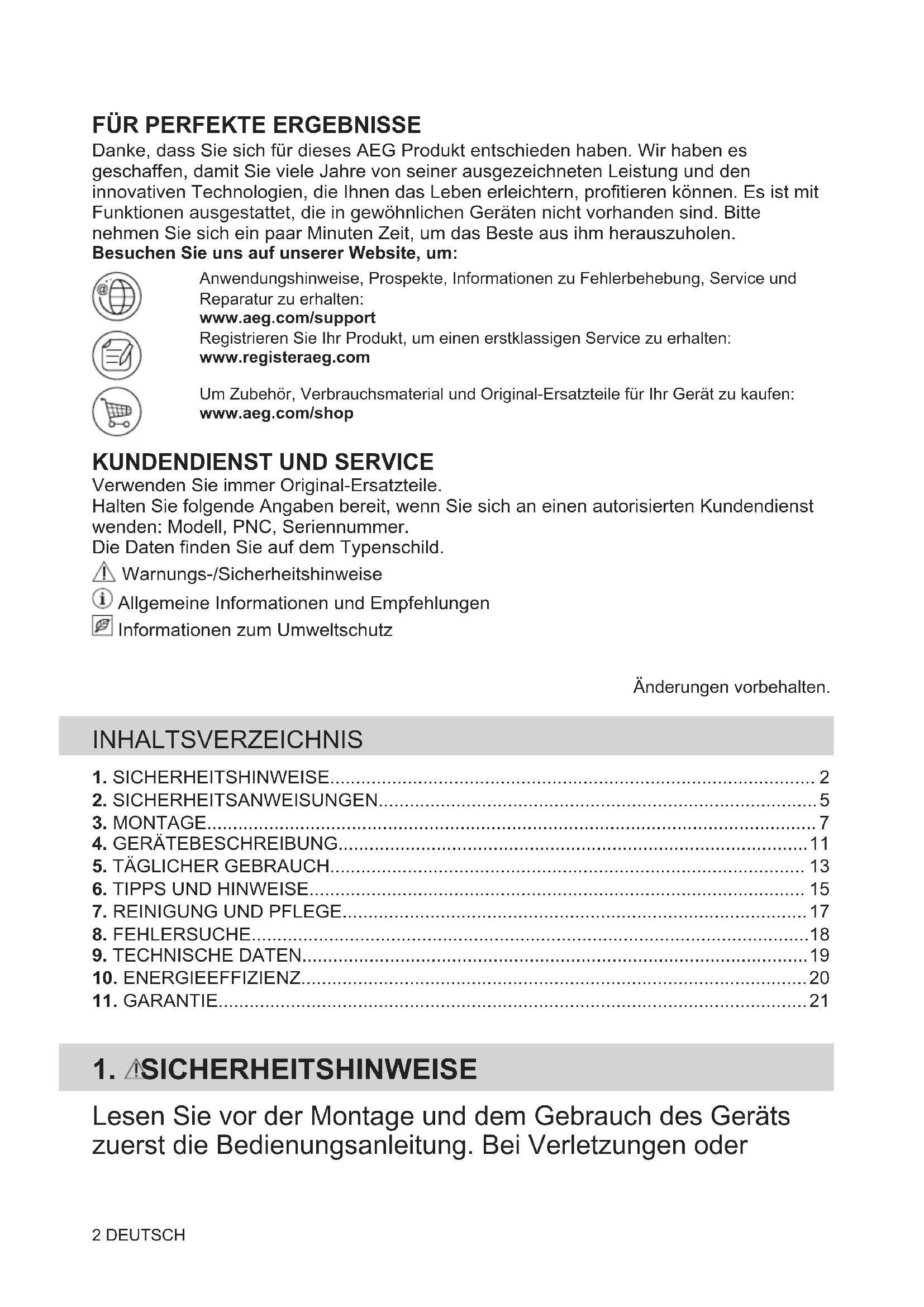 Danke, dass Sie sich für dieses AEG Produkt entschieden haben. Wir haben es geschaffen, damit Sie viele Jahre von seiner ausgezeichneten Leistung und den innovativen Technologien, die Ihnen das Leben erleichtern, profitieren können. Es ist mit Funktionen ausgestattet, die in gewöhnlichen Geräten nicht vorhanden sind. Bitte nehmen Sie sich ein paar Minuten Zeit, um das Beste aus ihm herauszuholen. Besuchen Sie uns auf unserer Website, um:Anwendungshinweise, Prospekte, Informationen zu Fehlerbehebung, Service undReparatur zu erhalten:www.aeg.com/supportRegistrieren Sie Ihr Produkt, um einen erstklassigen Service zu erhalten:www.registeraeg.comUm Zubehör, Verbrauchsmaterial und Original-Ersatzteile für Ihr Gerät zu kaufen:www.aeg.com/shop