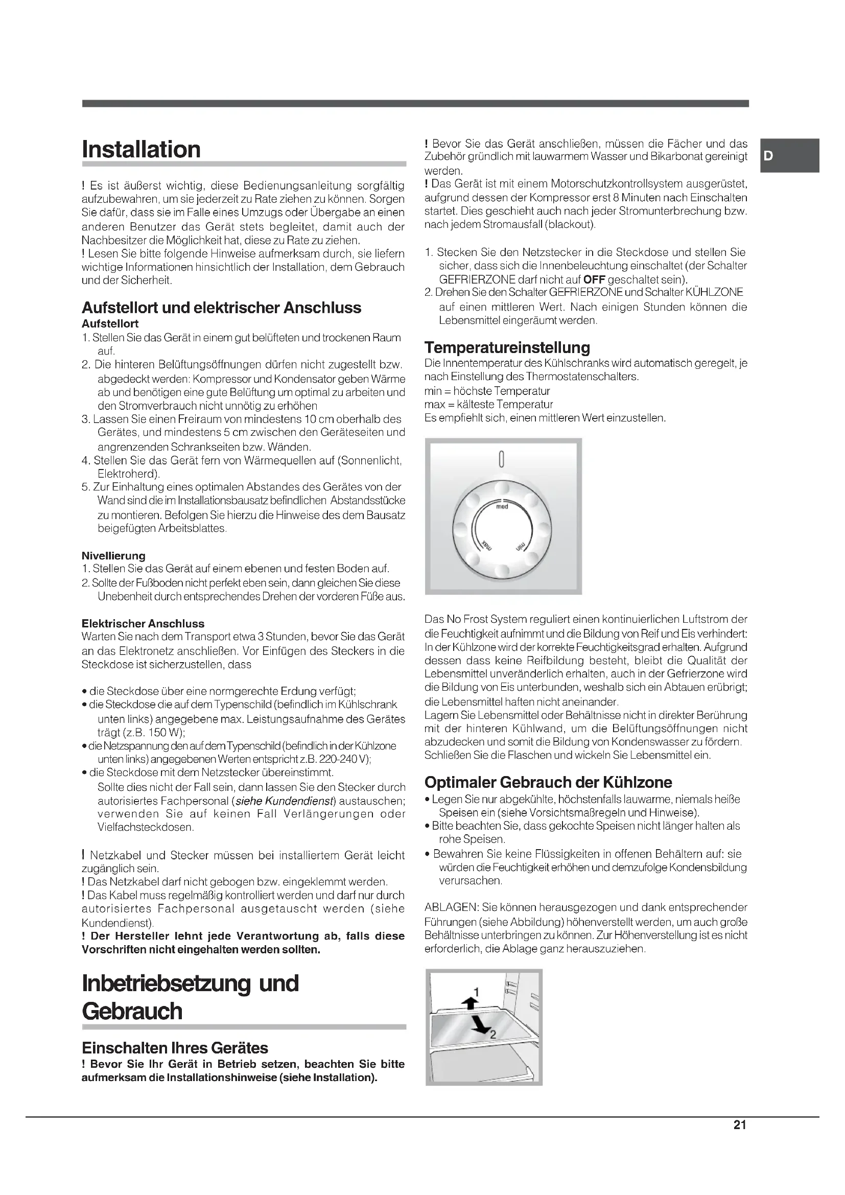 auf einen mittleren Wert. Nach einigen Stunden können die Lebensmittel eingeräumt werden. Temperatureinstellung Die Innentemperatur des Kühlschranks wird automatisch geregelt, je nach Einstellung des Thermostatenschalters. min = höchste Temperatur max = kälteste Temperatur Es empfiehlt sich, einen mittleren Wert einzustellen. Das No Frost System reguliert einen kontinuierlichen Luftstrom der die Feuchtigkeit aufnimmt und die Bildung von Reif und Eis verhindert: In der Kühlzone wird der korrekte Feuchtigkeitsgrad erhalten. Aufgrund dessen dass keine Reifbildung besteht, bleibt die Qualität der Lebensmittel unveränderlich erhalten, auch in der Gefrierzone wird die Bildung von Eis unterbunden, weshalb sich ein Abtauen erübrigt; die Lebensmittel haften nicht aneinander. Lagern Sie Lebensmittel oder Behältnisse nicht in direkter Berührung mit der hinteren Kühlwand, um die Belüftungsöffnungen nicht abzudecken und somit die Bildung von Kondenswasser zu fördern. Schließen Sie die Flaschen und wickeln Sie Lebensmittel ein. Optimaler Gebrauch der Kühlzone