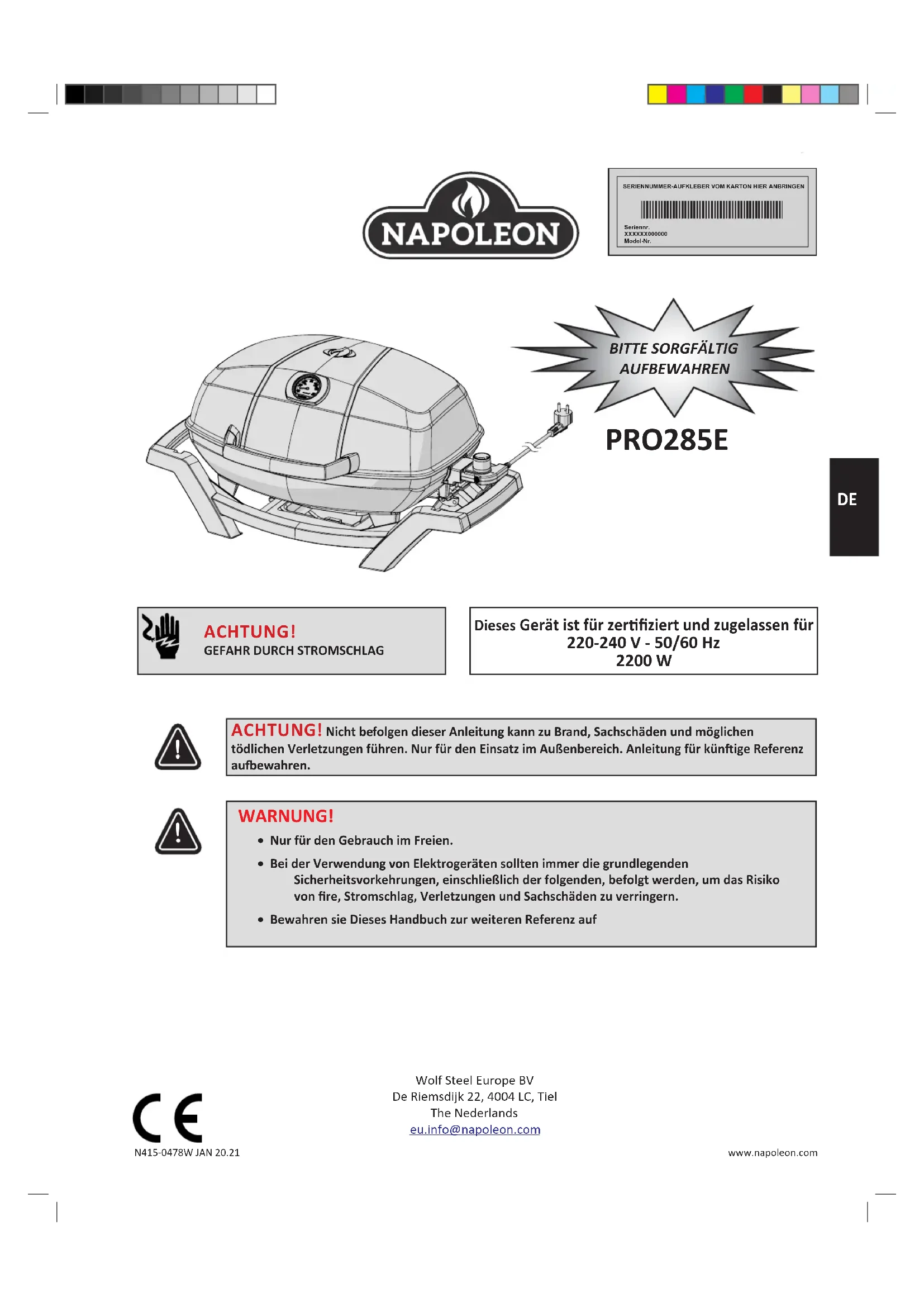 AUFBEWAHREN Wolf Steel Europe BVDe Riemsdijk 22, 4004 LC, TielThe Nederlandseu.info@napoleon.com ACHTUNG! GEFAHR DURCH STROMSCHLAGDieses Gerät ist für zerziert und zugelassen für 220-240 V - 50/60 Hz 2200 W PRO285E ACHTUNG! Nicht befolgen dieser Anleitung kann zu Brand, Sachschäden und möglichen tödlichen Verletzungen führen. Nur für den Einsatz im Außenbereich. Anleitung für künige Referenz auewahren. WARNUNG!