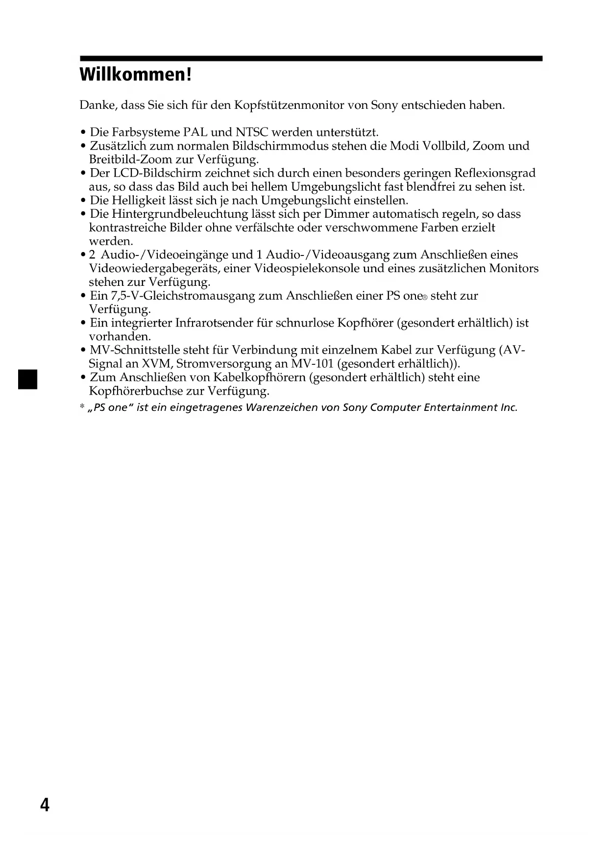 - The fuse has blown. Press the (VOL)(+) or (ATT) on the card remote commander. This may be caused by local interference such as a car engine or motorcycle. Adjust the antennas for minimum interference. The cord has been disconnected. Connect the cord securely. The battery may be exhausted.2 Entsorgung von gebrauchten elektrischen und elektronischen Geräten (anzuwenden in den Ländern der Europäischen Union und anderen europäischen Ländern mit einem separaten Sammelsystem für diese Geräte) Das Symbol auf dem Produkt oder seiner Verpackung weist darauf hin, dass dieses Produkt nicht als normaler Haushaltsabfall zu behandeln ist, sondern an einer Annahmestelle für das Recycling von elektrischen und elektronischen Geräten abgegeben werden muss. Durch Ihren Beitrag zum korrekten Entsorgen dieses Produkts schützen Sie die Umwelt und die Gesundheit Ihrer Mitmenschen. Umwelt und Gesundheit werden durch falsches Entsorgen gefährdet. Materialrecycling hilft, den Verbrauch von Rohstoffen zu verringern. Weitere Informationen über das Recycling dieses Produkts erhalten Sie von Ihrer Gemeinde, den kommunalen Entsorgungsbetrieben oder dem Geschäft, in dem Sie das Produkt gekauft haben. Geeignetes Zubehör: Fernbedienung3 Inhalt Willkommen! ....................................................................................................................... 4 Sicherheitsmaßnahmen ...................................................................................................... 5 Anbringen und Abnehmen des Monitors ....................................................................... 7 Lage und Funktion der Teile und Bedienelemente ........................................................ 8 Betrieb Auswählen der Eingangsquelle ...................................................................................... 10 Einstellen des Bildschirmmodus .................................................................................... 11 Ändern der Anzeigeeinstellungen ................................................................................. 12 Einstellen der Lautstärke ................................................................................................. 14 Anschlüsse Installationsdiagramm ..................................................................................................... 15 Anschlussdiagramm......................................................................................................... 16 Weitere Informationen Wartung .............................................................................................................................. 18 Technische Daten .............................................................................................................. 20 Störungsbehebung ............................................................................................................ 214 Willkommen! Danke, dass Sie sich für den Kopfstützenmonitor von Sony entschieden haben.