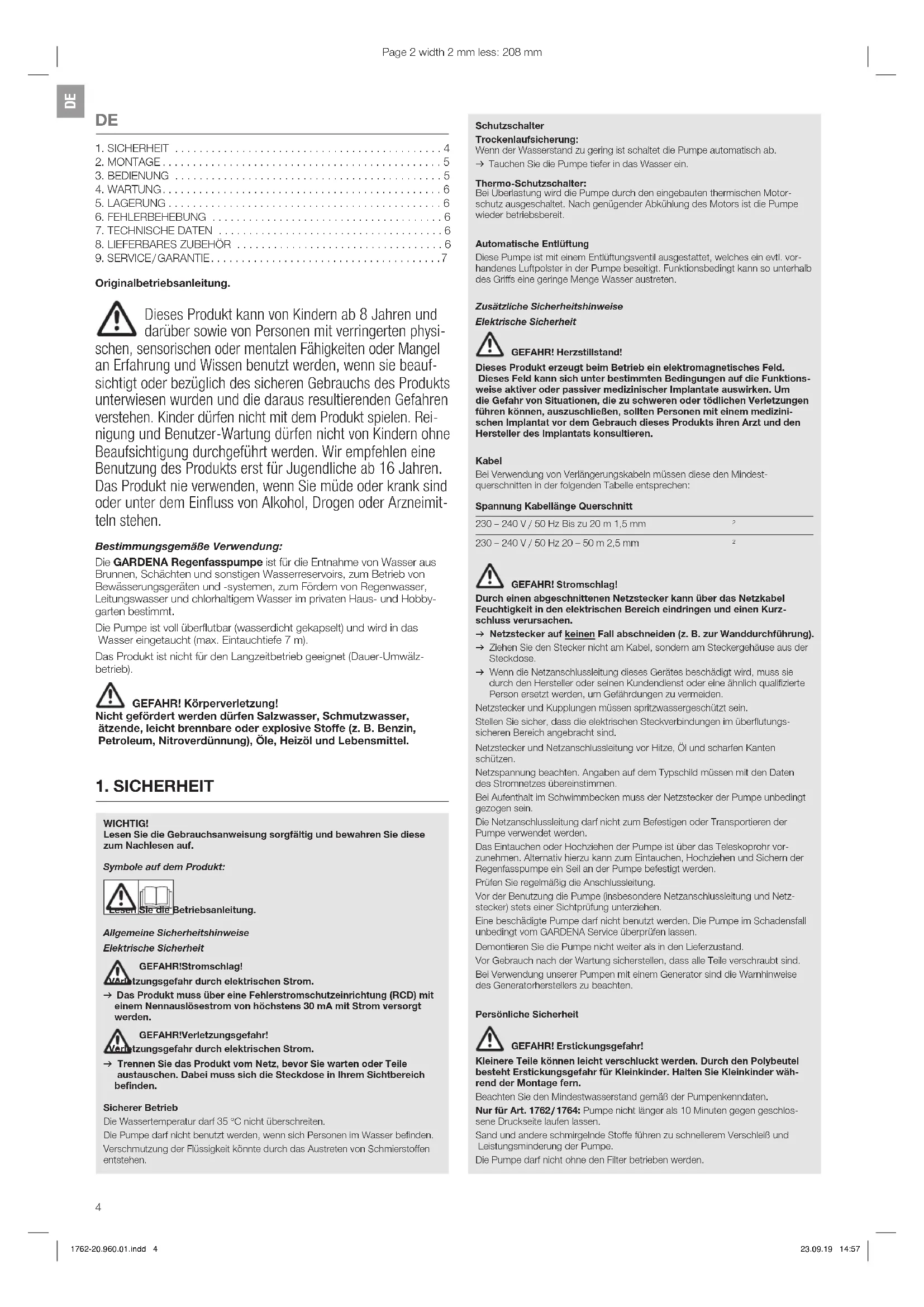 GEFAHR! Stromschlag! Durch einen abgeschnittenen Netzstecker kann über das Netzkabel Feuchtigkeit in den elektrischen Bereich eindringen und einen Kurz- schluss verursachen. v Netzstecker auf keinen Fall abschneiden (z. B. zur Wanddurchführung). v Ziehen Sie den Stecker nicht am Kabel, sondern am Steckergehäuse aus der Steckdose. v Wenn die Netzanschlussleitung dieses Gerätes beschädigt wird, muss sie durch den Hersteller oder seinen Kundendienst oder eine ähnlich qualifizierte Person ersetzt werden, um Gefährdungen zu vermeiden. Netzstecker und Kupplungen müssen spritzwassergeschützt sein. Stellen Sie sicher, dass die elektrischen Steckverbindungen im überflutungs- sicheren Bereich angebracht sind. Netzstecker und Netzanschlussleitung vor Hitze, Öl und scharfen Kanten schützen. Netzspannung beachten. Angaben auf dem Typschild müssen mit den Daten des Stromnetzes übereinstimmen. Bei Aufenthalt im Schwimmbecken muss der Netzstecker der Pumpe unbedingt gezogen sein. Die Netzanschlussleitung darf nicht zum Befestigen oder Transportieren der Pumpe verwendet werden. Das Eintauchen oder Hochziehen der Pumpe ist über das Teleskoprohr vor- zunehmen. Alternativ hierzu kann zum Eintauchen, Hochziehen und Sichern der Regenfasspumpe ein Seil an der Pumpe befestigt werden. Prüfen Sie regelmäßig die Anschlussleitung. Vor der Benutzung die Pumpe (insbesondere Netzanschlussleitung und Netz- stecker) stets einer Sichtprüfung unterziehen. Eine beschädigte Pumpe darf nicht benutzt werden. Die Pumpe im Schadensfall unbedingt vom GARDENA Service überprüfen lassen. Demontieren Sie die Pumpe nicht weiter als in den Lieferzustand. Vor Gebrauch nach der Wartung sicherstellen, dass alle Teile verschraubt sind. Bei Verwendung unserer Pumpen mit einem Generator sind die Warnhinweise des Generatorherstellers zu beachten. Persönliche Sicherheit GEFAHR! Erstickungsgefahr! Kleinere Teile können leicht verschluckt werden. Durch den Polybeutel besteht Erstickungsgefahr für Kleinkinder. Halten Sie Kleinkinder wäh- rend der Montage fern. Beachten Sie den Mindestwasserstand gemäß der Pumpenkenndaten. Nur für Art. 1762 / 1764: Pumpe nicht länger als 10 Minuten gegen geschlos- sene Druckseite laufen lassen. Sand und andere schmirgelnde Stoffe führen zu schnellerem Verschleiß und Leistungsminderung der Pumpe. Die Pumpe darf nicht ohne den Filter betrieben werden. WICHTIG! Lesen Sie die Gebrauchsanweisung sorgfältig und bewahren Sie diese zum Nachlesen auf. Symbole auf dem Produkt: Lesen Sie die Betriebsanleitung. Allgemeine Sicherheitshinweise Elektrische Sicherheit GEFAHR! Stromschlag! Verletzungsgefahr durch elektrischen Strom. v Das Produkt muss über eine Fehlerstromschutzeinrichtung (RCD) mit einem Nennauslösestrom von höchstens 30 mA mit Strom versorgt werden. GEFAHR! Verletzungsgefahr! Verletzungsgefahr durch elektrischen Strom. v Trennen Sie das Produkt vom Netz, bevor Sie warten oder Teile austauschen. Dabei muss sich die Steckdose in Ihrem Sichtbereich befinden. Sicherer Betrieb Die Wassertemperatur darf 35 °C nicht überschreiten. Die Pumpe darf nicht benutzt werden, wenn sich Personen im Wasser befinden. Verschmutzung der Flüssigkeit könnte durch das Austreten von Schmierstoffen entstehen.