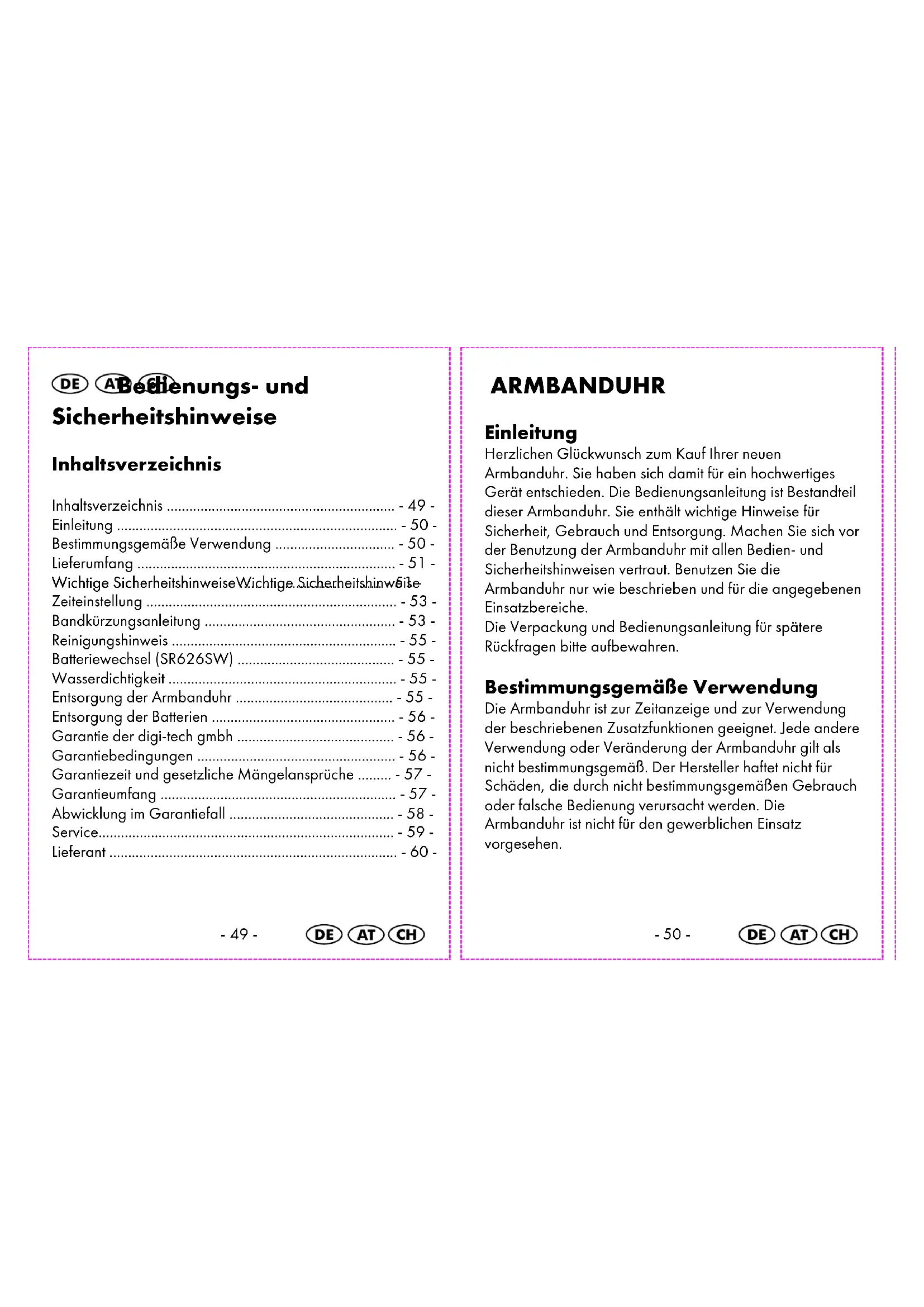 Armbanduhr über einen zugelassenen Entsorgungsbetrieb oder über Ihre kommunale Entsorgungseinrichtung. Beachten Sie die aktuell geltenden Vorschriften. Setzen Sie sich im Zweifelsfall mit Ihrer Entsorgungseinrichtung in Verbindung. Entsorgung der Batterien Bitte entsorgen Sie Ihre Batterien sachgerecht in extra hierfür aufgestellten Gefäßen im Handel. Batterien gehören nicht in den Hausmüll. Entsorgen Sie Batterien bitte über einen zugelassenen Entsorgungsbetrieb oder über Ihre kommunale Entsorgungseinrichtung. Beachten Sie die aktuell geltenden Vorschriften. Setzen Sie sich im Zweifelsfall mit Ihrer Entsorgungseinrichtung in Verbindung. Garantie der digi-tech gmbh Sie erhalten auf diese Armbanduhr 3 Jahre Garantie ab Kaufdatum. Im Falle von Mängeln dieser Armbanduhr stehen Ihnen gegen den Verkäufer des Produkts gesetzliche Rechte zu. Diese gesetzlichen Rechte werden durch unsere im Folgenden dargestellte Garantie nicht eingeschränkt. Garantiebedingungen Die Garantiefrist beginnt mit dem Kaufdatum. Bitte bewahren Sie den originalen Kassenbon gut auf. Diese Unterlage wird als Nachweis für den Kauf benötigt. Tritt innerhalb von drei Jahren ab dem Kaufdatum dieser-