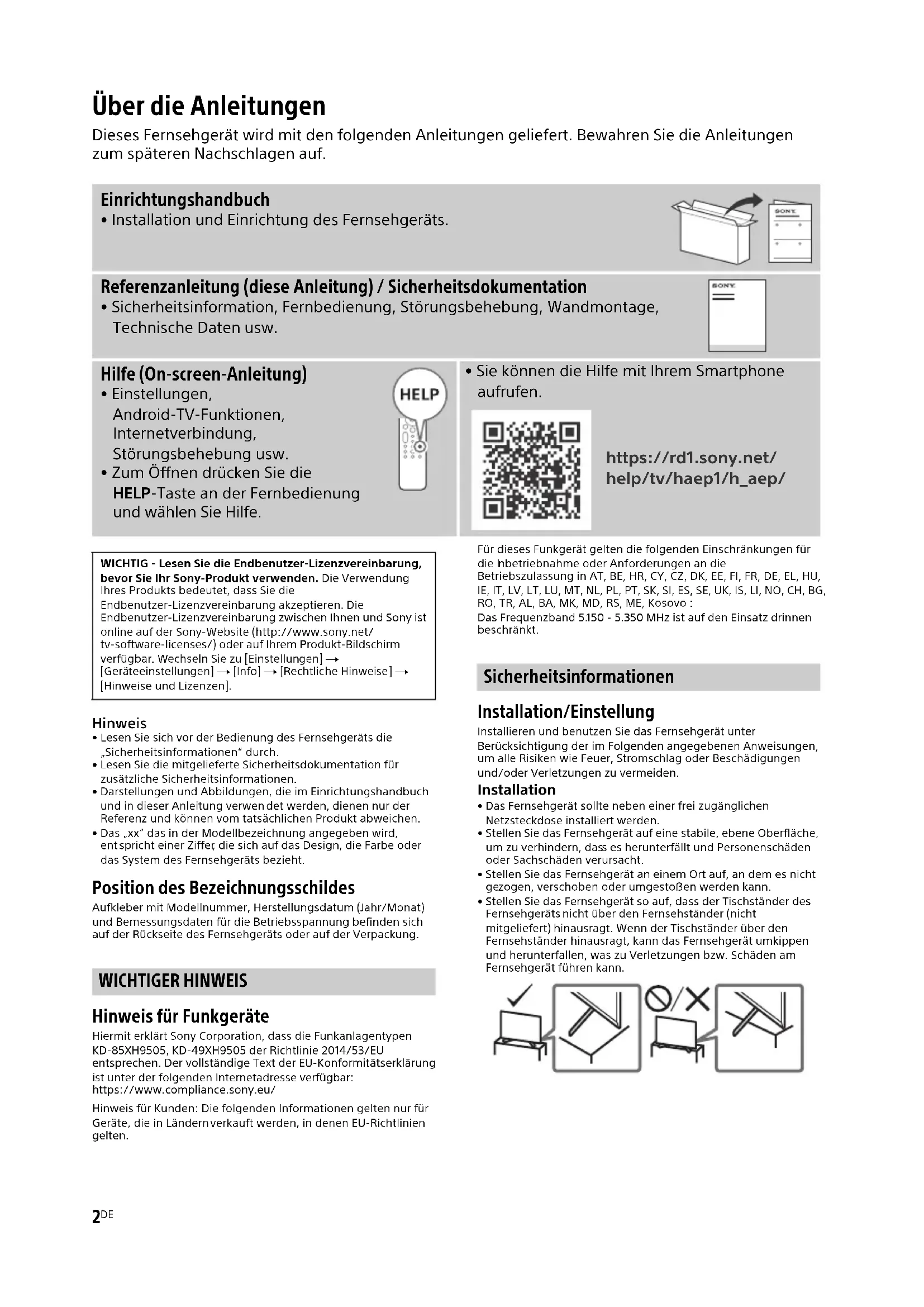 - Lesen Sie sich vor der Bedienung des Fernsehgeräts die „Sicherheitsinformationen“ durch.• Lesen Sie die mitgelieferte Sicherheitsdokumentation für zusätzliche Sicherheitsinformationen.• Darstellungen und Abbildungen, die im Einrichtungshandbuch und in dieser Anleitung verwendet werden, dienen nur der Referenz und können vom tatsächlichen Produkt abweichen.• Das „xx“ das in der Modellbezeichnung angegeben wird, ent spricht einer Ziffer, die sich auf das Design, die Farbe oder das System des Fernsehgeräts bezieht. Position des Bezeichnungsschildes Aufkleber mit Modellnummer, Herstellungsdatum (Jahr/Monat) und Bemessungsdaten für die Betriebsspannung befinden sich auf der Rückseite des Fernsehgeräts oder auf der Verpackung. WICHTIGER HINWEIS Hinweis für Funkgeräte Hiermit erklärt Sony Corporation, dass die Funkanlagentypen KD-85XH9505, KD-49XH9505 der Richtlinie 2014/53/EU entsprechen. Der vollständige Text der EU-Konformitätserklärung ist unter der folgenden Internetadresse verfügbar: https://www.compliance.sony.eu/Hinweis für Kunden: Die folgenden Informationen gelten nur für Geräte, die in Ländern verkauft werden, in denen EU-Richtlinien gelten.Für dieses Funkgerät gelten die folgenden Einschränkungen für die Inbetriebnahme oder Anforderungen an die Betriebszulassung in AT, BE, HR, CY, CZ, DK, EE, FI, FR, DE, EL, HU, IE, IT, LV, LT, LU, MT, NL, PL, PT, SK, SI, ES, SE, UK, IS, LI, NO, CH, BG, RO, TR, AL, BA, MK, MD, RS, ME, Kosovo : Das Frequenzband 5.150 - 5.350 MHz ist auf den Einsatz drinnen beschränkt. Sicherheitsinformationen Installation/Einstellung Installieren und benutzen Sie das Fernsehgerät unter Berücksichtigung der im Folgenden angegebenen Anweisungen, um alle Risiken wie Feuer, Stromschlag oder Beschädigungen und/oder Verletzungen zu vermeiden. Installation