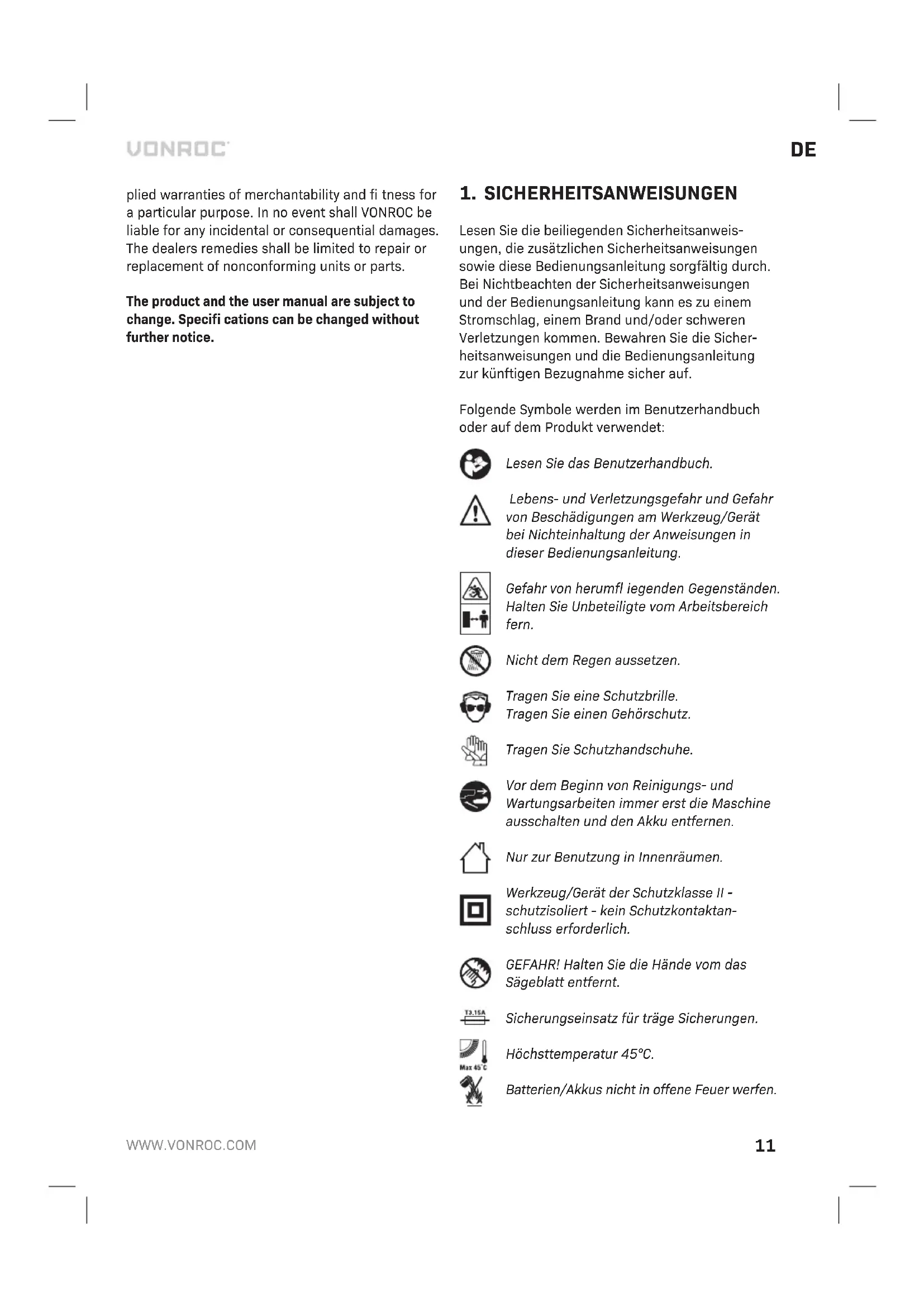 - Es wurden keine Original-Ersatzteile verwendet. Dies stellt die einzige Gewährleistung des Unterneh- mens dar, sowohl ausdrücklich als auch implizit. Es gibt keine anderen ausdrücklichen oder stillsch- weigenden Garantien, die über das hier Genannte hinausgehen, einschließlich der stillschweigenden Garantien der Marktgängigkeit oder Eignung für einen bestimmten Zweck. In keinem Fall ist VONROC haftbar für Neben- oder Folgeschäden. Die Rechts- mittel des Händlers beschränken sich auf Reparatur oder Ersatz fehlerhafter Einheiten oder Teile. Am Produkt und am Benutzerhandbuch können Änderungen vorgenommen werden. Die techni- schen Daten können sich ohne Vorankündigung ändern.20