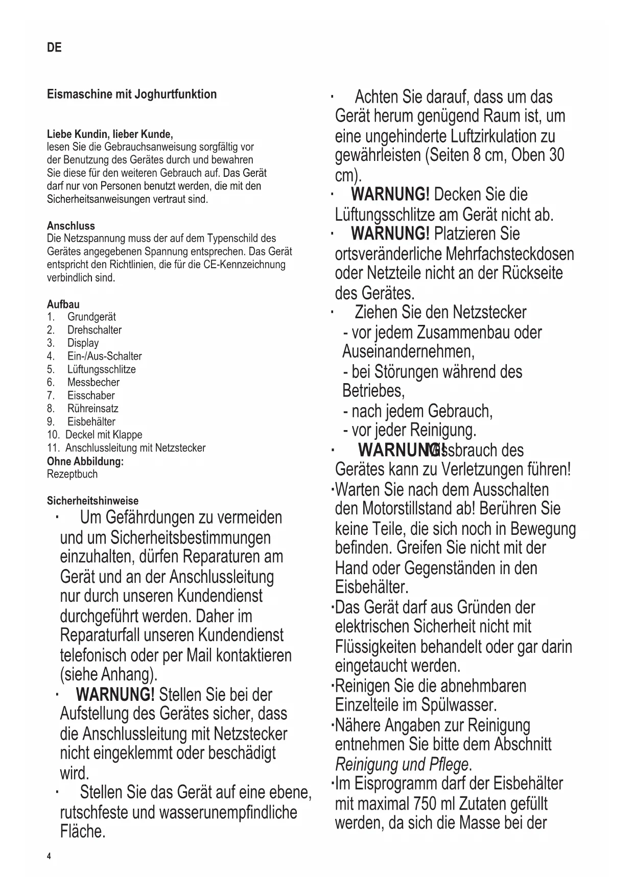 142 x 208 mm Eismaschine mit Joghurtfunktion Liebe Kundin, lieber Kunde, lesen Sie die Gebrauchsanweisung sorgfältig vor der Benutzung des Gerätes durch und bewahren Sie diese für den weiteren Gebrauch auf. Das Gerät darf nur von Personen benutzt werden, die mit den Sicherheitsanweisungen vertraut sind. Anschluss Die Netzspannung muss der auf dem Typenschild des Gerätes angegebenen Spannung entsprechen. Das Gerät entspricht den Richtlinien, die für die CE-Kennzeichnung verbindlich sind. Aufbau