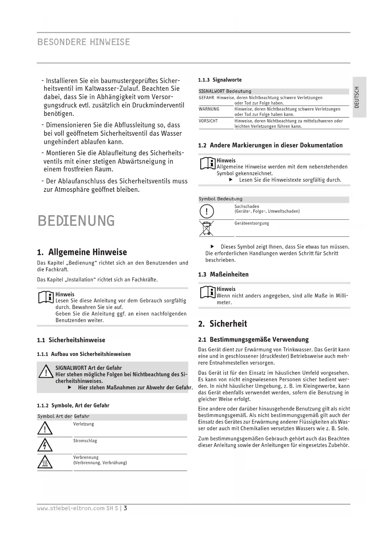 Schnelle Hilfe im Servicefall Einfach den QR-Code scannen oder www.stiebel-eltron.com/registration BESONDERE HINWEISE - Das Gerät kann von Kindern ab 3Jahren sowie von Personen mit verringerten physischen, sen- sorischen oder mentalen Fähigkeiten oder Man- gel an Erfahrung und Wissen benutzt werden, wenn sie beaufsichtigt werden oder bezüglich des sicheren Gebrauchs des Geräts unterwiesen wurden und die daraus resultierenden Gefahren verstanden haben. Kinder im Alter von 3 bis 8 Jahren dürfen nur die am Gerät angeschlossene Armatur bedienen. Kinder dürfen nicht mit dem Gerät spielen. Reinigung und Benutzer-Wartung dürfen nicht von Kindern ohne Beaufsichtigung durchgeführt werden. - Der Anschluss an das Stromnetz ist nur als fester Anschluss in Verbindung mit der herausnehmbaren Kabeldurchführung erlaubt. Das Gerät muss über eine Trennstrecke von min- destens 3mm allpolig vom Netzanschluss ge- trennt werden können. - Befestigen Sie das Gerät wie in den Kapiteln „In- stallation/ Vorbereitungen“ und „Installation/ Montage/ Montage des Gerätes“ beschrieben. - Beachten Sie den minimalen und maximalen Einlasswasserdruck (siehe Kapitel „Installation/ Technische Daten/ Datentabelle). - Entleeren Sie das Gerät wie in Kapitel „Installati- on/ Wartung/ Gerät entleeren“ beschrieben. - Installieren Sie eine Fehlerstrom-Schutzeinrich- tung (RCD). Geschlossene Betriebsweise: - Das Gerät steht unter Druck. Während der Auf- heizung tropft das Ausdehnungswasser aus dem Sicherheitsventil. - Betätigen Sie regelmäßig das Sicherheitsventil, um einem Festsitzen z.B. durch Kalkablagerun- gen vorzubeugen.DEUTSCHwww.stiebel-eltron.com SH S | 3 BESONDERE HINWEISE - Installieren Sie ein baumustergeprüftes Sicher-heitsventil im Kaltwasser-Zulauf. Beachten Sie dabei, dass Sie in Abhängigkeit vom Versor-gungsdruck evtl. zusätzlich ein Druckminderventil benötigen. - Dimensionieren Sie die Abflussleitung so, dass bei voll geöffnetem Sicherheitsventil das Wasser ungehindert ablaufen kann. - Montieren Sie die Ablaufleitung des Sicherheits-ventils mit einer stetigen Abwärtsneigung in einem frostfreien Raum. - Der Ablaufanschluss des Sicherheitsventils muss zur Atmosphäre geöffnet bleiben. BEDIENUNG