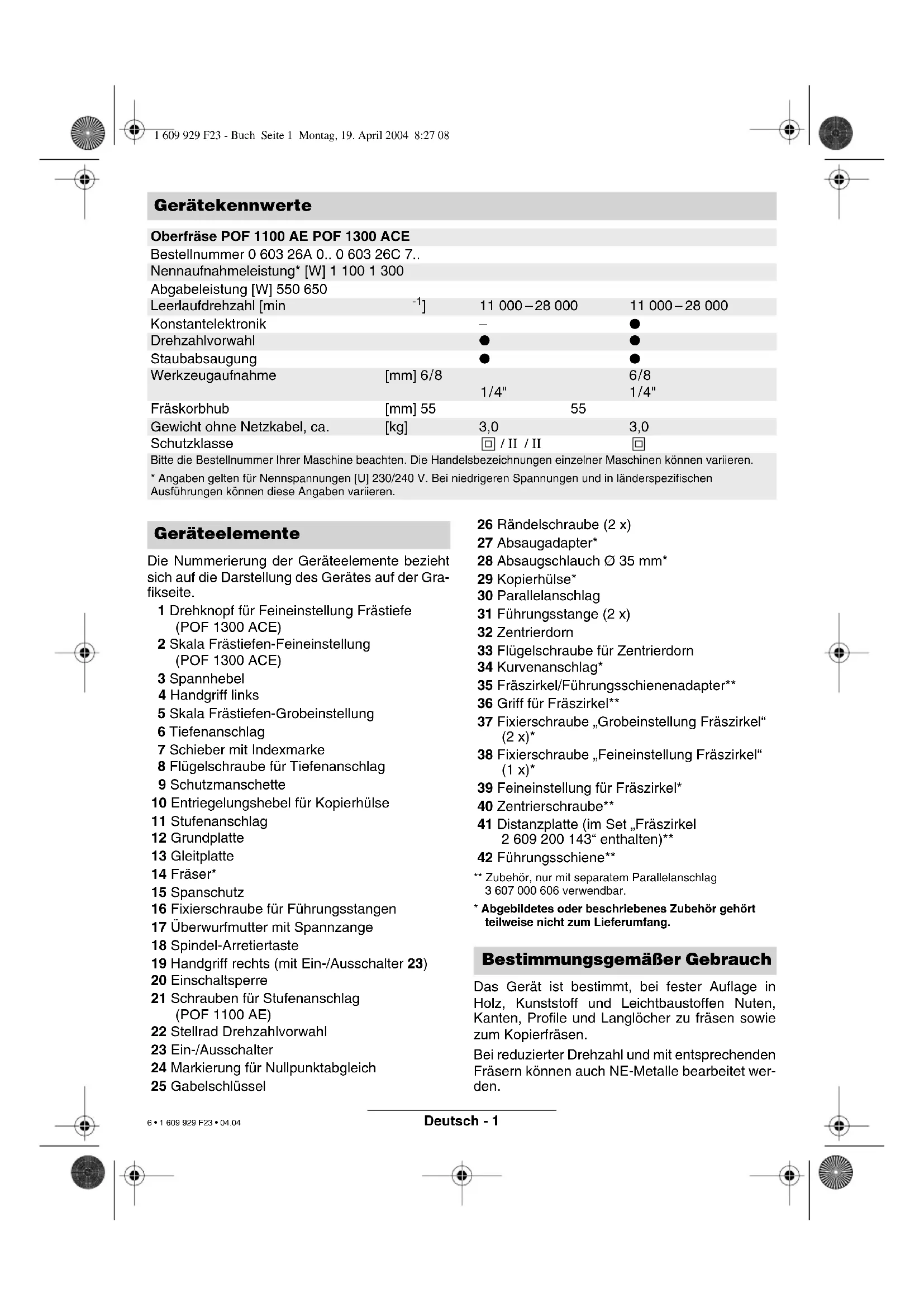 1 609 929 F23 - U5 Seite 5 Montag, 19. April 2004 8:35 08Deutsch - 1 Die Nummerierung der Geräteelemente bezieht sich auf die Darstellung des Gerätes auf der Gra- fikseite. 1 Drehknopf für Feineinstellung Frästiefe (POF 1300 ACE) 2 Skala Frästiefen-Feineinstellung (POF 1300 ACE) 3 Spannhebel 4 Handgriff links 5 Skala Frästiefen-Grobeinstellung 6 Tiefenanschlag 7 Schieber mit Indexmarke 8 Flügelschraube für Tiefenanschlag 9 Schutzmanschette 10 Entriegelungshebel für Kopierhülse 11 Stufenanschlag 12 Grundplatte 13 Gleitplatte 14 Fräser* 15 Spanschutz 16 Fixierschraube für Führungsstangen 17 Überwurfmutter mit Spannzange 18 Spindel-Arretiertaste 19 Handgriff rechts (mit Ein-/Ausschalter 23) 20 Einschaltsperre 21 Schrauben für Stufenanschlag (POF 1100 AE) 22 Stellrad Drehzahlvorwahl 23 Ein-/Ausschalter 24 Markierung für Nullpunktabgleich 25 Gabelschlüssel 26 Rändelschraube (2 x) 27 Absaugadapter* 28 Absaugschlauch Ø 35 mm* 29 Kopierhülse* 30 Parallelanschlag 31 Führungsstange (2 x) 32 Zentrierdorn 33 Flügelschraube für Zentrierdorn 34 Kurvenanschlag* 35 Fräszirkel/Führungsschienenadapter** 36 Griff für Fräszirkel** 37 Fixierschraube „Grobeinstellung Fräszirkel“ (2 x)* 38 Fixierschraube „Feineinstellung Fräszirkel“ (1 x)* 39 Feineinstellung für Fräszirkel* 40 Zentrierschraube** 41 Distanzplatte (im Set „Fräszirkel 2 609 200 143“ enthalten)** 42 Führungsschiene** ** Zubehör, nur mit separatem Parallelanschlag 3 607 000 606 verwendbar.