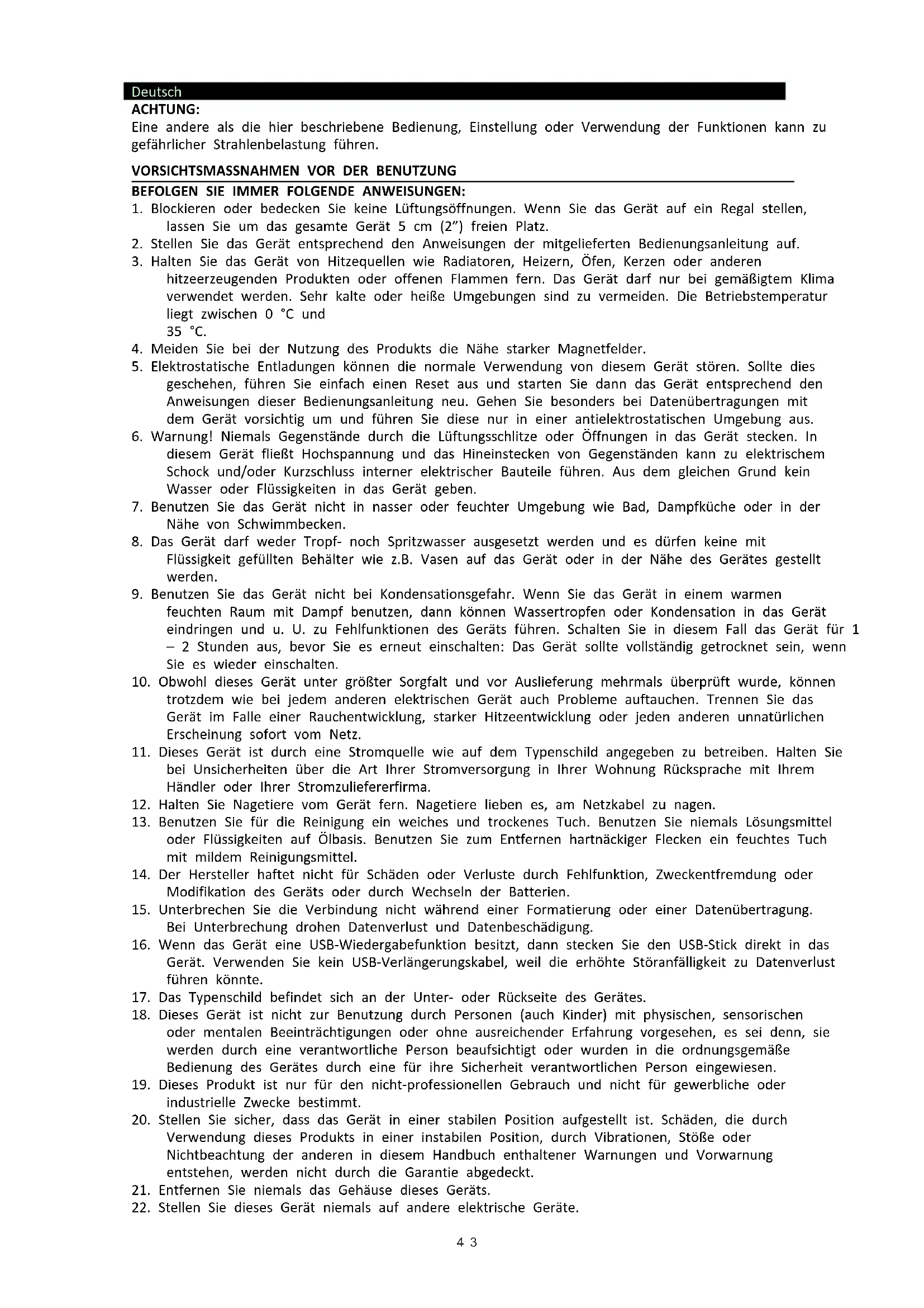 21. Entfernen Sie niemals das Gehäuse dieses Geräts.