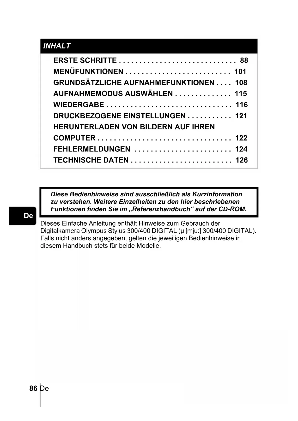 Dieses Einfache Anleitung enthält Hinweise zum Gebrauch der Digitalkamera Olympus Stylus 300/400 DIGITAL (µ [mju:] 300/400 DIGITAL). Falls nicht anders angegeben, gelten die jeweiligen Bedienhinweise in diesem Handbuch stets für beide Modelle. INHALT ERSTE SCHRITTE . . . . . . . . . . . . . . . . . . . . . . . . . . . . . 88 MENÜFUNKTIONEN . . . . . . . . . . . . . . . . . . . . . . . . . . 101