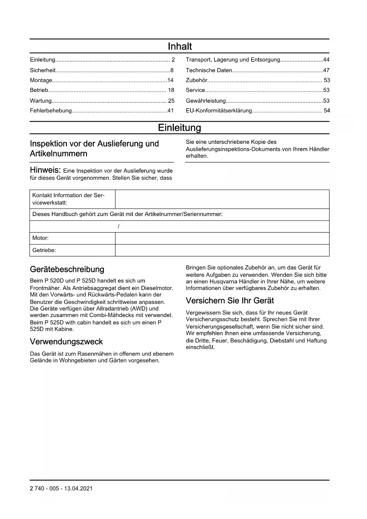 Motor: Getriebe: Gerätebeschreibung Beim P 520D und P 525D handelt es sich um Frontmäher. Als Antriebsaggregat dient ein Dieselmotor. Mit den Vorwärts- und Rückwärts-Pedalen kann der Benutzer die Geschwindigkeit schrittweise anpassen. Die Geräte verfügen über Allradantrieb (AWD) und werden zusammen mit Combi-Mähdecks mit verwendet. Beim P 525D with cabin handelt es sich um einen P 525D mit Kabine. Verwendungszweck Das Gerät ist zum Rasenmähen in offenem und ebenem Gelände in Wohngebieten und Gärten vorgesehen. Bringen Sie optionales Zubehör an, um das Gerät für weitere Aufgaben zu verwenden. Wenden Sie sich bitte an einen Husqvarna Händler in Ihrer Nähe, um weitere Informationen über verfügbares Zubehör zu erhalten. Versichern Sie Ihr Gerät Vergewissern Sie sich, dass für Ihr neues Gerät Versicherungsschutz besteht. Sprechen Sie mit Ihrer Versicherungsgesellschaft, wenn Sie nicht sicher sind. Wir empfehlen Ihnen eine umfassende Versicherung, die Dritte, Feuer, Beschädigung, Diebstahl und Haftung einschließt. 2 740 - 005 - 13.04.2021Produktübersicht