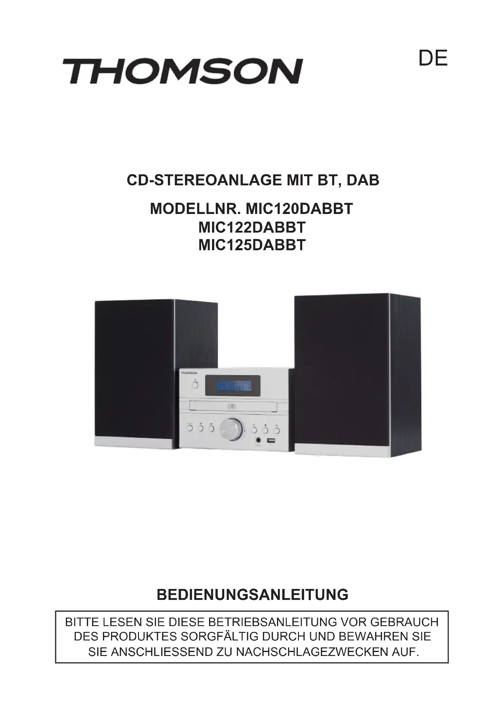 HOTLINE FRANCE, du lundi au vendredi (sauf jours fériés) : 9h00-19h00 ou support.thomson@bigben.fr DEUTSCHLAND, Montag bis Sonntag von 8:00 bis 24:00 Uhr 09001-84 30 44* (0,49€/Min. aus dem deutschen Festnetz, Anrufe aus allen Mobilfunknetzen nicht möglich) oder support@bigben-interactive.de *Minderjährige müssen vorher einen Erziehungsberechtigten um Erlaubnis fragen. BELGIQUE / NEDERLAND, customerservice@bigben-interactive.be klantenservice@bigben-interactive.nl ESPAÑA, sat@bigbeninteractive.es ITALIA, support@bigbeninteractive.itMODELLNR. MIC120DABBT MIC122DABBT MIC125DABBT