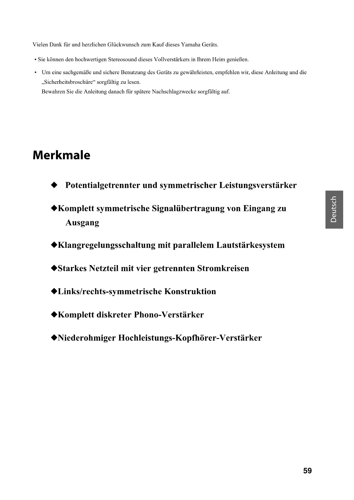 - Je nach Vertriebsgebiet sind möglicherweise mehrere Netzkabel im Lieferumfang enthalten. Verwenden Sie bitte das Kabel, das für die vorliegende Steckdose geeignet ist. Inhalt Merkmale . . . . . . . . . . . . . . . . . . . . . . . . . . . . . . 59 Wissenswertes vor dem Einsatz dieses Geräts. . . . . . . . . . . . . . . . . . . . . . . . . . . . . . . . . . 60 Über diese Anleitung . . . . . . . . . . . . . . . . . . . . . . 60Mitgeliefertes Zubehör . . . . . . . . . . . . . . . . . . . . 60 Bezeichnung und Funktion der Teile . . . . . 61 Frontblende. . . . . . . . . . . . . . . . . . . . . . . . . . . . . . . 62Rückwand. . . . . . . . . . . . . . . . . . . . . . . . . . . . . . . . . 66Fernbedienung. . . . . . . . . . . . . . . . . . . . . . . . . . . . 68Batterien in die Fernbedienung einsetzen. . 70Bedienung der Fernbedienung. . . . . . . . . . . . 70 Verbindungen . . . . . . . . . . . . . . . . . . . . . . . . . . 71 Verbindungsdiagramm . . . . . . . . . . . . . . . . . . . . 72Anschließen der Lautsprecher. . . . . . . . . . . . . . 74Lautsprecherkabel einsetzen. . . . . . . . . . . . . . 74Kabel mit Bananensteckern einsetzen . . . . . 75Kabel mit Gabelkabelschuhen einsetzen. . . 75Doppelverdrahtung (Bi-Wiring) . . . . . . . . . . . . .75Symmetrische Verbindung. . . . . . . . . . . . . . . . . .76Trigger-Verbindung . . . . . . . . . . . . . . . . . . . . . . . .76Remote-Verbindung. . . . . . . . . . . . . . . . . . . . . . . .77Bedienung des Geräts aus einem anderen Raum . . . . . . . . . . . . . . . . . . . . . . . . . . . .77Remote-Verbindung zwischen Yamaha Geräten . . . . . . . . . . . . . . . . . . . . . . . . . .77Netzkabel anschließen. . . . . . . . . . . . . . . . . . . . . .78 Anhang . . . . . . . . . . . . . . . . . . . . . . . . . . . . . . . . .79 Technische Daten . . . . . . . . . . . . . . . . . . . . . . . . . .80Blockdiagramm . . . . . . . . . . . . . . . . . . . . . . . . . . . .82Akustische Eigenschaften. . . . . . . . . . . . . . . . . . .83Klangregler-Charakteristik. . . . . . . . . . . . . . . . .83Gesamte harmonische Verzerrung . . . . . . . . .83Gesamte harmonische Verzerrung (PHONO). . . . . . . . . . . . . . . . . . . . . . . . . . . . . . . . . .84Störungsbeseitigung . . . . . . . . . . . . . . . . . . . . . . .85Pflege . . . . . . . . . . . . . . . . . . . . . . . . . . . . . . . . . . . . .86 HinweisDeutsch
