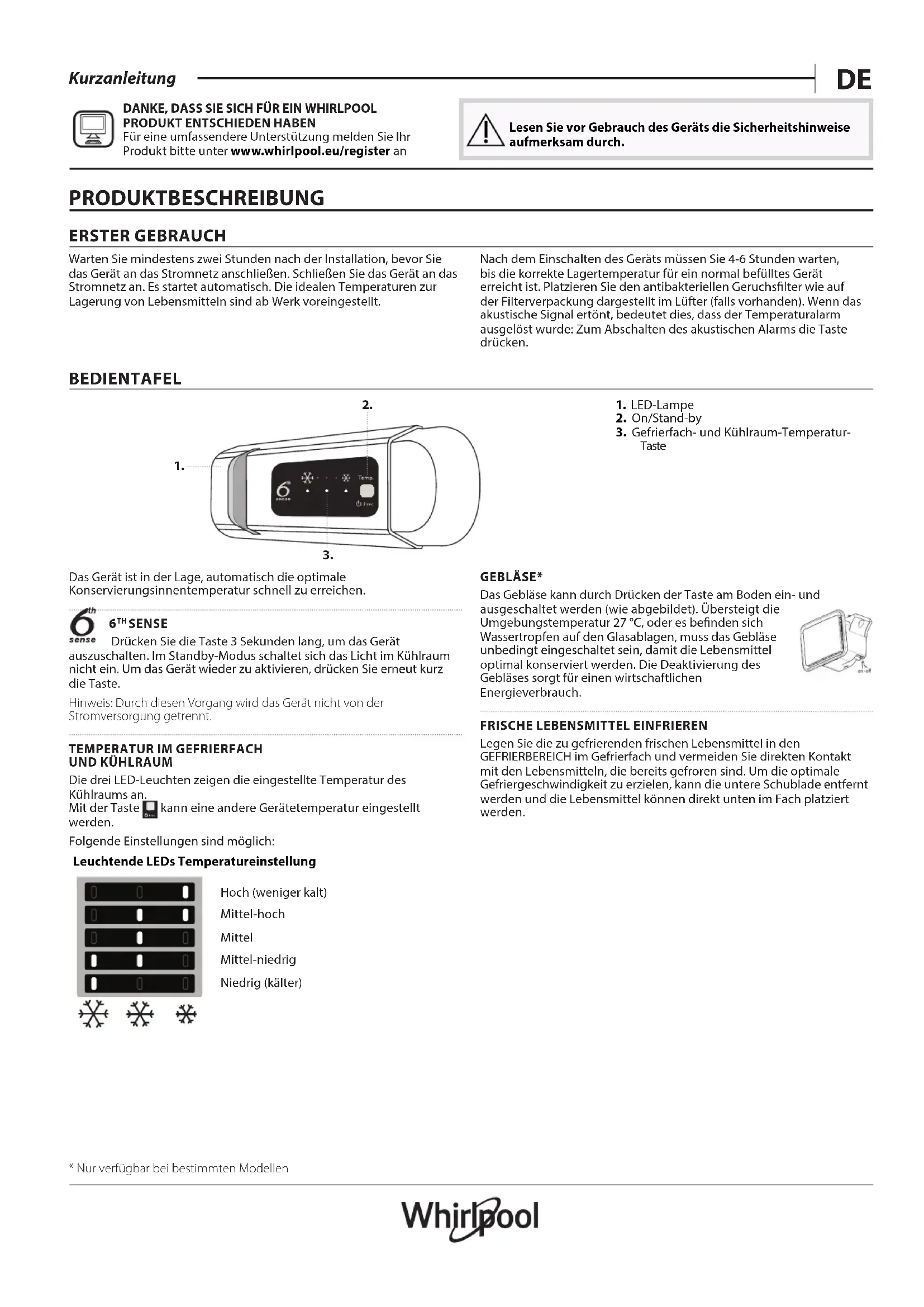 Für eine umfassendere Unterstützung melden Sie Ihr Produkt bitte unter www . whirlpool . eu / register an Lesen Sie vor Gebrauch des Geräts die Sicherheitshinweise aufmerksam durch. PRODUKTBESCHREIBUNG ERSTER GEBRAUCH Warten Sie mindestens zwei Stunden nach der Installation, bevor Sie das Gerät an das Stromnetz anschließen. Schließen Sie das Gerät an das Stromnetz an. Es startet automatisch. Die idealen Temperaturen zur Lagerung von Lebensmitteln sind ab Werk voreingestellt. Nach dem Einschalten des Geräts müssen Sie 4-6Stunden warten, bis die korrekte Lagertemperatur für ein normal befülltes Gerät erreicht ist. Platzieren Sie den antibakteriellen Geruchslter wie auf der Filterverpackung dargestellt im Lüfter (falls vorhanden). Wenn das akustische Signal ertönt, bedeutet dies, dass der Temperaturalarm ausgelöst wurde: Zum Abschalten des akustischen Alarms die Taste drücken. BEDIENTAFEL