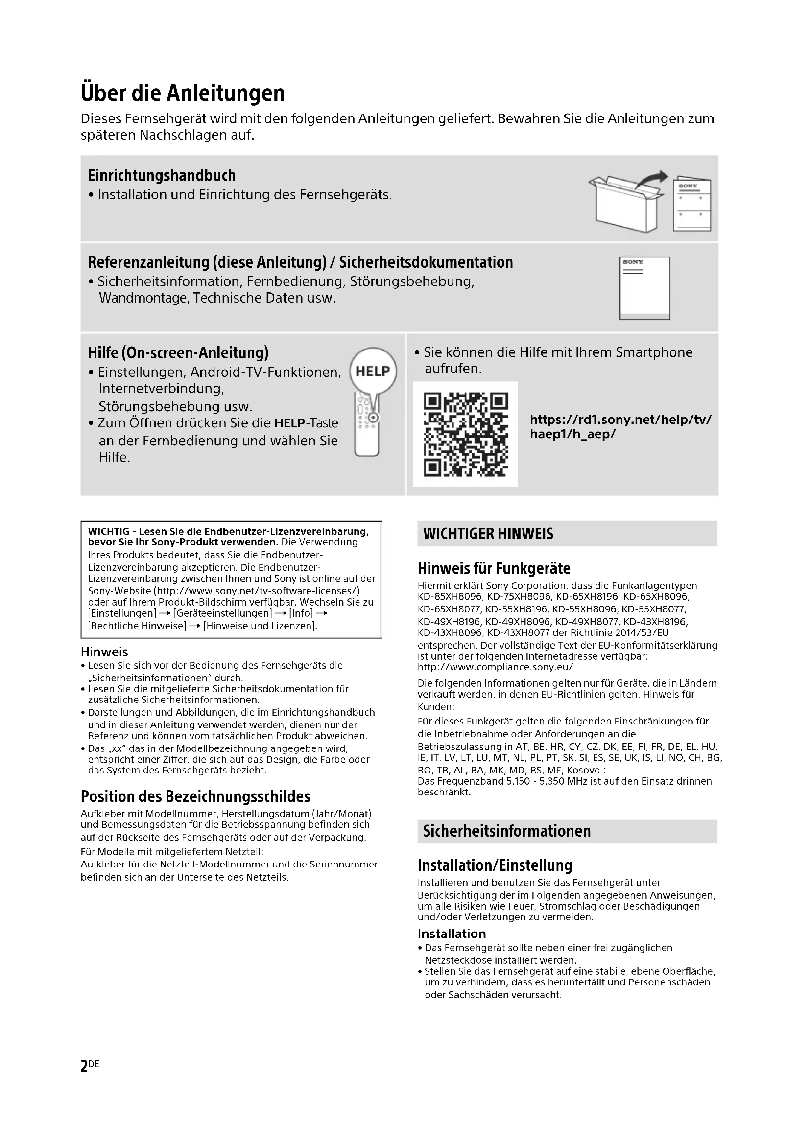 - Sie können die Hilfe mit Ihrem Smartphone aufrufen. https://rd1.sony.net/help/tv/ haep1/h_aep/ WICHTIG - Lesen Sie die Endbenutzer-Lizenzvereinbarung, bevor Sie Ihr Sony-Produkt verwenden. Die Verwendung Ihres Produkts bedeutet, dass Sie die Endbenutzer- Lizenzvereinbarung akzeptieren. Die Endbenutzer- Lizenzvereinbarung zwischen Ihnen und Sony ist online auf der Sony-Website (http://www.sony.net/tv-software-licenses/) oder auf Ihrem Produkt-Bildschirm verfügbar. Wechseln Sie zu [Einstellungen] [Geräteeinstellungen] [Info] [Rechtliche Hinweise] [Hinweise und Lizenzen]. WICHTIGER HINWEIS Sicherheitsinformationen3