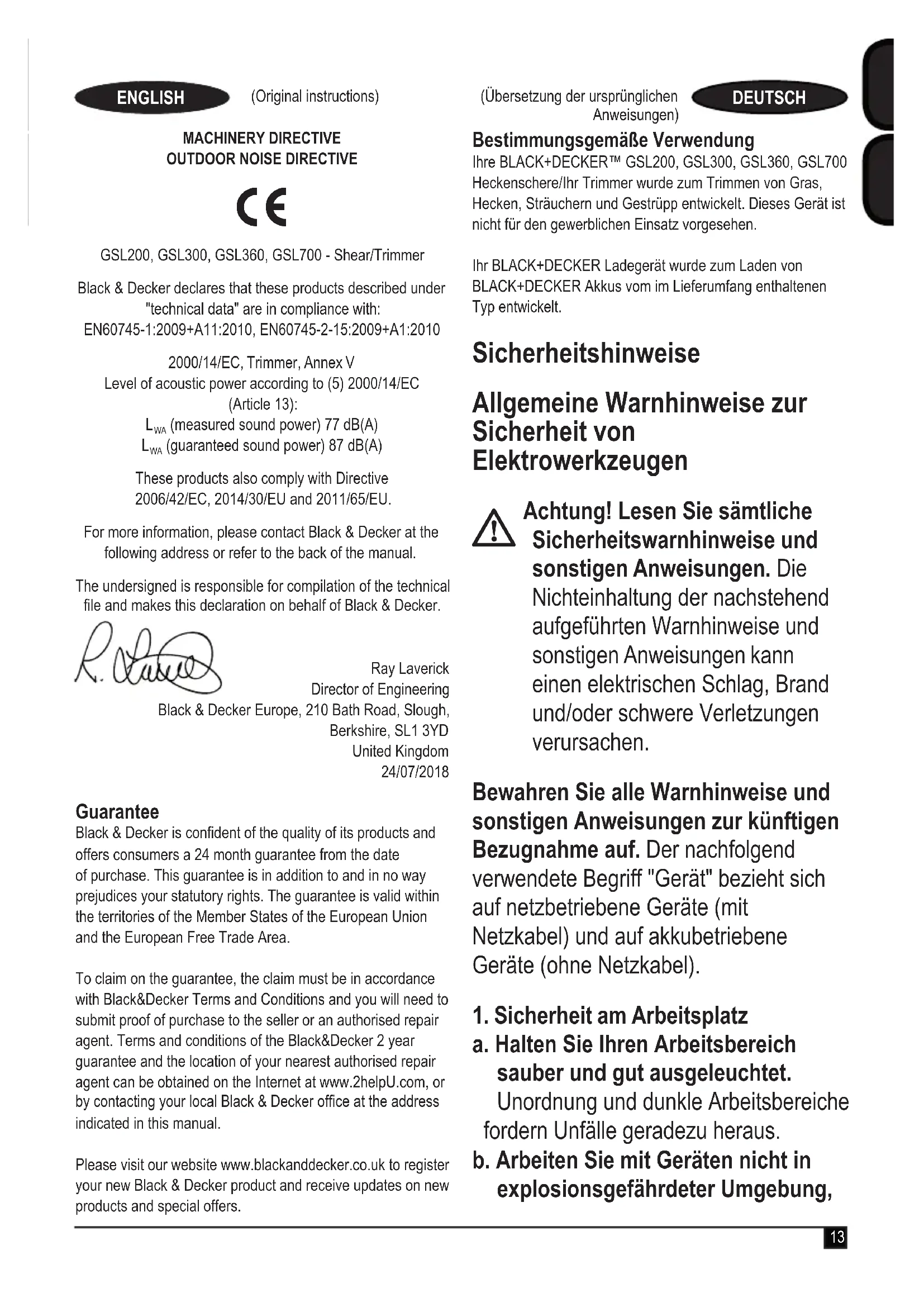 (garantierte Schalleistung) 87 dB(A) Diese Produkte entsprechen außerdem den Richtlinien 2006/42/EC, 2014/30/EU and 2011/65/EU. Weitere Informationen erhalten Sie von Black & Decker unter der folgenden Adresse. Diese bendet sich auch auf der Rückseite dieser Anleitung. Der Unterzeichnete ist für die Zusammenstellung der technischen Datei verantwortlich und gibt diese Erklärung im Namen von Black & Decker ab. Ray Laverick Director of Engineering Black & Decker Europe, 210 Bath Road, Slough, Berkshire, SL1 3YD Vereinigtes Königreich 24/07/2018 Garantie Black & Decker vertraut auf die Qualität der eigenen Geräte und bietet dem Käufer eine außergewöhnliche Garantie von 24 Monaten ab Kaufdatum. Diese Garantie versteht sich unbeschadet der gesetzlichen Gewährleistungsansprüche und schränkt diese keinesfalls ein. Diese Garantie gilt innerhalb der Staatsgebiete der Mitgliedstaaten der Europäischen Union und der Europäischen Freihandelszone. Zur Inanspruchnahme dieser Garantie muss sie den allgemeinen Geschäftsbedingungen von Black&Decker entsprechen und dem Verkäufer bzw. der Vertragswerkstatt ist ein Kaufnachweis vorzulegen. Die Bedingungen für die 2-jährige Garantie von Black&Decker und den Standort Ihrer nächstgelegenen Vertragswerkstatt nden Sie im Internet unter www.2helpU.com oder indem Sie sich an die lokale Black&Decker-Niederlassung wenden, deren Adresse Sie in dieser Anleitung nden. Ihr neues Black & Decker Produkt können Sie auf unserer Website unter www.blackanddecker.de registrieren. Dort erhalten Sie auch Informationen über neue Produkte und Sonderangebote.25 (Traduction des instructions originales) FRANÇAIS Utilisation prévue Votre cisaille/taille-haie BLACK+DECKER™ GSL200, GSL300, GSL360, GSL700 a été conçue pour tailler la pelouse, les haies, les buissons et les ronces. Cet outil est prévu pour un usage grand public uniquement.Votre chargeur BLACK+DECKER a été conçu pour le chargement de batteries BLACK+DECKER identiques à celles fournies avec cet outil. Instructions de sécurité Consignes de sécurité générales pour les outils électriques