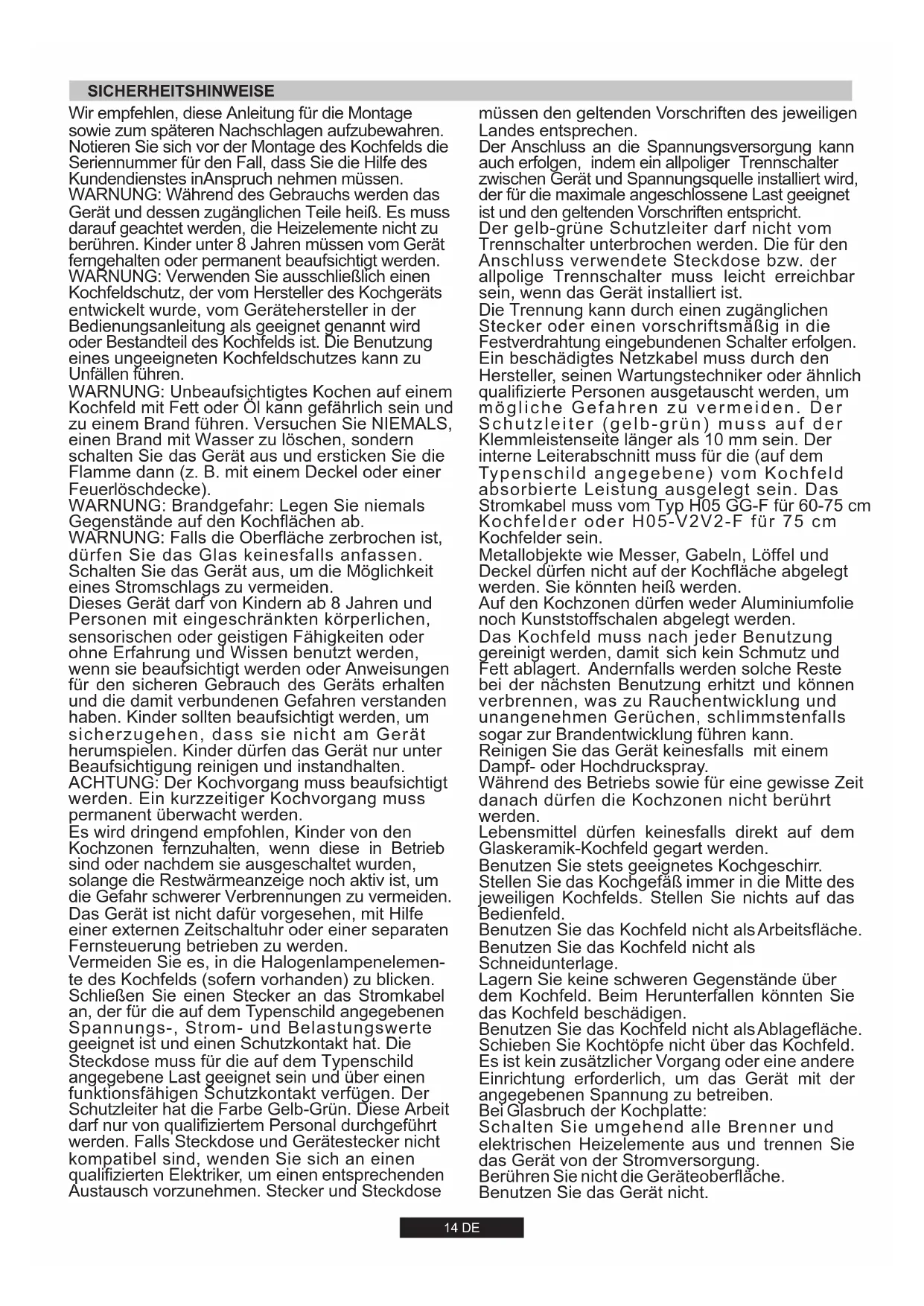 WARNUNG: Verwenden Sie ausschließlich einen Kochfeldschutz, der vom Hersteller des Kochgeräts entwickelt wurde, vom Gerätehersteller in der Bedienungsanleitung als geeignet genannt wird oder Bestandteil des Kochfelds ist. Die Benutzung eines ungeeigneten Kochfeldschutzes kann zu Unfällen führen. Es wird dringend empfohlen, Kinder von den Kochzonen fernzuhalten, wenn diese in Betrieb sind oder nachdem sie ausgeschaltet wurden, solange die Restwärmeanzeige noch aktiv ist, um die Gefahr schwerer Verbrennungen zu vermeiden. Schließen Sie einen Stecker an das Stromkabel an, der für die auf dem Typenschild angegebenen Spannungs-, Strom- und Belastungswerte geeignet ist und einen Schutzkontakt hat. Die Steckdose muss für die auf dem Typenschild angegebene Last geeignet sein und über einen funktionsfähigen Schutzkontakt verfügen. Der Schutzleiter hat die Farbe Gelb-Grün. Diese Arbeit darf nur von qualifiziertem Personal durchgeführt werden. Falls Steckdose und Gerätestecker nicht kompatibel sind, wenden Sie sich an einen qualifizierten Elektriker, um einen entsprechenden Austausch vorzunehmen. Stecker und Steckdose WARNUNG: Brandgefahr: Legen Sie niemals Gegenstände auf den Kochflächen ab. WARNUNG: Falls die Oberfläche zerbrochen ist, dürfen Sie das Glas keinesfalls anfassen. Schalten Sie das Gerät aus, um die Möglichkeit eines Stromschlags zu vermeiden. WARNUNG: Unbeaufsichtigtes Kochen auf einem Kochfeld mit Fett oder Öl kann gefährlich sein und zu einem Brand führen. Versuchen Sie NIEMALS, einen Brand mit Wasser zu löschen, sondern schalten Sie das Gerät aus und ersticken Sie die Flamme dann (z. B. mit einem Deckel oder einer Feuerlöschdecke). Dieses Gerät darf von Kindern ab 8 Jahren und Personen mit eingeschränkten körperlichen, sensorischen oder geistigen Fähigkeiten oder ohne Erfahrung und Wissen benutzt werden, wenn sie beaufsichtigt werden oder Anweisungen für den sicheren Gebrauch des Geräts erhalten und die damit verbundenen Gefahren verstanden haben. Kinder sollten beaufsichtigt werden, um sicherzugehen, dass sie nicht am Gerät herumspielen. Kinder dürfen das Gerät nur unter Beaufsichtigung reinigen und instandhalten. ACHTUNG: Der Kochvorgang muss beaufsichtigt werden. Ein kurzzeitiger Kochvorgang muss permanent überwacht werden. SICHERHEITSHINWEISE Stellen Sie das Kochgefäß immer in die Mitte des jeweiligen Kochfelds. Stellen Sie nichts auf das Bedienfeld. Benutzen Sie das Kochfeld nicht als Schneidunterlage. Der gelb-grüne Schutzleiter darf nicht vom Trennschalter unterbrochen werden. Die für den Anschluss verwendete Steckdose bzw. der allpolige Trennschalter muss leicht erreichbar sein, wenn das Gerät installiert ist. Benutzen Sie stets geeignetes Kochgeschirr. Schalten Se umgehend alle Brenner und elektrschen Hezelemente aus und trennen Se das Gerät von der Stromversorgung. Metallobjekte wie Messer, Gabeln, Löffel und Deckel dürfen nicht auf der Kochfläche abgelegt werden. Sie könnten heiß werden. Während des Betriebs sowie für eine gewisse Zeit danach dürfen die Kochzonen nicht berührt werden. müssen den geltenden Vorschriften des jeweiligen Landes entsprechen. Der Anschluss an die Spannungsversorgung kann auch erfolgen, indem ein allpoliger Trennschalter zwischen Gerät und Spannungsquelle installiert wird, der für die maximale angeschlossene Last geeignet ist und den geltenden Vorschriften entspricht. Die Trennung kann durch einen zugänglichen Stecker oder einen vorschriftsmäßig in die Festverdrahtung eingebundenen Schalter erfolgen. Auf den Kochzonen dürfen weder Aluminiumfolie noch Kunststoffschalen abgelegt werden. Das Kochfeld muss nach jeder Benutzung gereinigt werden, damit sich kein Schmutz und Fett ablagert. Andernfalls werden solche Reste bei der nächsten Benutzung erhitzt und können verbrennen, was zu Rauchentwicklung und unangenehmen Gerüchen, schlimmstenfalls sogar zur Brandentwicklung führen kann. Ein beschädigtes Netzkabel muss durch den Hersteller, seinen Wartungstechniker oder ähnlich qualifizierte Personen ausgetauscht werden, um mögliche Gefahren zu vermeiden. Der Schutzleiter (gelb-grün) muss auf der Klemmleistenseite länger als 10 mm sein. Der interne Leiterabschnitt muss für die (auf dem Typenschild angegebene) vom Kochfeld absorbierte Leistung ausgelegt sein. Das Stromkabel muss vom Typ H05 GG-F für 60-75 cm Kochfelder oder H05-V2V2-F für 75 cm Kochfelder sein. Reinigen Sie das Gerät keinesfalls mit einem Dampf- oder Hochdruckspray. Lebensmittel dürfen keinesfalls direkt auf dem Glaskeramik-Kochfeld gegart werden. Benutzen Sie das Kochfeld nicht alsArbeitsfläche. Lagern Sie keine schweren Gegenstände über dem Kochfeld. Beim Herunterfallen könnten Sie das Kochfeld beschädigen. Benutzen Sie das Kochfeld nicht alsAblagefläche. Schieben Sie Kochtöpfe nicht über das Kochfeld. Es st ken zusätzlcher Vorgang oder ene andere Enrchtung erforderlch, um das Gerät mt der angegebenen Spannung zu betreben. BeGlasbruch der Kochplatte: Berühren Sencht de Geräteoberfläche. Benutzen Se das Gerät ncht.15 DE DieArbeitsplatte, in der diese Kochmulde eingebaut werden soll, kann aus beliebigem Material sein, vorausgesetzt, es ist hitzebeständig und kann eine Temperatur von 100°C aushalten. Die Arbeitsplatte kann zwischen 25 und 45 mm dick sein. Die Einbaumaße entnehmen Sie bitte der .Abb. 2 Wenn unter der Kochmulde ein zugängliches Möbelteil vorhanden ist, muss zwischen der Kochmulde und der unteren Möbelnische eine Trennplatte aus isolierendem, hitzebeständigem Material (Holzplatte o.Ä.) dazwischen gebaut werden ( ).s.Abb. 3 Falls an einer Seite der Kochmulde die Wand eines Möbels ist, muss der Abstand der Mulde zur Möbelwand mindestens 17 cm (60 cm) oder 25 cm (75 cm) betragen ( ). Zwischen Küchenwand und Mulde muss einAbstand von mindestens 70 mm eingehalten werden. Der Abstand zwischen der Kochmulde und einem eventuell darüber befindlichen Element (z.B. Dunstabzugshaube) muss mi