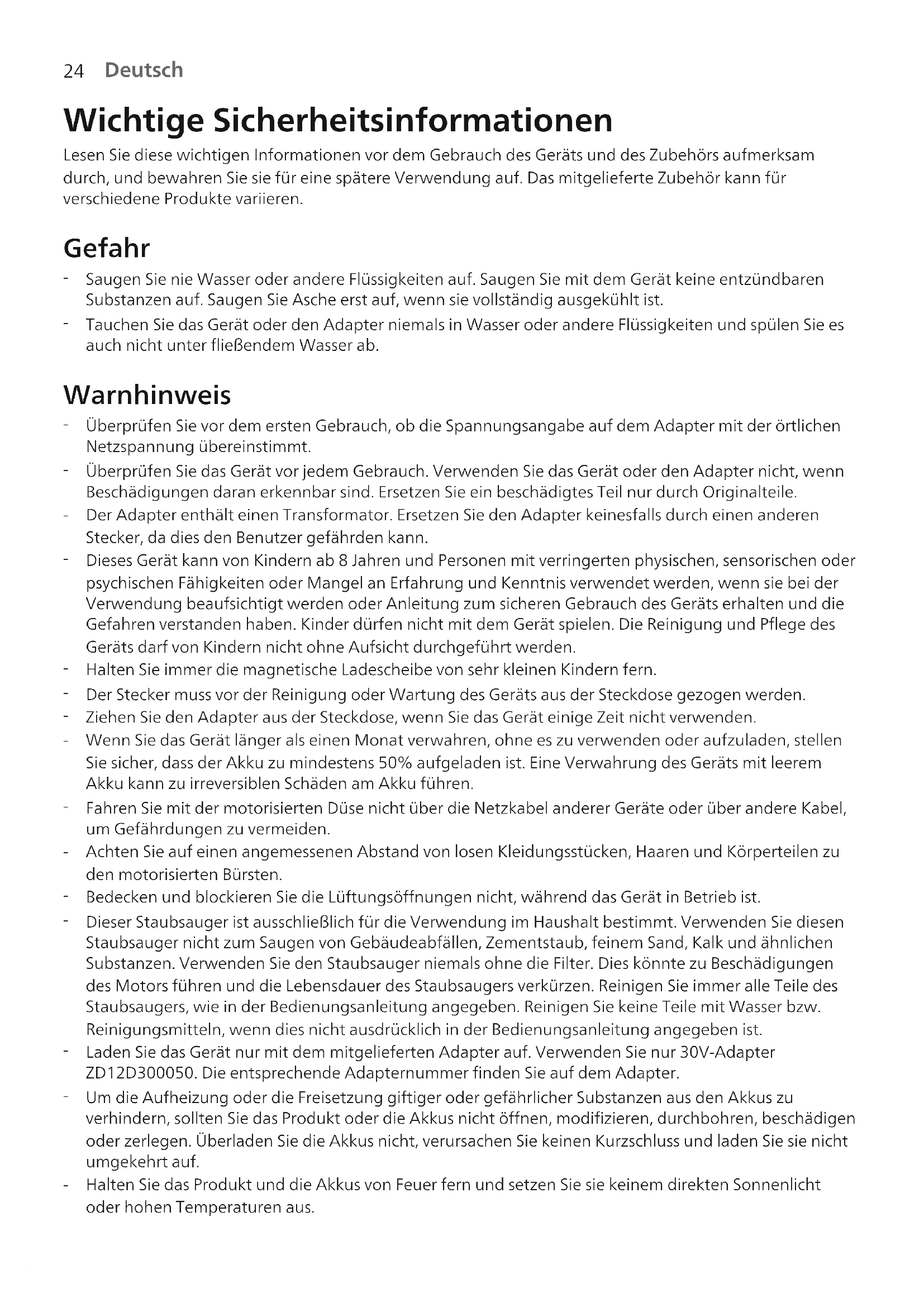 Laden Sie das Gerät nur mit dem mitgelieferten Adapter auf. Verwenden Sie nur 30V-Adapter ZD12D300050. Die entsprechende Adapternummer finden Sie auf dem Adapter.
