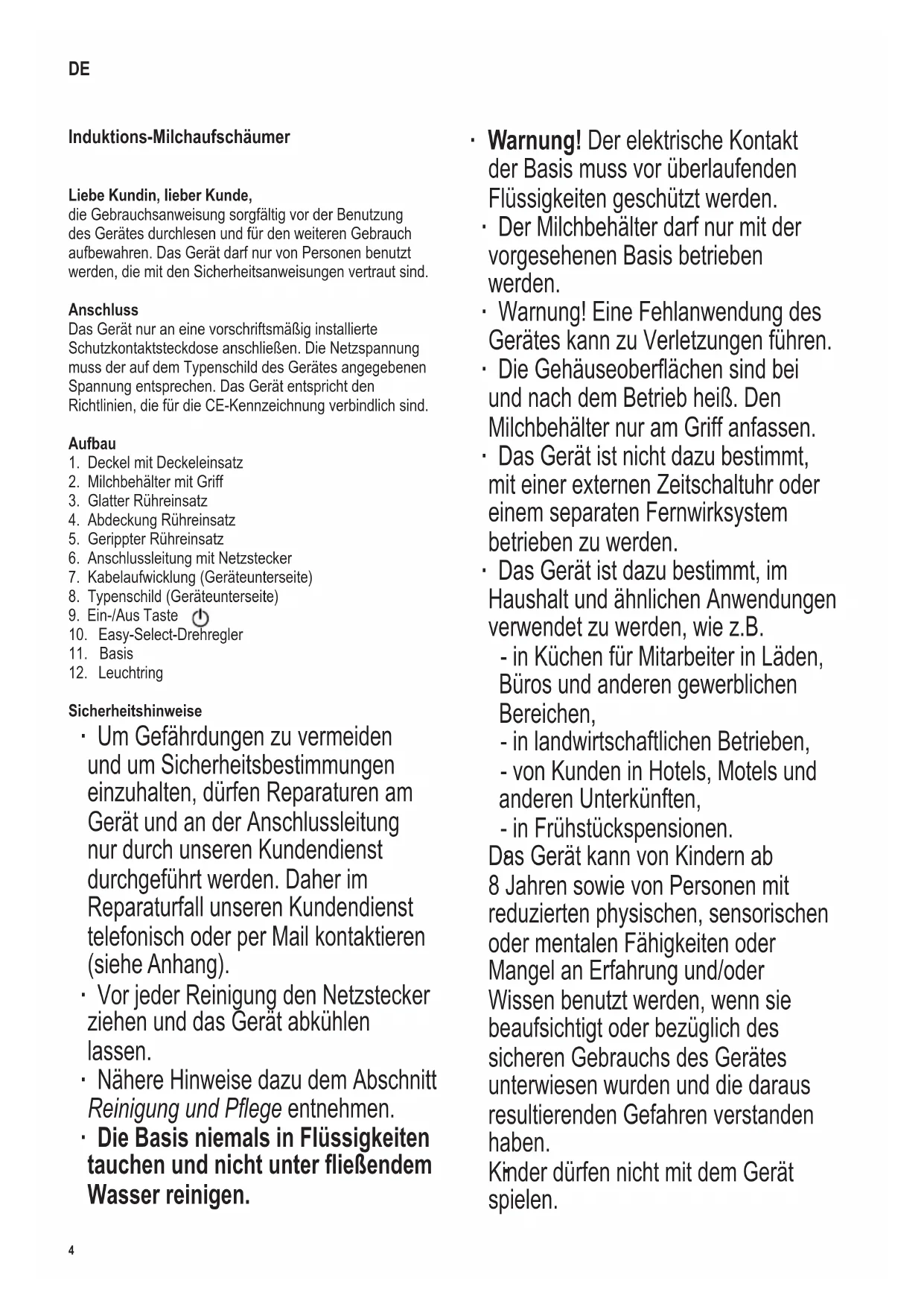 Sicherheitshinweise ∙ Um Gefährdungen zu vermeiden und um Sicherheitsbestimmungen einzuhalten, dürfen Reparaturen am Gerät und an der Anschlussleitung nur durch unseren Kundendienst durchgeführt werden. Daher im Reparaturfall unseren Kundendienst telefonisch oder per Mail kontaktieren (siehe Anhang). ∙ Vor jeder Reinigung den Netzstecker ziehen und das Gerät abkühlen lassen. ∙ Nähere Hinweise dazu dem Abschnitt Reinigung und Pege entnehmen. ∙ Die Basis niemals in Flüssigkeiten tauchen und nicht unter ießendem Wasser reinigen. ∙ Warnung! Der elektrische Kontakt der Basis muss vor überlaufenden Flüssigkeiten geschützt werden. ∙ Der Milchbehälter darf nur mit der vorgesehenen Basis betrieben werden. ∙ Warnung! Eine Fehlanwendung des Gerätes kann zu Verletzungen führen. ∙ DieGehäuseoberächensindbei und nach dem Betrieb heiß. Den Milchbehälter nur am Griff anfassen. ∙ Das Gerät ist nicht dazu bestimmt, mit einer externen Zeitschaltuhr oder einem separaten Fernwirksystem betrieben zu werden. ∙ Das Gerät ist dazu bestimmt, im Haushalt und ähnlichen Anwendungen verwendet zu werden, wie z.B. - in Küchen für Mitarbeiter in Läden, Büros und anderen gewerblichen Bereichen, - in landwirtschaftlichen Betrieben, - von Kunden in Hotels, Motels und anderen Unterkünften, - in Frühstückspensionen.