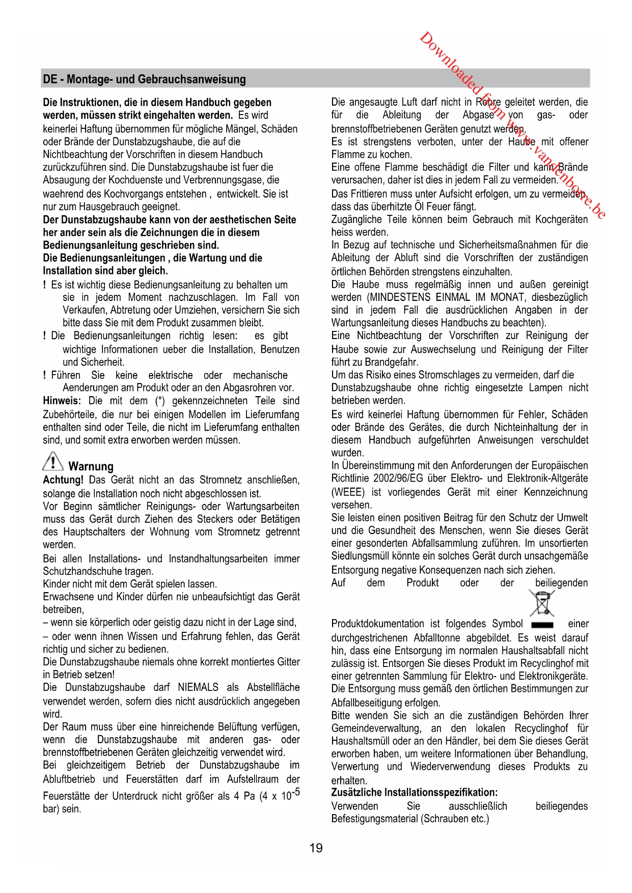 bar) sein. Die angesaugte Luft darf nicht in Rohre geleitet werden, die für die Ableitung der Abgase von gas- oder brennstoffbetriebenen Geräten genutzt werden. Es ist strengstens verboten, unter der Haube mit offener Flamme zu kochen. Eine offene Flamme beschädigt die Filter und kann Brände verursachen, daher ist dies in jedem Fall zu vermeiden. Das Frittieren muss unter Aufsicht erfolgen, um zu vermeiden, dass das überhitzte Öl Feuer fängt. Zugängliche Teile können beim Gebrauch mit Kochgeräten heiss werden. In Bezug auf technische und Sicherheitsmaßnahmen für die Ableitung der Abluft sind die Vorschriften der zuständigen örtlichen Behörden strengstens einzuhalten. Die Haube muss regelmäßig innen und außen gereinigt werden (MINDESTENS EINMAL IM MONAT, diesbezüglich sind in jedem Fall die ausdrücklichen Angaben in der Wartungsanleitung dieses Handbuchs zu beachten). Eine Nichtbeachtung der Vorschriften zur Reinigung der Haube sowie zur Auswechselung und Reinigung der Filter führt zu Brandgefahr. Um das Risiko eines Stromschlages zu vermeiden, darf die Dunstabzugshaube ohne richtig eingesetzte Lampen nicht betrieben werden. Es wird keinerlei Haftung übernommen für Fehler, Schäden oder Brände des Gerätes, die durch Nichteinhaltung der in diesem Handbuch aufgeführten Anweisungen verschuldet wurden. In Übereinstimmung mit den Anforderungen der Europäischen Richtlinie 2002/96/EG über Elektro- und Elektronik-Altgeräte (WEEE) ist vorliegendes Gerät mit einer Kennzeichnung versehen. Sie leisten einen positiven Beitrag für den Schutz der Umwelt und die Gesundheit des Menschen, wenn Sie dieses Gerät einer gesonderten Abfallsammlung zuführen. Im unsortierten Siedlungsmüll könnte ein solches Gerät durch unsachgemäße Entsorgung negative Konsequenzen nach sich ziehen. Auf dem Produkt oder der beiliegenden Produktdokumentation ist folgendes Symbol einer durchgestrichenen Abfalltonne abgebildet. Es weist darauf hin, dass eine Entsorgung im normalen Haushaltsabfall nicht zulässig ist. Entsorgen Sie dieses Produkt im Recyclinghof mit einer getrennten Sammlung für Elektro- und Elektronikgeräte. Die Entsorgung muss gemäß den örtlichen Bestimmungen zur Abfallbeseitigung erfolgen. Bitte wenden Sie sich an die zuständigen Behörden Ihrer Gemeindeverwaltung, an den lokalen Recyclinghof für Haushaltsmüll oder an den Händler, bei dem Sie dieses Gerät erworben haben, um weitere Informationen über Behandlung, Verwertung und Wiederverwendung dieses Produkts zu erhalten. Zusätzliche Installationsspezifikation: Verwenden Sie ausschließlich beiliegendes Befestigungsmaterial (Schrauben etc.) Downloaded from www.vandenborre.be20 Verwenden Sie ausschließlich die in dieser Anleitung beschriebenen Schrauben und deren vorgegeben Längen! WARNUNG! Installation der Schrauben und Befestigungsmaterial die NICHT gemäß dieser Anleitung durchgeführt wurden, kann zu einem elektrischen Schlag führen! Betriebsart Die Haube kann sowohl als Abluftgërat als auch als Umluftgërat eingesetzt werden. Abluftbetrieb Die Luft wird mit Hilfe eines an den Abluftstutzen anzubringenden Rohres ins Freie geleitet. Das Abluftrohr wird hierbei nicht geliefert und soll separat angekauft werden. Das Abluftrohr muß denselben Durchmesser wie der Abluftstutzen aufweisen. Das Abluftrohr muß muß in waagrechter Lage leicht nach oben geneigt sein (ca. 10%), damit die Luft ungehindert ins Freie abgeleitet werden kann. Note. Sollte die Dunstabzugshaube mit Aktiv-kohlefilter versehen sein, so muß dieser entfernt werden. Die Dunstabzugshaube an Abluftrohre und Wandabluftauslass mit dem selben Durchmesser wie der Luftausgang verbinden (Anschlussflansch). Die Benutzung von Rohren und Wandabluftauslass mit geringerem Durchmesser, verursacht eine Verringerung der Abluftleistung und eine drastische Zunahme der Geraeuschentwicklung. Jegliche Verantwortung diesbezueglich wird daher abgelenkt ! Ein möglichst kurzes Rohr verwenden. ! Ein Rohrsystem mit einer möglichst geringen Anzahl von Krümmungen verwenden (max. Winkel der Krümmung: 90°). ! Starke Änderungen des Rohrdurchmessers sind zu vermeiden . ! Die Innenfläche der Rohrs muss so glatt wie möglich sein