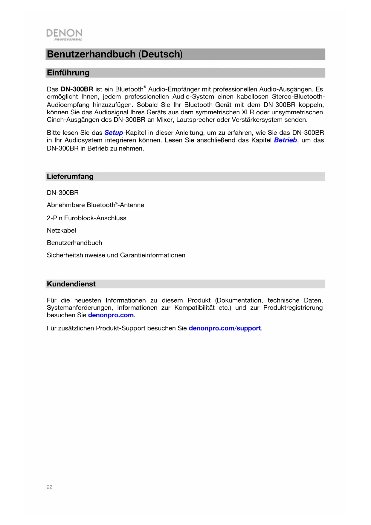 Kundendienst Für die neuesten Informationen zu diesem Produkt (Dokumentation, technische Daten, Systemanforderungen, Informationen zur Kompatibilität etc.) und zur Produktregistrierung besuchen Sie denonpro.com. Für zusätzlichen Produkt-Support besuchen Sie denonpro.com/support.23