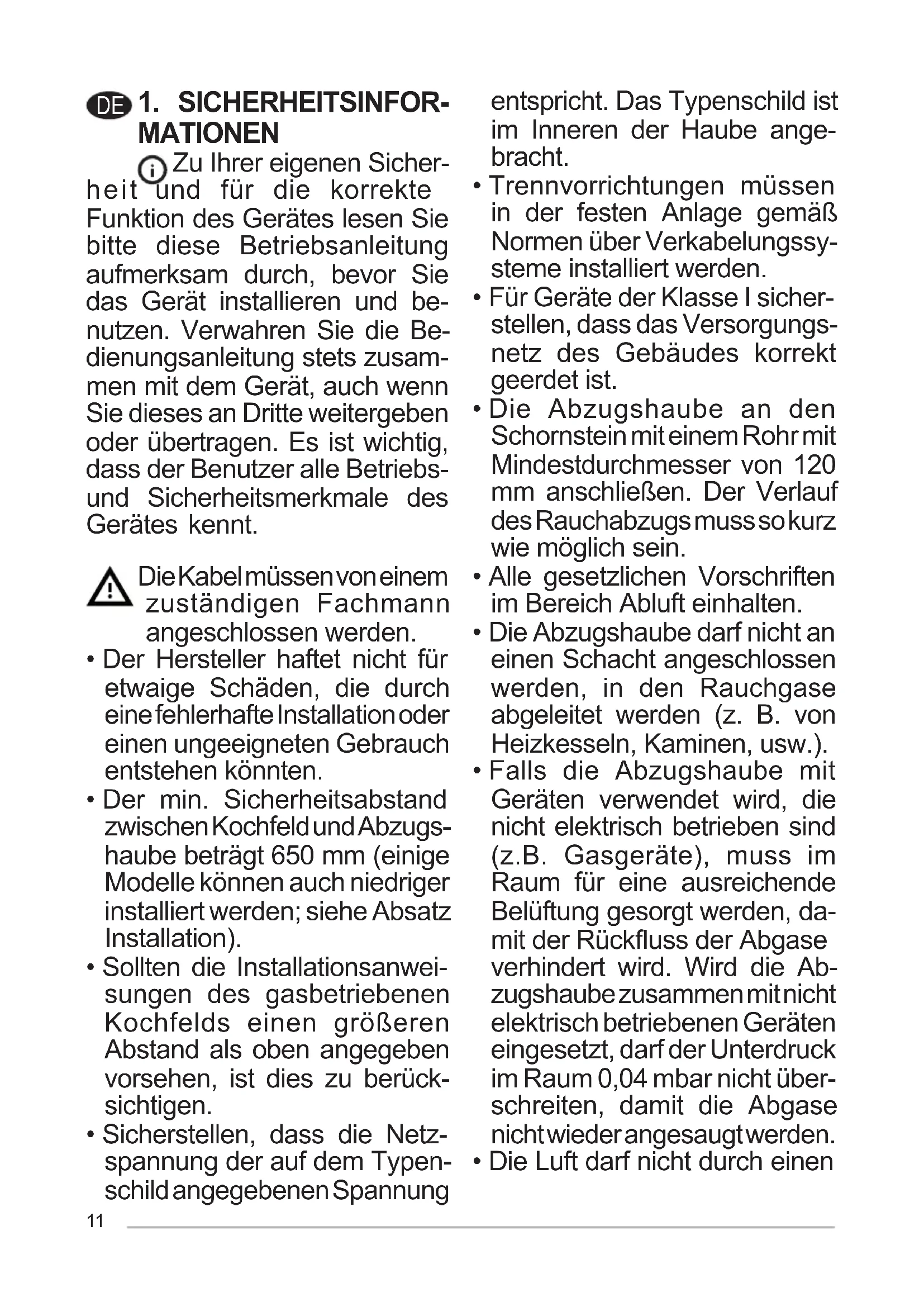 - Falls die Abzugshaube mit Geräten verwendet wird, die nicht elektrisch betrieben sind (z.B. Gasgeräte), muss im Raum für eine ausreichende Belüftung gesorgt werden, da- mitderRückussderAbgase verhindert wird. Wird die Ab- zugshaube zusammen mit nicht elektrisch betriebenen Geräten eingesetzt, darf der Unterdruck im Raum 0,04 mbar nicht über- schreiten, damit die Abgase nicht wieder angesaugt werden.