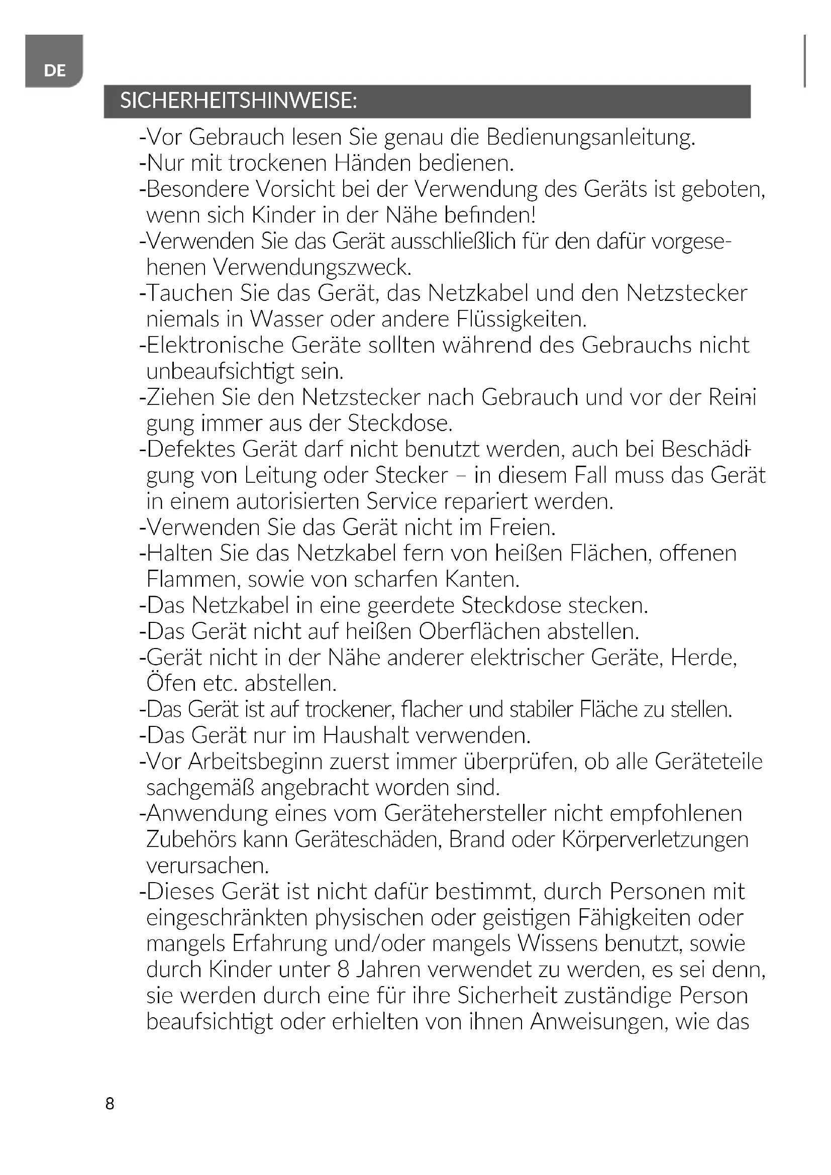 Dieses Gerät ist nicht dafür besmmt, durch Personen mit eingeschränkten physischen oder geisgen Fähigkeiten oder mangels Erfahrung und/oder mangels Wissens benutzt, sowie durch Kinder unter 8 Jahren verwendet zu werden, es sei denn, sie werden durch eine für ihre Sicherheit zuständige Person beaufsichgt oder erhielten von ihnen Anweisungen, wie das9
