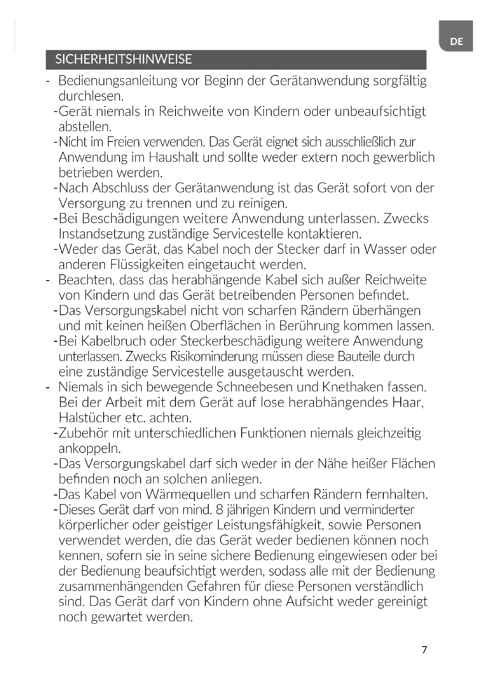 men. ANMERKUNG! Beim Mixen mit den Knethaken kann sich an Schüsselrändern Mehl absetzen. Nachdem das Gerät vorerst abgeschaltet wurde, ist das Mehl mit der Spatel aufzusammeln. Die Schneebesen (5) eignen sich u.a. zum Reiben von Eigelb mit Zucker, zur Zubereitung von Cremes sowie Eierkuchen und Pfannkuchen. Die Knethaken (7) eignen sich zum Zubereiten von Reib-, Hafer-, Käse- und Lebkuchen etc. SICHERHEITSMASSNAHMEN