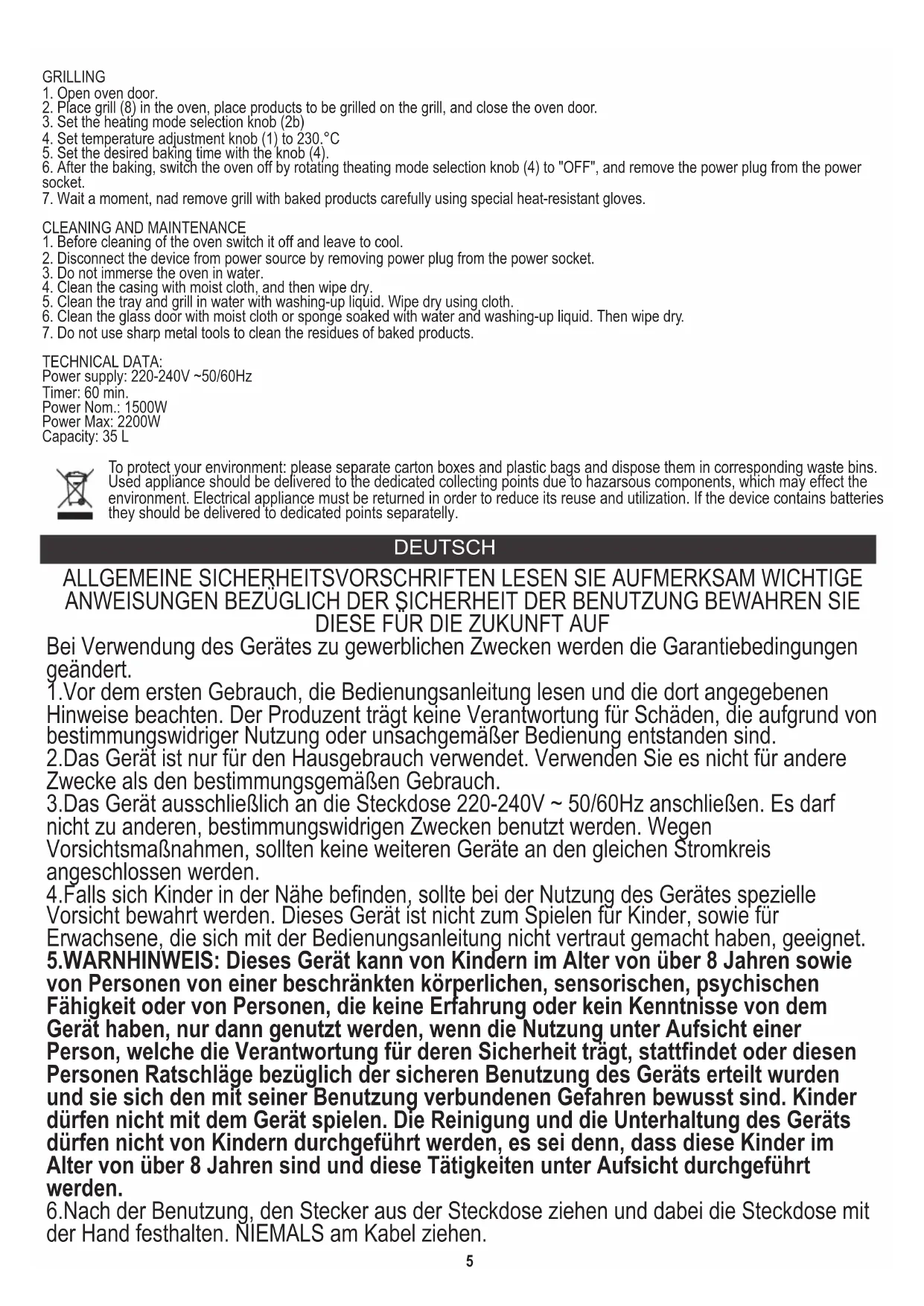 TECHNISCHE DATEN: Timer: 60 min. Versorgung: 220-240V ~50/60Hz 6. Verglaste Tür mit feuchtem Tuch oder mit Schwamm – im Wasser mit Zusatz vom Geschirrspülmittel eingeweicht – reinigen. Dann trocknen wischen. 7. Für die Reinigung von eventuellen Rückständen der gegrillten/gebratenen Produkte keine scharfe Geräte aus Metall verwenden.8 Den Pappkarton im Altpapier entsorgen. Polyäthylenbeutel (PE) in dem Behälter für Kunststoff entsorgen. Das abgenutzte Gerät zum Recycling zu einer offiziellen Sammelstelle bringen, da es gefährliche Substanzen enthält, die die Umwelt gefährden können. Das Gerät sollte in einer Form abgegeben werden, die eine weitere Nutzung unmöglich macht. Wenn es Batterien enthält, sollten diese rausgenommen und separat an einer Sammelstelle abgegeben werden. Das Gerät darf nicht in den Hausmüll rausgeworfen werden!! FRANÇAIS Volumen: 35 L 6.Après chaque utilisation, débrancher la fiche d'alimentation de la prise de courant, en maintenant la prise avec la main. Ne pas tirer sur le cordon d'alimentation. 8.Vérifier périodiquement l'état du cordon d'alimentation. Si le cordon d'alimentation est endommagé, il devra être changé par un service de réparation spécialisé afin d'éviter le danger. 2.L'appareil est destiné à un usage domestique. Ne pas l'utiliser à d'autres fins que celles pour lesquelles il a été prévu. CONSIGNES DE SECURITE. INSTRUCTIONS IMPORTANTES CONCERNANT LA SECURITE D'UTILISATION.