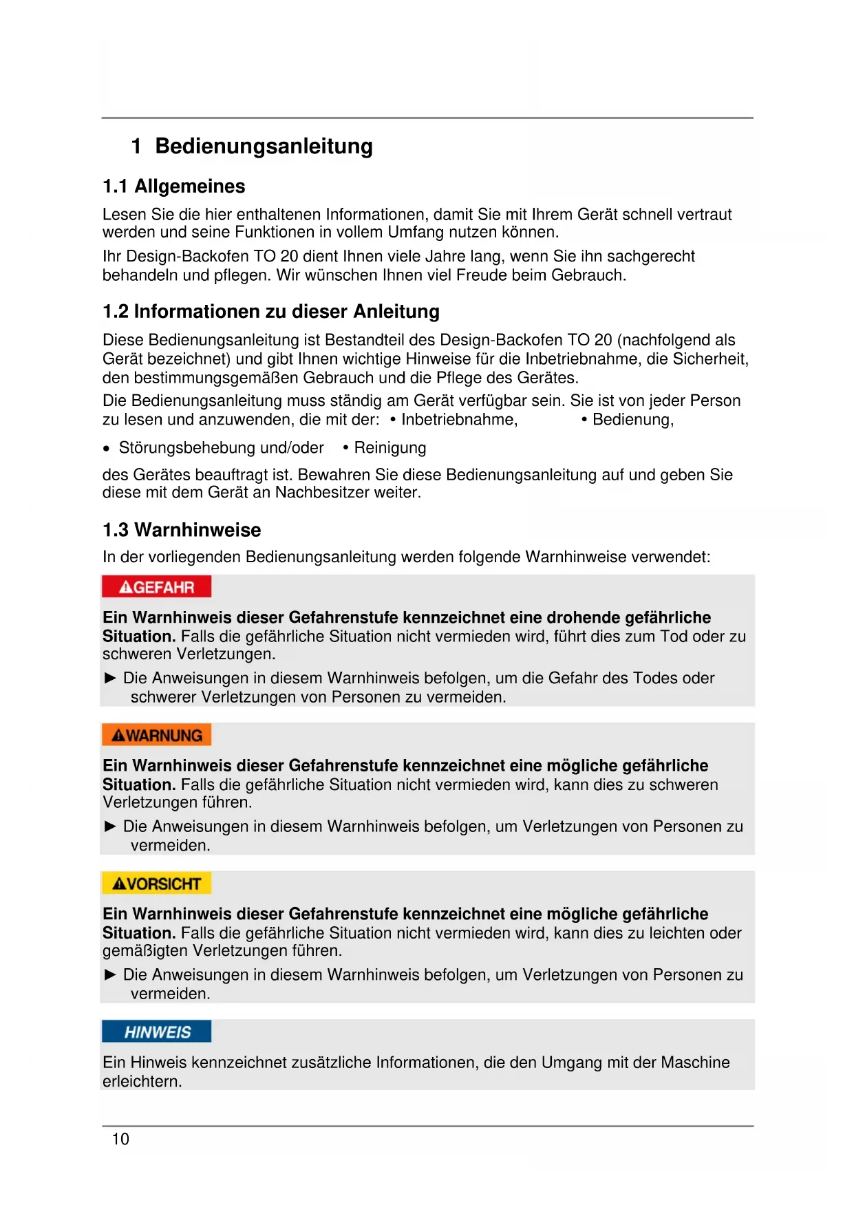 Diese Bedienungsanleitung ist Bestandteil des Design-Backofen TO 20 (nachfolgend als Gerät bezeichnet) und gibt Ihnen wichtige Hinweise für die Inbetriebnahme, die Sicherheit, den bestimmungsgemäßen Gebrauch und die Pflege des Gerätes. Die Bedienungsanleitung muss ständig am Gerät verfügbar sein. Sie ist von jeder Person zu lesen und anzuwenden, die mit der: Inbetriebnahme, Bedienung, Störungsbehebung und/oder Reinigung des Gerätes beauftragt ist. Bewahren Sie diese Bedienungsanleitung auf und geben Sie diese mit dem Gerät an Nachbesitzer weiter.
