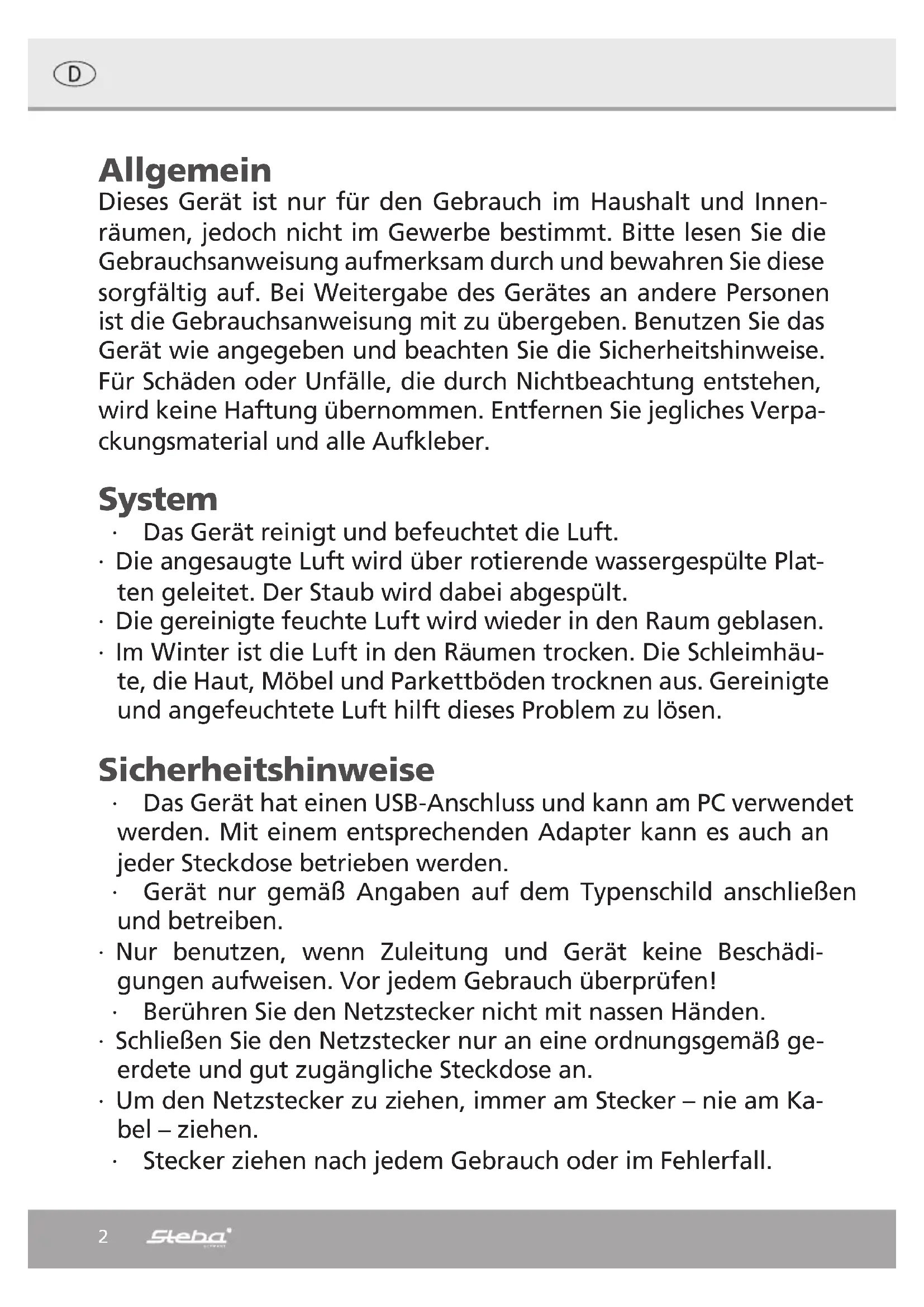 www.steba.com 5 V ; 6 W Mini-Luftwäscher AW 6M Gebrauchsanweisung 2 Instructions for use 10 Mode d´emploi 16 Gebruiksaanwijzing 242 Allgemein Dieses Gerät ist nur für den Gebrauch im Haushalt und Innen- räumen, jedoch nicht im Gewerbe bestimmt. Bitte lesen Sie die Gebrauchsanweisung aufmerksam durch und bewahren Sie diese sorgfältig auf. Bei Weitergabe des Gerätes an andere Personen ist die Gebrauchsanweisung mit zu übergeben. Benutzen Sie das Gerät wie angegeben und beachten Sie die Sicherheitshinweise. Für Schäden oder Unfälle, die durch Nichtbeachtung entstehen, wird keine Haftung übernommen. Entfernen Sie jegliches Verpa- ckungsmaterial und alle Aufkleber. System ∙ Das Gerät reinigt und befeuchtet die Luft. ∙ Die angesaugte Luft wird über rotierende wassergespülte Plat- ten geleitet. Der Staub wird dabei abgespült. ∙ Die gereinigte feuchte Luft wird wieder in den Raum geblasen. ∙ Im Winter ist die Luft in den Räumen trocken. Die Schleimhäu- te, die Haut, Möbel und Parkettböden trocknen aus. Gereinigte und angefeuchtete Luft hilft dieses Problem zu lösen. Sicherheitshinweise ∙ Das Gerät hat einen USB-Anschluss und kann am PC verwendet werden. Mit einem entsprechenden Adapter kann es auch an jeder Steckdose betrieben werden. ∙ Gerät nur gemäß Angaben auf dem Typenschild anschließen und betreiben. ∙ Nur benutzen, wenn Zuleitung und Gerät keine Beschädi- gungen aufweisen. Vor jedem Gebrauch überprüfen! ∙ Berühren Sie den Netzstecker nicht mit nassen Händen. ∙ Schließen Sie den Netzstecker nur an eine ordnungsgemäß ge- erdete und gut zugängliche Steckdose an. ∙ Um den Netzstecker zu ziehen, immer am Stecker – nie am Ka- bel – ziehen. ∙ Stecker ziehen nach jedem Gebrauch oder im Fehlerfall.3 ∙ Reißen Sie nicht an der Netzanschlussleitung. Scheuern Sie die- se nicht an Kanten und klemmen Sie diese nicht ein. ∙ Zuleitung von heißen Teilen fernhalten. ∙ Das Gerät kann von Kindern ab 8 Jahren sowie von Per- sonen mit reduzierten physischen, sensorischen oder men- talen Fähigkeiten oder Mangel an Erfahrung und/oder Wissen benutzt werden, wenn sie beaufsichtigt oder bezüglich des si- cheren Gebrauchs des Gerätes unterwiesen wurden und die da- raus resultierenden Gefahren verstanden haben. Reinigung und Benutzer-Wartung dürfen nicht durch Kinder durchgeführt werden, es sei denn sie sind älter als 8 Jahre und beaufsichtigt. ∙ Kinder jünger als 8 Jahre sind vom Gerät und der Anschlusslei- tung fernzuhalten. ∙ Kinder sollten beaufsichtigt werden, um sicherzustellen, dass sie nicht mit dem Gerät oder dem Verpackungsmaterial spielen (z.B. Plastiktüten). ∙ Das Gerät darf nicht mit einer Zeitschaltuhr oder mit einem se- paraten Fernwirksystem betrieben werden! ∙ Bewahren Sie das Gerät nicht im Freien oder einem feuchten Raum auf. ∙ Tauchen Sie das Gerät niemals ins Wasser. ∙ Benutzen Sie das Gerät niemals nach einer Fehlfunktion, z.B. wenn es heruntergefallen ist oder auf eine andere Weise be- schädigt wurde. ∙ Der Hersteller übernimmt keine Verantwortung bei falschem oder unsachgemäßem Gebrauch, der durch die Nichtbeachtung der Gebrauchsanleitung zustande kommt. ∙ Um Gefährdungen zu vermeiden dürfen Reparaturen am Ge- rät, wie z.B. eine beschädigte Zuleitung austauschen, nur durch einen Kundendienst ausgeführt werden. Es dürfen nur original Ersatzteile verwendet werden. ∙ Das Gerät nur für die in der Bedienungsanleitung beschrie- benen Zwecke benutzen.4 ∙ Dieses Gerät ist dazu bestimmt im Haushalt und ähnlichen An- wendungen verwendet zu werden wie beispielsweise: o in Küchen für Mitarbeiter in Läden, Büros und anderen gewerblichen Bereichen o in landwirtschaftlichen Anwesen und von Kunden in Ho- tels, Motels und anderen Wohneinrichtungen o in Frühstückspensionen. ∙ Bei Verwendung eines Verlängerungskabels muss dieses einen Querschnitt von 1,5mm² haben. ∙ Bei einer GS-geprüften 16 A Mehrfach-Steckerleiste darf die- se wegen Brandgefahr nicht mit mehr wie 3680 Watt belastet werden. ∙ Achten Sie drauf, dass Kinder nicht am Kabel ziehen oder eine Stolperfalle entsteht. ∙ Das Gerät ist bei nicht vorhandener Aufsicht und vor dem Zu- sammenbau, dem Auseinandernehmen oder Reinigen stets vom Netz zu trennen. ∙ Nicht mit einer Decke o.ä. abdecken. ∙ Keine spitzen Metallgegenstände oder Finger in den Luf- taustritt stecken. ∙ Das Gerät nicht im Badezimmer oder Räumen mit hoher Luft- feuchtigkeit benutzen. ∙ Keine Raumsprays in das Gerät sprühen. ∙ Den Luftaustritt nicht auf Holzfurnier etc. richten.5 Reinigung ∙ Achtung! Vor jeder Reinigung Netzstecker ziehen und das Gerät abkühlen lassen. ∙ Gerät nicht in Wasser tauchen. ∙ Aus hygienischen Gründen soll das Gerät alle 14 Tage komplett gereinigt werden. ∙ Wenn das Gerät länger als 3 Tage nicht benutzt wird, sollte das Wasser im Wassertank erneuert werden. ∙ Heben Sie das Motorteil vom Wassertank ab und reinigen Sie es mit einem feuchten Tuch. ∙ Danach die darunterliegende Wasserwanne mit dem befeuch- teten Plattenpaket herausziehen. ∙ Das Plattenpaket im warmen Seifenwasser abwaschen. ∙ Je nach Wasserhärte muss die Kalkablagerung in der Wanne und am Plattenpaket entfernt werden. Man verwendet dafür je nach Ablagerung Essigwasser oder Entkalkungsmittel. Keine aggressiven Reinigungsmittel verwenden. Arbeitsplatz Wichtig: Das Gerät niemals auf oder neben eine heiße Oberfläche stel- len (z.B. Herdplatte), sondern nur auf einer ebenen, stabilen und temperaturbeständigen Unterlage betreiben. Es ist immer da- rauf zu achten, dass sich keine entflammbaren Gegenstände in der Nähe befinden. Das Gerät nicht an die Tischkante stellen, damit es nicht von Kin- dern berührt werden kann oder bei Berührung herunterfällt.6