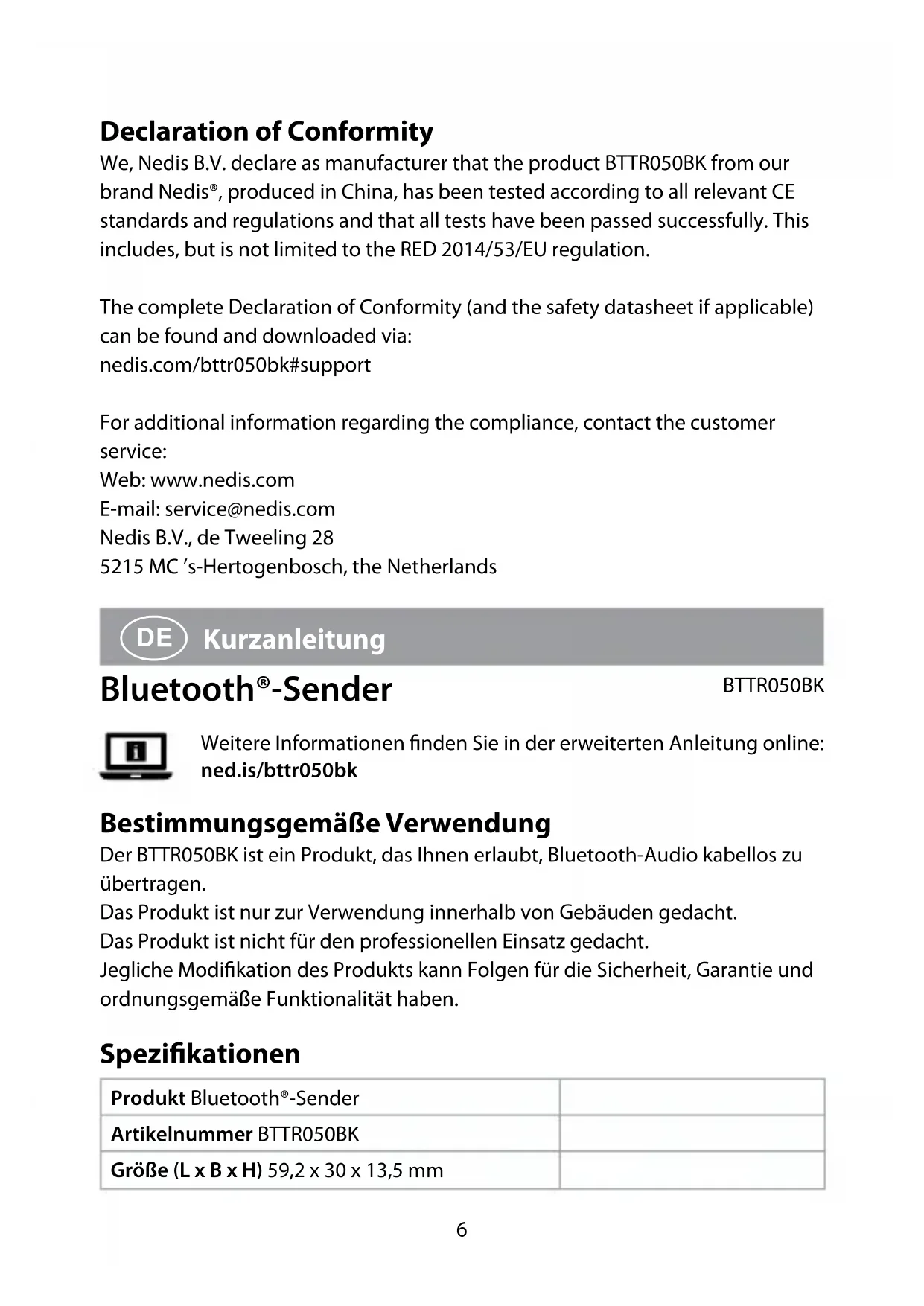 leuchtet auf, um anzuzeigen, dass die Kopplung erfolgreich war. Konformitätserklärung Wir, Nedis B.V., erklären als Hersteller, dass das Produkt BTTR050BK unserer Marke Nedis®, produziert in China, nach allen geltenden CE-Standards und Vorschriften getestet wurde und alle diese Tests erfolgreich bestanden hat. Dies gilt unter anderem auch für die Richtlinie RED 2014/53/EU. Die vollständige Konformitätserklärung (und das Sicherheitsdatenblatt, falls zutreend) steht zum Download zur Verfügung unter: nedis.de/bttr050bk#support Weiterführende Informationen zur Compliance erhalten Sie über den Kundenservice: Web: www.nedis.com E-Mail: service@nedis.com Nedis B.V., de Tweeling 28 5215 MC ’s-Hertogenbosch, Niederlande9