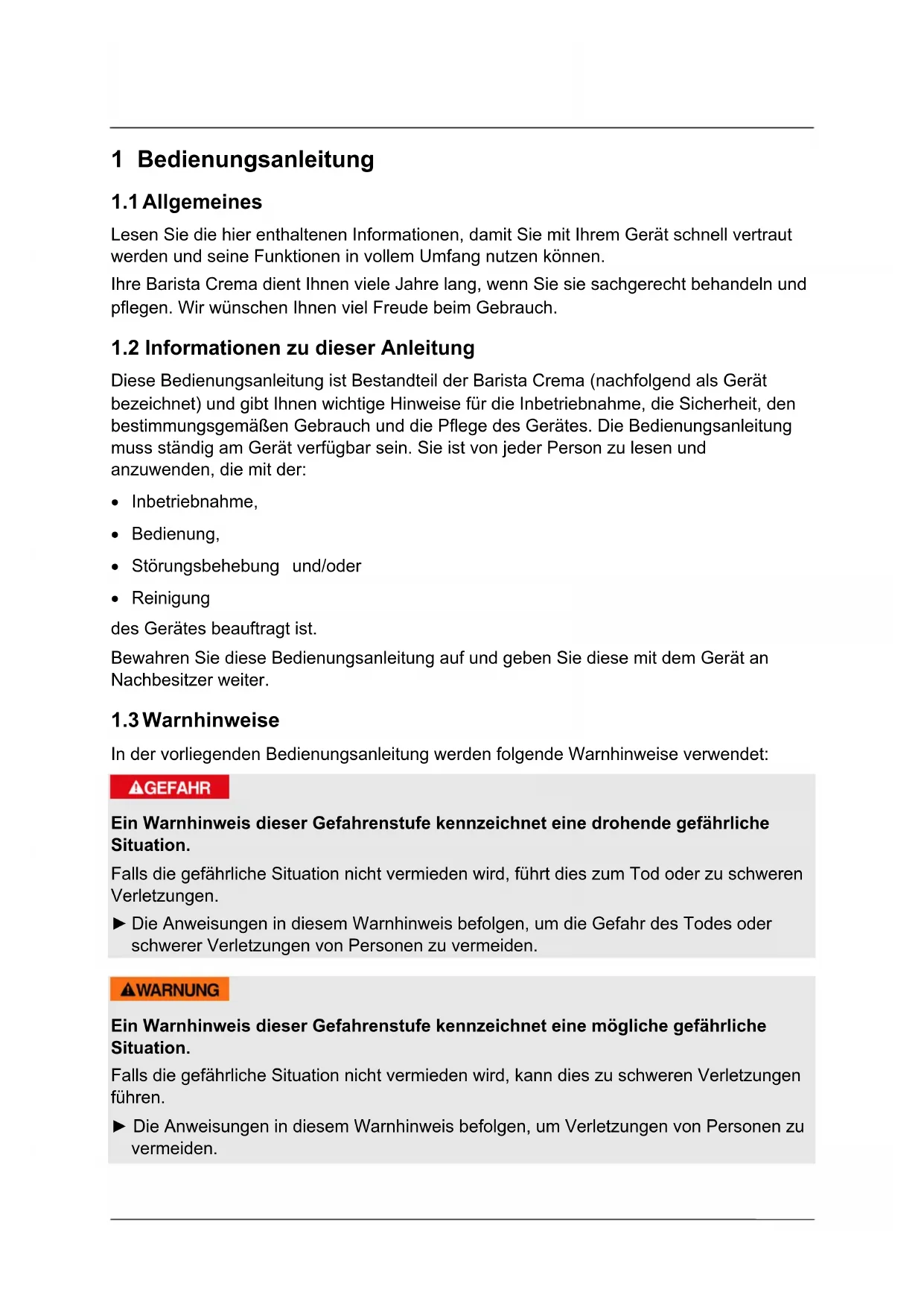 Diese Bedienungsanleitung ist Bestandteil der Barista Crema (nachfolgend als Gerät bezeichnet) und gibt Ihnen wichtige Hinweise für die Inbetriebnahme, die Sicherheit, den bestimmungsgemäßen Gebrauch und die Pflege des Gerätes. Die Bedienungsanleitung muss ständig am Gerät verfügbar sein. Sie ist von jeder Person zu lesen und anzuwenden, die mit der: Inbetriebnahme, Bedienung, Störungsbehebung und/oder Reinigung des Gerätes beauftragt ist. Bewahren Sie diese Bedienungsanleitung auf und geben Sie diese mit dem Gerät an Nachbesitzer weiter.