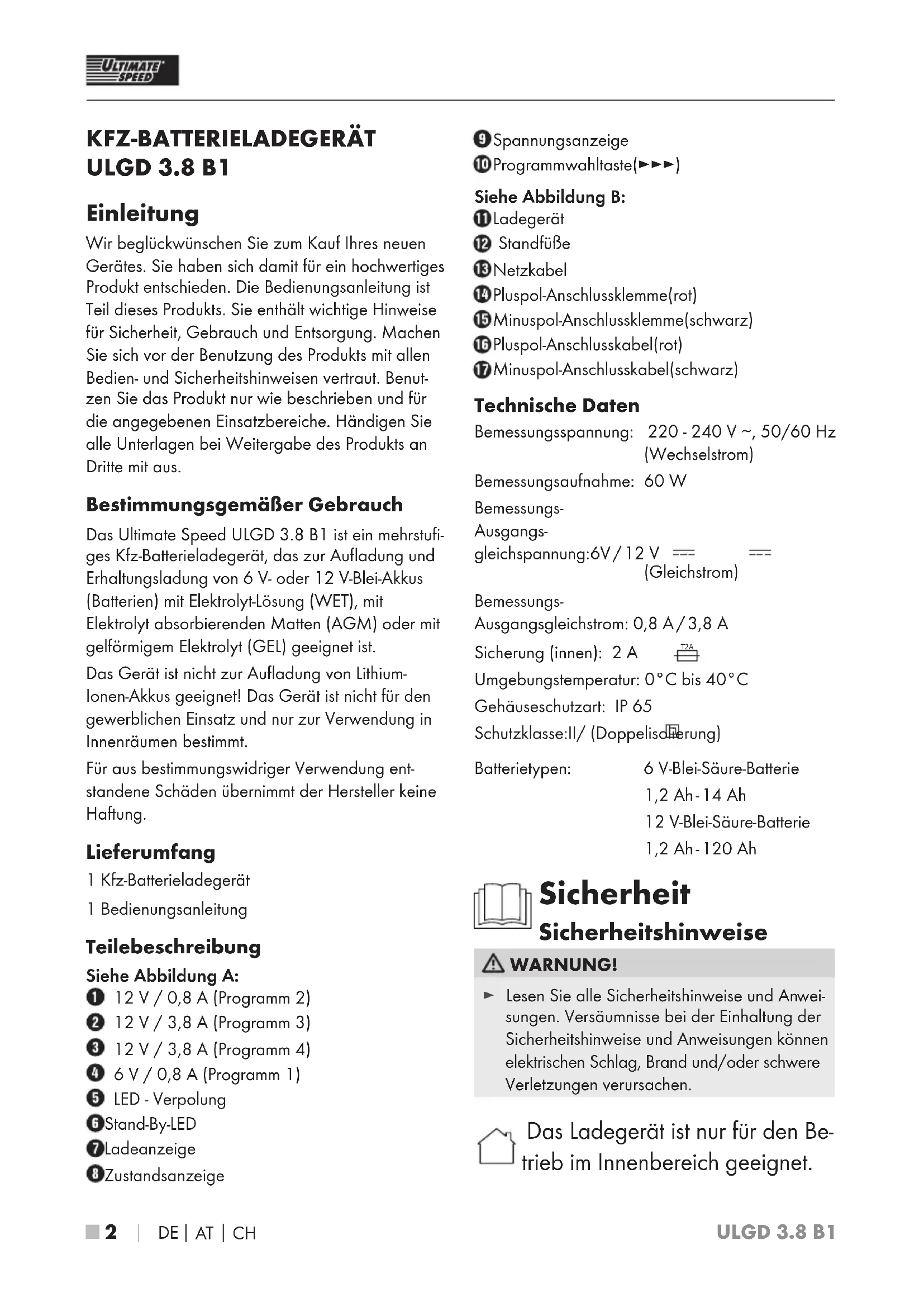 KFZ-BATTERIELADEGERÄT ULGD3.8B1 Einleitung Wir beglückwünschen Sie zum Kauf Ihres neuen Gerätes. Sie haben sich damit für ein hochwertiges Produkt entschieden. Die Bedienungsanleitung ist Teil dieses Produkts. Sie enthält wichtige Hinweise für Sicherheit, Gebrauch und Entsorgung. Machen Sie sich vor der Benutzung des Produkts mit allen Bedien- und Sicherheitshinweisen vertraut. Benut- zen Sie das Produkt nur wie beschrieben und für die angegebenen Einsatzbereiche. Händigen Sie alle Unterlagen bei Weitergabe des Produkts an Dritte mit aus. Bestimmungsgemäßer Gebrauch Das Ultimate Speed ULGD3.8B1 ist ein mehrstufi- ges Kfz-Batterieladegerät, das zur Aufladung und Erhaltungsladung von 6V- oder 12V-Blei-Akkus (Batterien) mit Elektrolyt-Lösung (WET), mit Elektrolyt absorbierenden Matten (AGM) oder mit gelförmigem Elektrolyt (GEL) geeignet ist. Das Gerät ist nicht zur Aufladung von Lithium- Ionen-Akkus geeignet! Das Gerät ist nicht für den gewerblichen Einsatz und nur zur Verwendung in Innenräumen bestimmt. Für aus bestimmungswidriger Verwendung ent- standene Schäden übernimmt der Hersteller keine Haftung. Lieferumfang 1 Kfz-Batterieladegerät 1 Bedienungsanleitung Teilebeschreibung Siehe Abbildung A: 12 V / 0,8 A (Programm 2) 12 V / 3,8 A (Programm 3) 12 V / 3,8 A (Programm 4) 6 V / 0,8 A (Programm 1) LED - Verpolung Stand-By-LED Ladeanzeige Zustandsanzeige Spannungsanzeige Programmwahltaste (►►►) Siehe Abbildung B: Ladegerät Standfüße Netzkabel Pluspol-Anschlussklemme (rot) Minuspol-Anschlussklemme (schwarz) Pluspol-Anschlusskabel (rot) Minuspol-Anschlusskabel (schwarz) Technische Daten Bemessungsspannung: 220 - 240 V ∼, 50/60 Hz (Wechselstrom) Bemessungsaufnahme: 60 W Bemessungs- Ausgangs- gleichspannung: 6 V / 12 V (Gleichstrom) Bemessungs- Ausgangsgleichstrom: 0,8 A / 3,8 A Sicherung (innen): 2 A T2A Umgebungstemperatur: 0°C bis 40°C Gehäuseschutzart: IP 65 Schutzklasse: II / (Doppelisolierung) Batterietypen: 6 V-Blei-Säure-Batterie 1,2 Ah - 14 Ah 12 V-Blei-Säure-Batterie 1,2 Ah - 120 Ah Sicherheit Sicherheitshinweise WARNUNG! ► Lesen Sie alle Sicherheitshinweise und Anwei- sungen. Versäumnisse bei der Einhaltung der Sicherheitshinweise und Anweisungen können elektrischen Schlag, Brand und/oder schwere Verletzungen verursachen. Das Ladegerät ist nur für den Be- trieb im Innenbereich geeignet.ULGD 3.8 B1