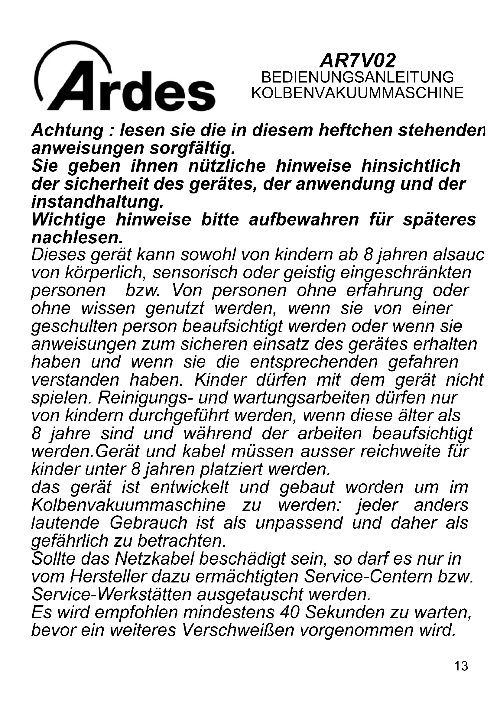 Laden Sie die Anleitung für Ihr Vakuummaschine kostenlos im PDF-Format! Finden Sie Ihr Handbuch AR7000S2 - ARDES und nehmen Sie Ihr elektronisches Gerät wieder in die Hand. Auf dieser Seite sind alle Dokumente veröffentlicht, die für die Verwendung Ihres Geräts notwendig sind. AR7000S2 von der Marke ARDES.