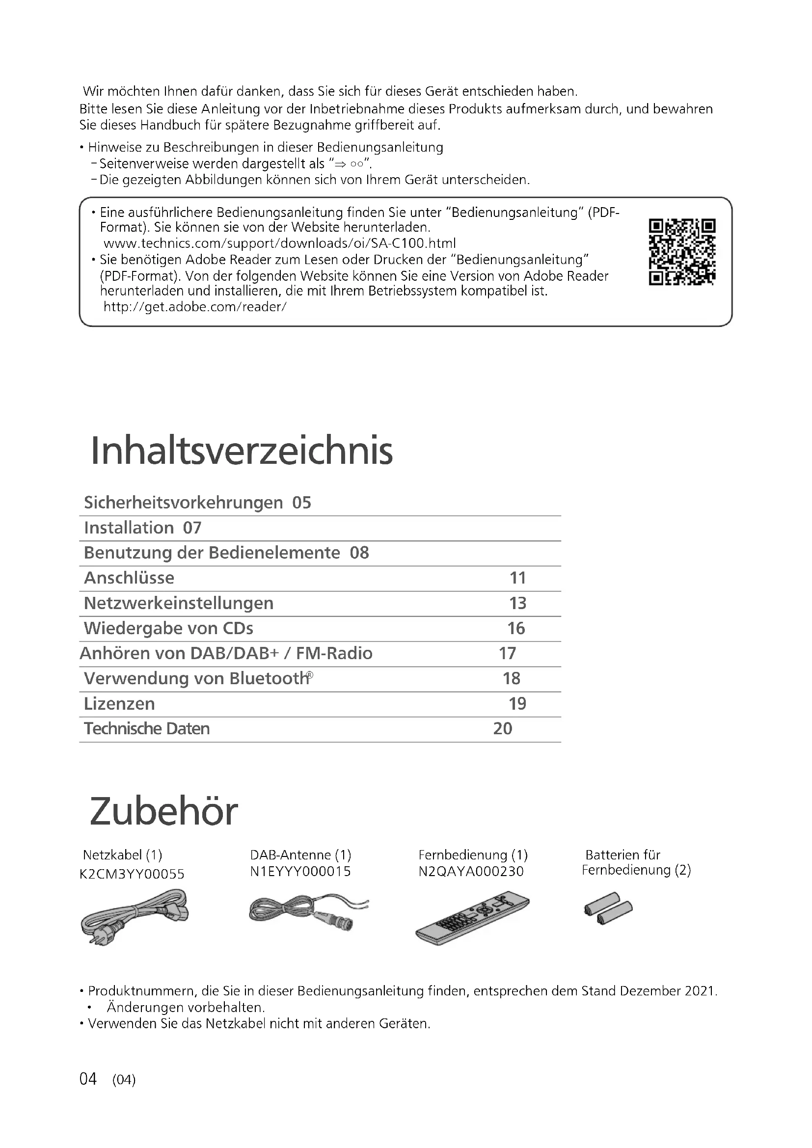 - Sie benötigen Adobe Reader zum Lesen oder Drucken der “Bedienungsanleitung” (PDF-Format). Von der folgenden Website können Sie eine Version von Adobe Reader herunterladen und installieren, die mit Ihrem Betriebssystem kompatibel ist. http://get.adobe.com/reader/ Inhaltsverzeichnis Sicherheitsvorkehrungen 05 Installation 07 Benutzung der Bedienelemente 08 Anschlüsse 11 Netzwerkeinstellungen 13 Wiedergabe von CDs 16 Anhören von DAB/DAB+ / FM-Radio 17 Verwendung von Bluetooth