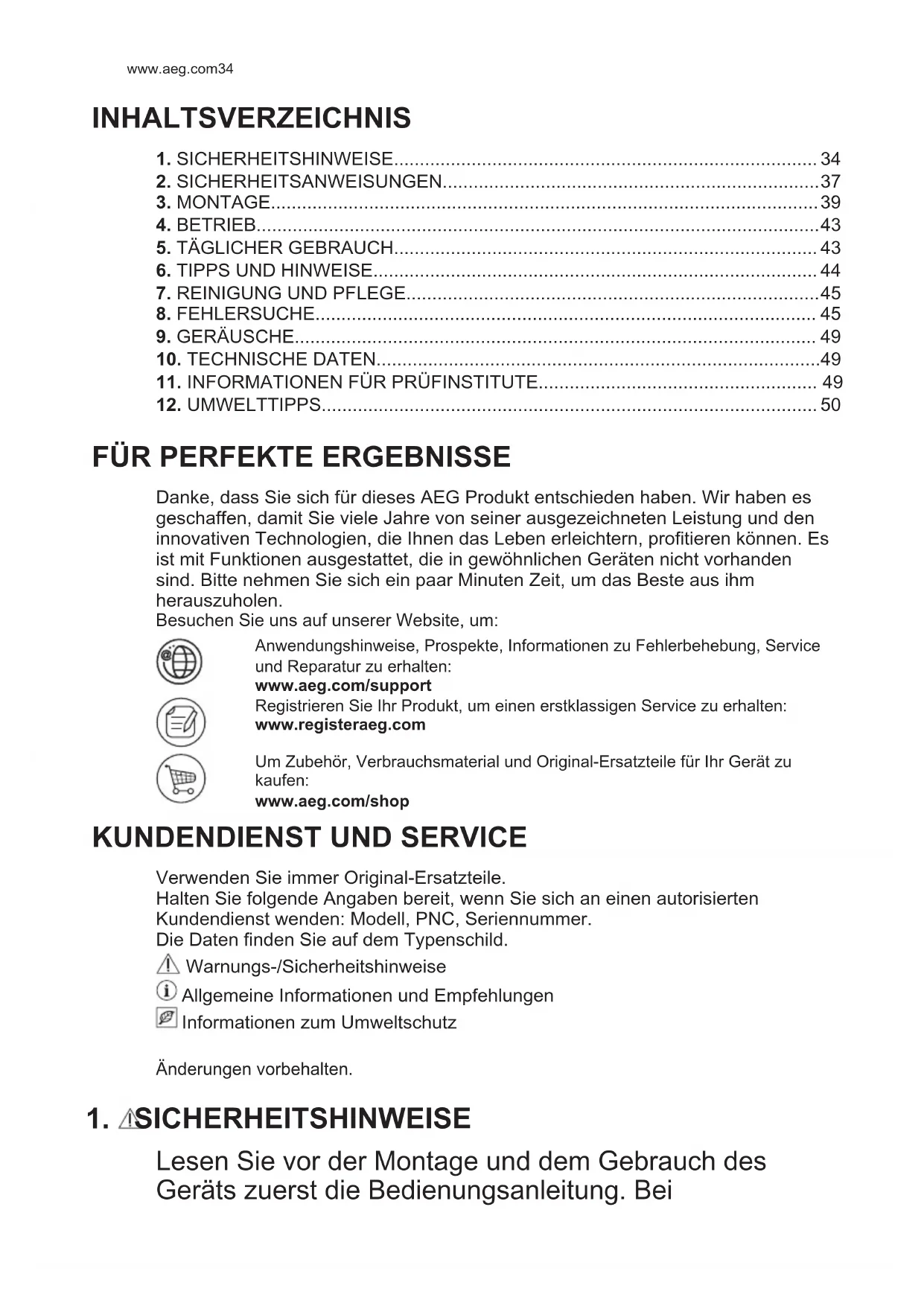 Lesen Sie vor der Montage und dem Gebrauch des Geräts zuerst die Bedienungsanleitung. Bei www.aeg.com34Verletzungen oder Schäden infolge nicht ordnungsgemäßer Montage oder Verwendung übernimmt der Hersteller keine Haftung. Bewahren Sie die Anleitung zum Nachschlagen an einem sicheren und zugänglichen Ort auf.