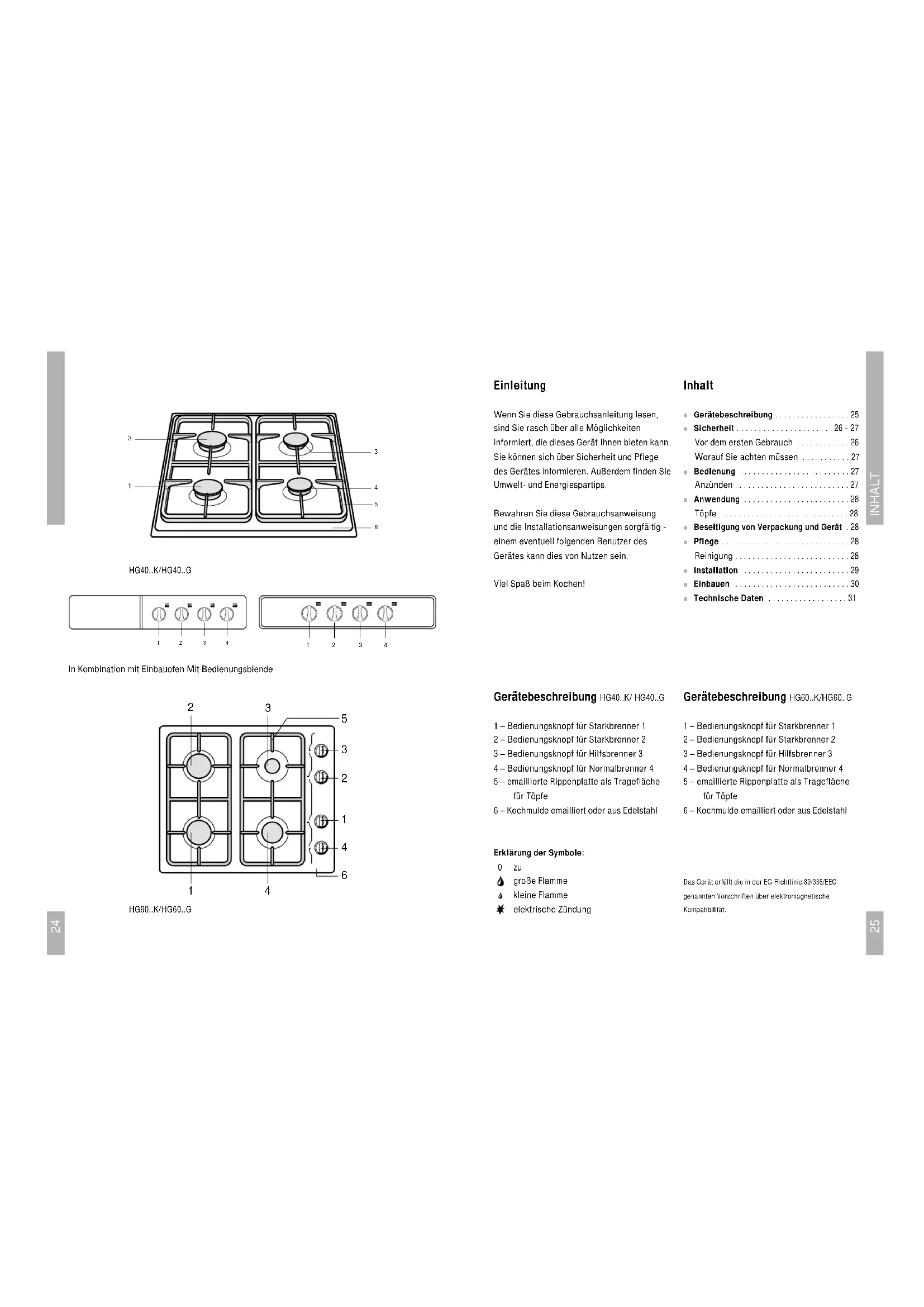 - ■ Technische Daten Gerätebeschreibung HG40 K/ HG40 G 1 – Bedienungsknopf für Starkbrenner 1 2 – Bedienungsknopf für Starkbrenner 2 3 – Bedienungsknopf für Hilfsbrenner 3 4 – Bedienungsknopf für Normalbrenner 4 5 – emaillierte Rippenplatte als Tragefläche für Töpfe 6 – Kochmulde emailliert oder aus Edelstahl Erklärung der Symbole: 0zu große Flamme kleine Flamme elektrische Zündung Gerätebeschreibung HG60 K/HG60 G 1 – Bedienungsknopf für Starkbrenner 1 2 – Bedienungsknopf für Starkbrenner 2 3 – Bedienungsknopf für Hilfsbrenner 3 4 – Bedienungsknopf für Normalbrenner 4 5 – emaillierte Rippenplatte als Tragefläche für Töpfe 6 – Kochmulde emailliert oder aus Edelstahl Das Gerät erfüllt die in der EG-Richtlinie 89/336/EEG genannten Vorschriften über elektromagnetische Kompatibilität. p. 31