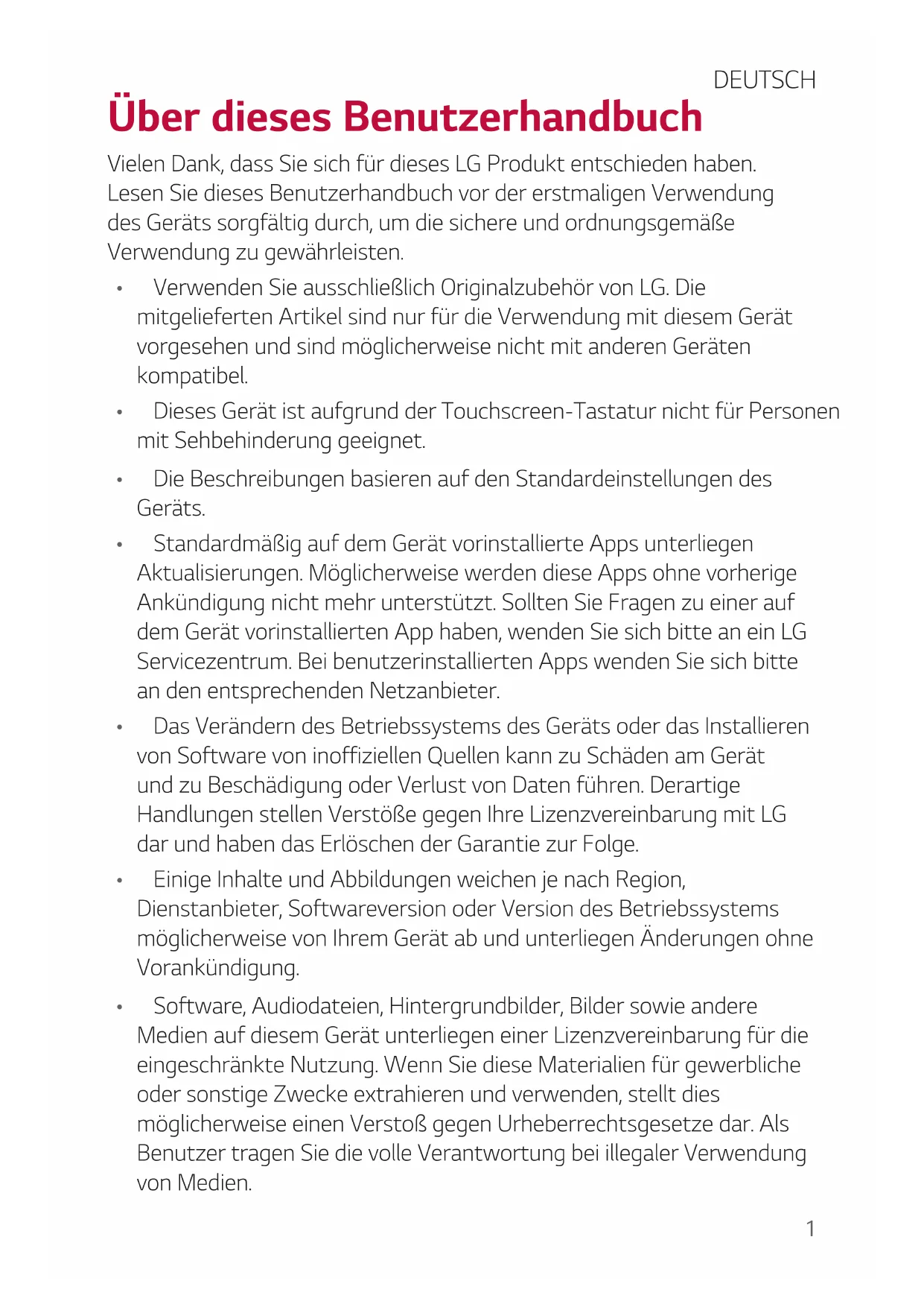 Über dieses Benutzerhandbuch Vielen Dank, dass Sie sich für dieses LG Produkt entschieden haben. Lesen Sie dieses Benutzerhandbuch vor der erstmaligen Verwendung des Geräts sorgfältig durch, um die sichere und ordnungsgemäße Verwendung zu gewährleisten.