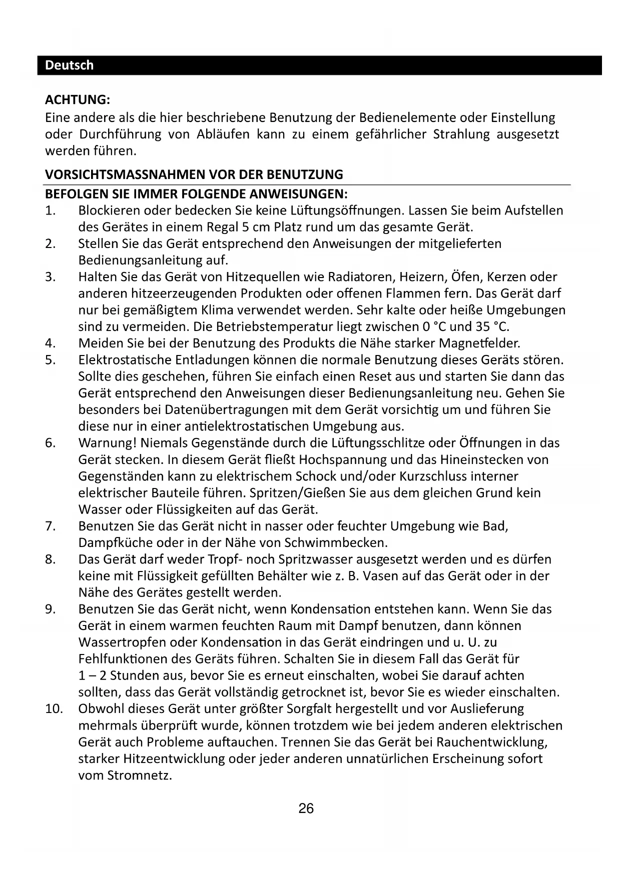8. Das Gerät darf weder Tropf- noch Spritzwasser ausgesetzt werden und es dürfen