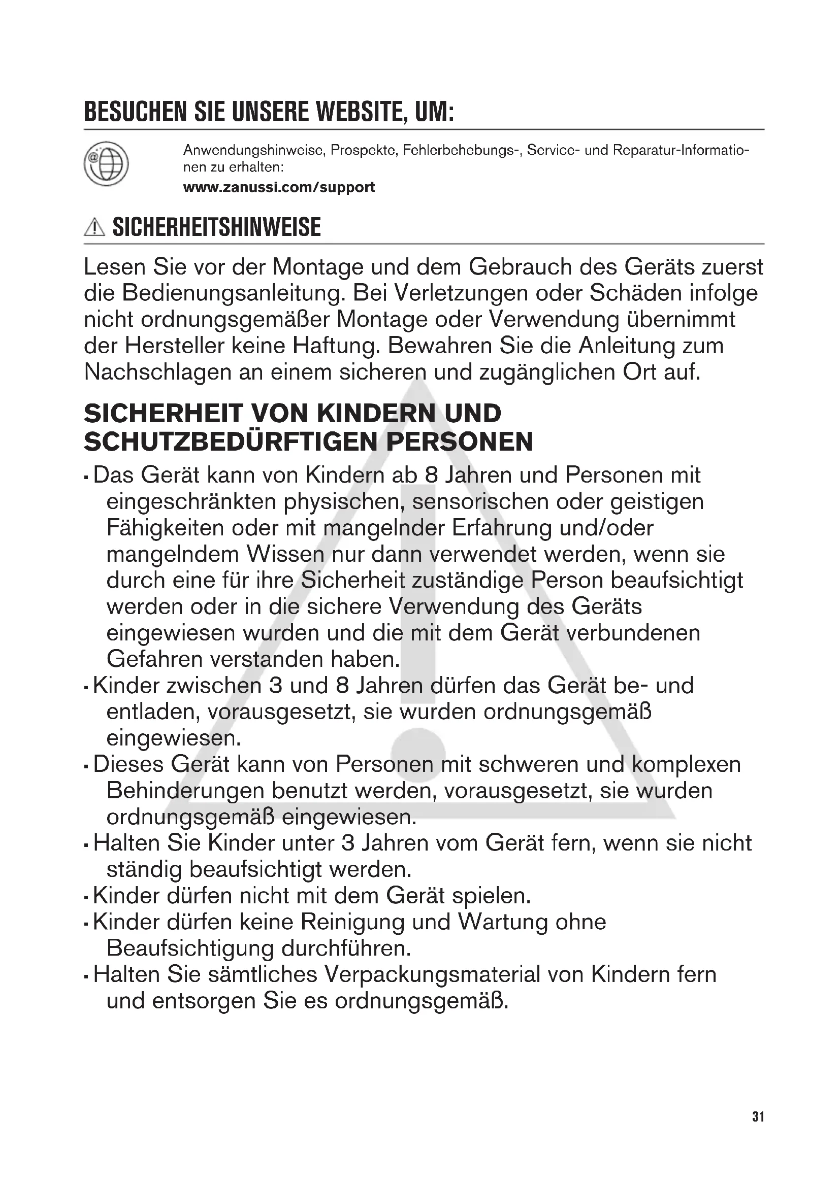 - Kinder zwischen 3 und 8 Jahren dürfen das Gerät be- und entladen, vorausgesetzt, sie wurden ordnungsgemäß eingewiesen.
