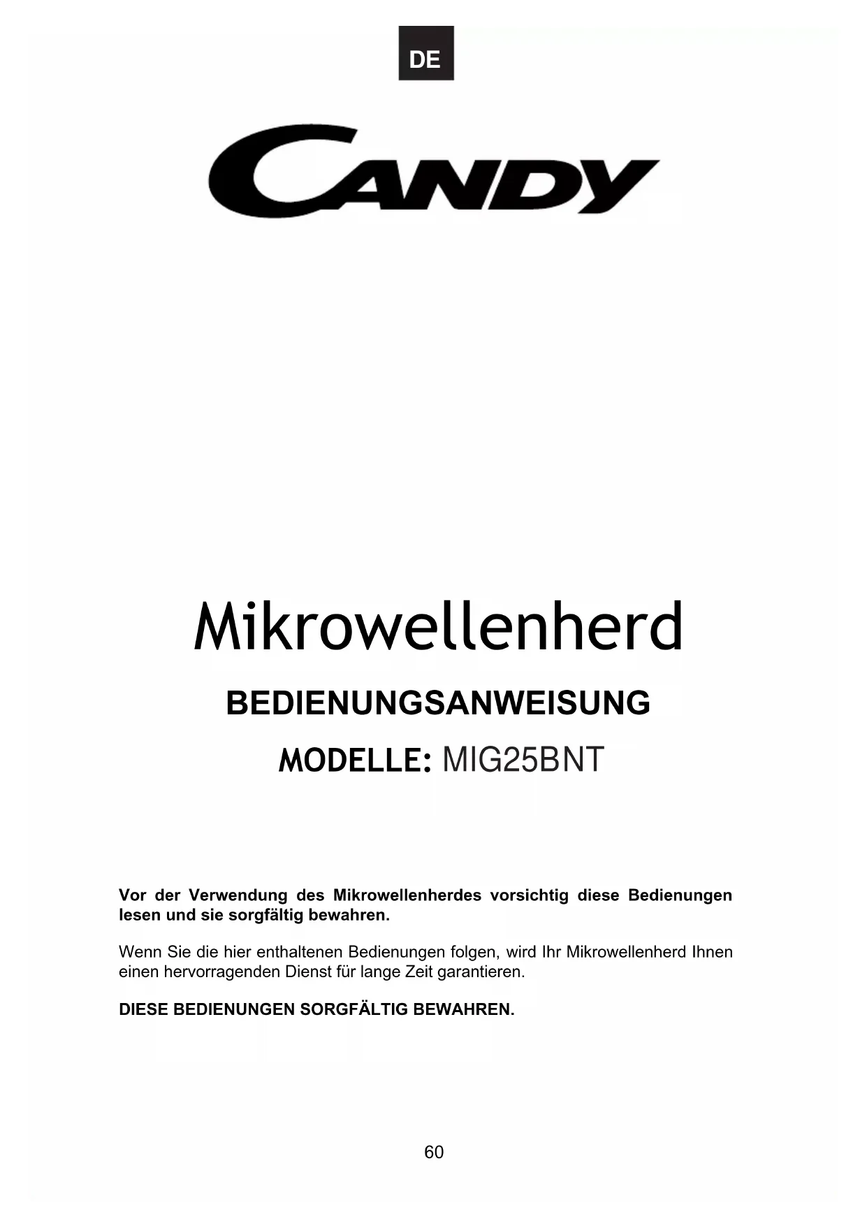 59Mikrowellenherd BEDIENUNGSANWEISUNG MODELLE: Vor der Verwendung des Mikrowellenherdes vorsichtig diese Bedienungen lesen und sie sorgfältig bewahren. Wenn Sie die hier enthaltenen Bedienungen folgen, wird Ihr Mikrowellenherd Ihnen einen hervorragenden Dienst für lange Zeit garantieren.DIESE BEDIENUNGEN SORGFÄLTIG BEWAHREN.