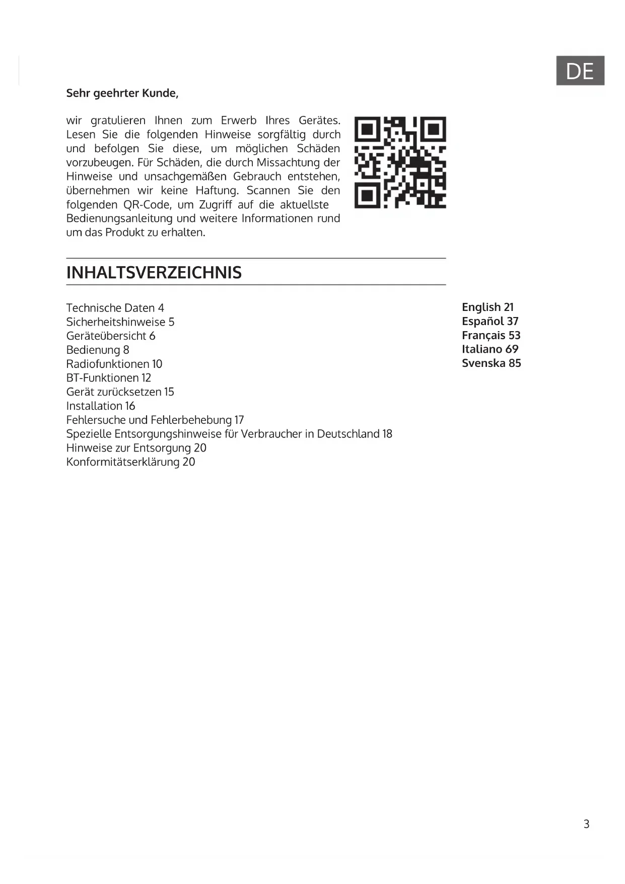 English 21 Español 37 Français 53 Italiano 69 Svenska 85 Sehr geehrter Kunde, wir gratulieren Ihnen zum Erwerb Ihres Gerätes. Lesen Sie die folgenden Hinweise sorgfältig durch und befolgen Sie diese, um möglichen Schäden vorzubeugen. Für Schäden, die durch Missachtung der Hinweise und unsachgemäßen Gebrauch entstehen, übernehmen wir keine Haftung. Scannen Sie den folgenden QR-Code, um Zugri auf die aktuellste Bedienungsanleitung und weitere Informationen rund um das Produkt zu erhalten. INHALTSVERZEICHNIS Technische Daten 4 Sicherheitshinweise 5 Geräteübersicht 6 Bedienung 8 Radiofunktionen 10 BT-Funktionen 12 Gerät zurücksetzen 15 Installation 16 Fehlersuche und Fehlerbehebung 17 Spezielle Entsorgungshinweise für Verbraucher in Deutschland 18 Hinweise zur Entsorgung 20 Konformitätserklärung 204