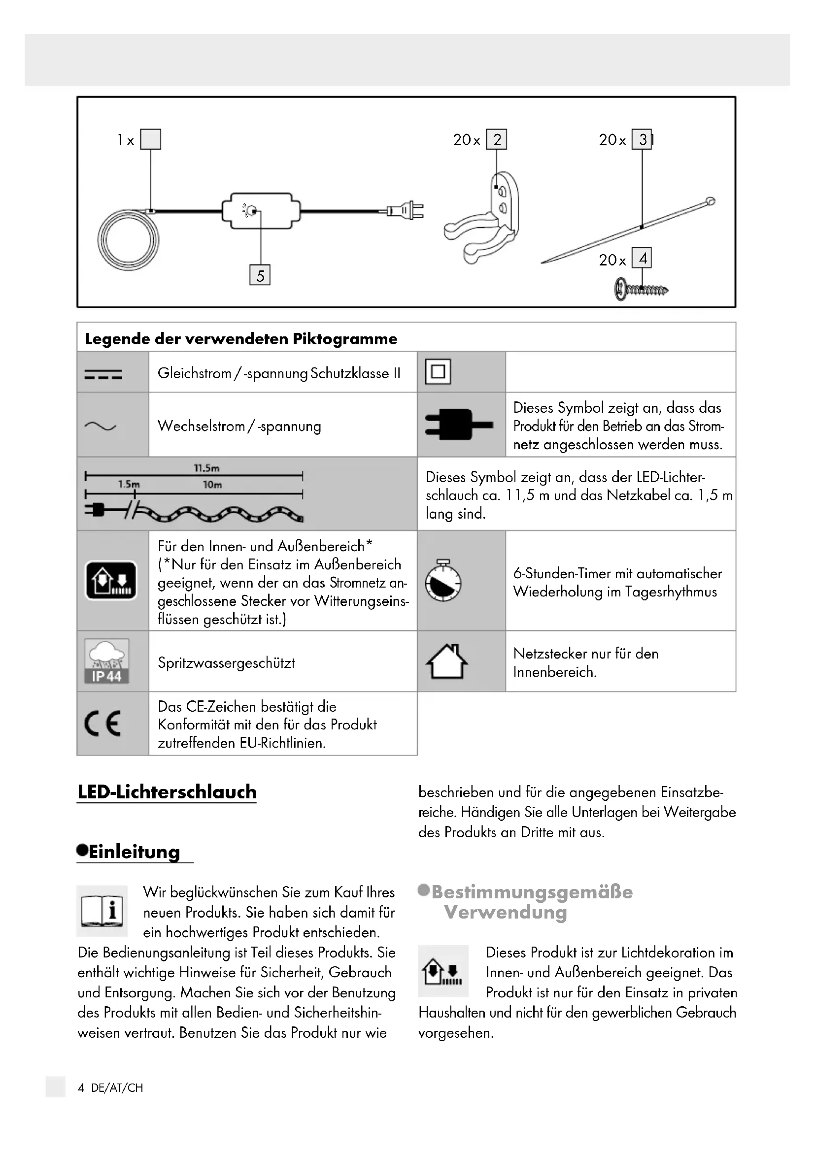 Indicazioni per l’uso e per la sicurezzaDE / AT / CH Bedienungs- und Sicherheitshinweise Seite 3 FR / CH Instructions d‘utilisation et consignes de sécurité Page 10 IT / CH Indicazioni per l’uso e per la sicurezza Pagina 173 DE/AT/CH Legende der verwendeten Piktogramme ........................................................... Seite 4 Einleitung ......................................................................................................................................... Seite 4 Bestimmungsgemäße Verwendung ....................................................................................................Seite 4 Lieferumfang ........................................................................................................................................ Seite 5 Teilebeschreibung ...............................................................................................................................Seite 5 Technische Daten ................................................................................................................................Seite 5 Sicherheitshinweise ................................................................................................................Seite 5 Sicherheitshinweise zur Montage ......................................................................................................Seite 6 Montage ...........................................................................................................................................Seite 7 Anwendung ..................................................................................................................................Seite 7 Timer verwenden .....................................................................................................................Seite 7 Reinigung und Pflege ............................................................................................................Seite 7 Lagerung .........................................................................................................................................Seite 7 Entsorgung .....................................................................................................................................Seite 8 Garantie ........................................................................................................................................... Seite 8 Abwicklung im Garantiefall ................................................................................................................Seite 8 Service .................................................................................................................................................Seite 8 V2.04 DE/AT/CH Legende der verwendeten Piktogramme Gleichstrom / -spannung Schutzklasse II Wechselstrom / -spannung Dieses Symbol zeigt an, dass das Produkt für den Betrieb an das Strom- netz angeschlossen werden muss. Dieses Symbol zeigt an, dass der LED-Lichter- schlauch ca. 11,5 m und das Netzkabel ca. 1,5 m lang sind. Für den Innen- und Außenbereich* (*Nur für den Einsatz im Außenbereich geeignet, wenn der an das S tromnetz an- gesch lossene Stecker vor Witterungseins- flüssen geschützt ist.) 6-Stunden-Timer mit automatischer Wiederholung im Tagesrhythmus Spritzwassergeschützt Netzstecker nur für den Innenbereich. Das CE-Zeichen bestätigt die Konformität mit den für das Produkt zutreffenden EU-Richtlinien. LED-Lichterschlauch Einleitung Wir beglückwünschen Sie zum Kauf Ihres neuen Produkts. Sie haben sich damit für ein hochwertiges Produkt entschieden. Die Bedienungsanleitung ist Teil dieses Produkts. Sie enthält wichtige Hinweise für Sicherheit, Gebrauch und Entsorgung. Machen Sie sich vor der Benutzung des Produkts mit allen Bedien- und Sicherheitshin- weisen vertraut. Benutzen Sie das Produkt nur wie beschrieben und für die angegebenen Einsatzbe-