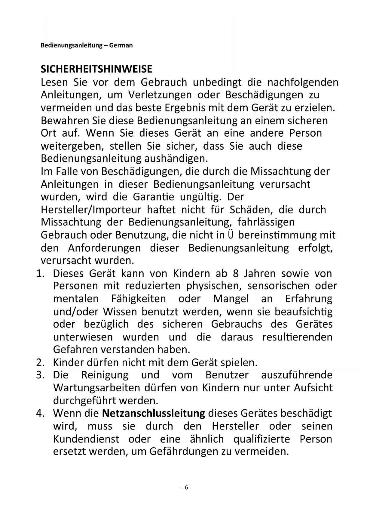 wird, muss sie durch den Hersteller oder seinen Kundendienst oder eine ähnlich qualifizierte Person ersetzt werden, um Gefährdungen zu vermeiden.- 7 -