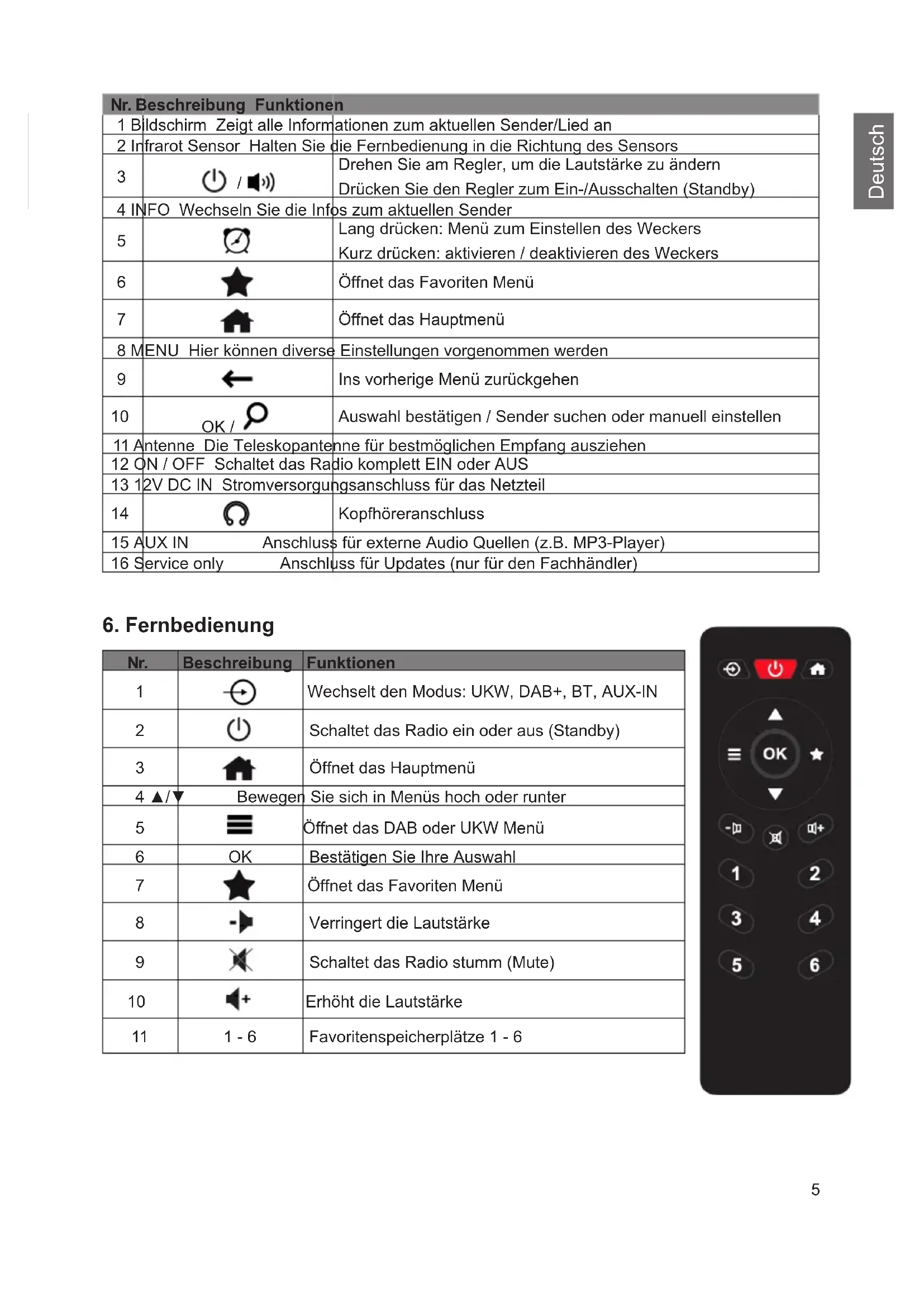Deutsch Nr. Beschreibung Funktionen 1 Bildschirm Zeigt alle Informationen zum aktuellen Sender/Lied an 2 Infrarot Sensor Halten Sie die Fernbedienung in die Richtung des Sensors