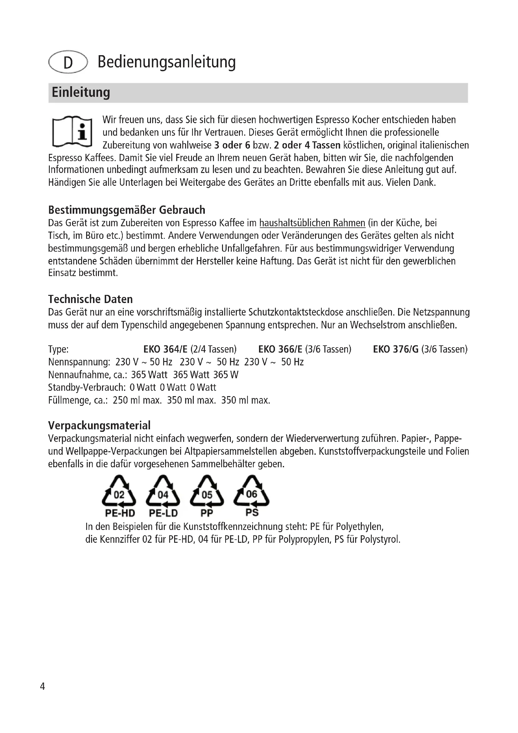 - Da der Kaffee direkt aus dem Gerät serviert wird, die Kanne vor dem Ausgießen leicht schwenken um eine gleichmäßige Stärke des Espressos zu gewährleisten.10 Hilfe bei der Fehlersuche Feststellung Mögliche Ursache Abhilfe Keine Funktion Gerät steht nicht richtig auf dem Zentralsockel; Ein/Ausschalter nicht in der richtigen Position; Netzstecker nicht korrekt eingesteckt Kanne korrekt auf dem Zentralsockel platzieren; Ein/Ausschalter nach unten drücken, der Schalter leuchtet; Netzstecker fest in die Steckdose stecken Zu wenig Aroma zu wenig Pulver verwendet; Espressopulver zu alt; falsche Espressosorte den Filtertrichter komplett mit frischem Espressopulver füllen, ggf. den 3 bzw. 2-Tassen Filtereinsatz aus dem Trichter entfernen; andere Bohnensorte verwenden Espresso zu stark, sehr bitterer Geschmack zu viel Pulver verwendet; falsche Espressosorte den Filtereinsatz locker mit Espressopulver füllen, bei reduzierter Wassermenge den 3 bzw. 2-Tassen Filtereinsatz verwenden; mildere Bohnensorte wählen Dampfaustritt aus der Verschraubung zwischen Oberteil und Wasserbehälter Oberteil und Wasserbehälter nicht fest genug verschraubt; schräge/verkantete Verschraubung von Oberteil und Wasserbehälter; Dichtung verunreinigt, beschädigt oder nicht eingelegt Netzstecker ziehen, Gerät abschalten und abkühlen lassen. Die Behälter fester verschrauben, bzw. Oberteil und Wasserbehälter trennen und wieder gerade miteinander verschrauben. Dichtung prüfen, ggf. säubern oder austauschen. Starker Dampfaustritt aus dem Kontrollventil am Wasserbehälter Espressopulver zu fest in den Filtertrichter gepresst, so dass der Dampf blockiert wird (Überdruck wird durch das Sicherheitsventil nach außen geleitet); Espressopulver zu fein gemahlen Netzstecker ziehen, Gerät abschalten und abkühlen lassen, danach den Filtertrichter leeren und wieder locker mit Espressopulver füllen, nicht festdrücken; Espressopulver mit gröberem Mahlgrad verwenden11 Introduction We are pleased that you have decided in favour of this superior Espresso Maker and thank you for your confi dence. This appliance allows you to prepare delicious, original Italian espresso in a professional way with the option to make 3 or 6 cups and 2 or 4 cups respectively. To make sure you will have much pleasure with your new appliance, please be sure to read the below information attentively and follow it. Keep this instruction manual safely. Hand out all documents to third persons when passing on the appliance. Thank you very much. Intended use The appliance is designed for preparing espresso coffee and meant for domestic use only (in the kitchen, at table, in offi ce, etc.). Other uses or modifi cations of the appliance are not intended and harbour considerable risks. For damage arising from not intended use, the manufacturer does not assume liability. The appliance is not designed for commercial use. Technical data Only connect the appliance to an isolated ground receptacle installed according to regulations. The rated voltage must comply with the details on the rating label. Only connect to alternating current. Type: EKO 364/E (2/4 cups) EKO 366/E (3/6 cups) EKO 376/G (3/6 cups) Nominal voltage: 230 V ~ 50 Hz 230 V ~ 50 Hz 230 V ~ 50 Hz Nominal power, ca.: 365 W 365 W 365 W Standby-consumption: 0 W 0 W 0 W Filling quantity, ca.: 250 ml max. 350 ml max. 350 ml max. Packing material Do not simply throw the packing material away but recycle it. Deliver paper, cardboard and corrugated cardboard packing to collecting facilities. Also put plastic packing material and foils into the intended collecting basins. In the examples for the plastic marking PE stands for polyethylene, the code fi gure 02 for PE-HD, 04 for PE-LD, PP for polypropylene, PS for polystyrene. Instruction manual GB12 For your safety