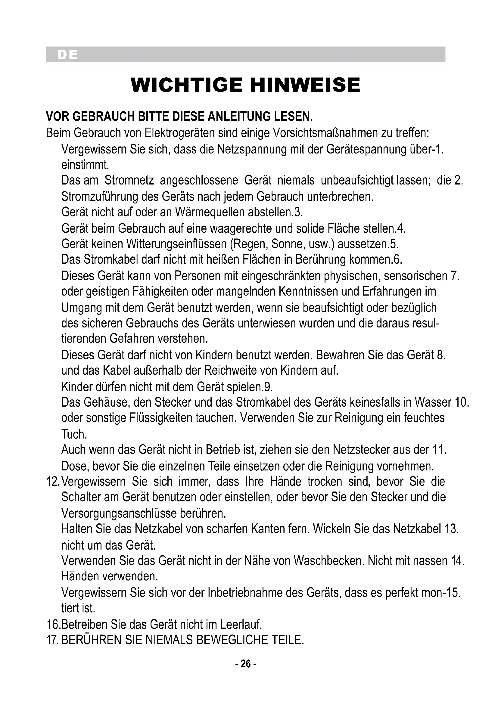 WICHTIGE HINWEISE VOR GEBRAUCH BITTE DIESE ANLEITUNG LESEN. Beim Gebrauch von Elektrogeräten sind einige Vorsichtsmaßnahmen zu treffen: Vergewissern Sie sich, dass die Netzspannung mit der Gerätespannung über-1. einstimmt. Das am Stromnetz angeschlossene Gerät niemals unbeaufsichtigt lassen; die 2. Stromzuführung des Geräts nach jedem Gebrauch unterbrechen. Gerät nicht auf oder an Wärmequellen abstellen.3. Gerät beim Gebrauch auf eine waagerechte und solide Fläche stellen.4. Gerät keinen Witterungseinflüssen (Regen, Sonne, usw.) aussetzen.5. Das Stromkabel darf nicht mit heißen Flächen in Berührung kommen.6. Dieses Gerät kann von Personen mit eingeschränkten physischen, sensorischen 7. oder geistigen Fähigkeiten oder mangelnden Kenntnissen und Erfahrungen im Umgang mit dem Gerät benutzt werden, wenn sie beaufsichtigt oder bezüglich des sicheren Gebrauchs des Geräts unterwiesen wurden und die daraus resul- tierenden Gefahren verstehen. Dieses Gerät darf nicht von Kindern benutzt werden. Bewahren Sie das Gerät 8. und das Kabel außerhalb der Reichweite von Kindern auf. Kinder dürfen nicht mit dem Gerät spielen.9. Das Gehäuse, den Stecker und das Stromkabel des Geräts keinesfalls in Wasser 10. oder sonstige Flüssigkeiten tauchen. Verwenden Sie zur Reinigung ein feuchtes Tuch. Auch wenn das Gerät nicht in Betrieb ist, ziehen sie den Netzstecker aus der 11. Dose, bevor Sie die einzelnen Teile einsetzen oder die Reinigung vornehmen. Vergewissern Sie sich immer, dass Ihre Hände trocken sind, bevor Sie die 12. Schalter am Gerät benutzen oder einstellen, oder bevor Sie den Stecker und die Versorgungsanschlüsse berühren. Halten Sie das Netzkabel von scharfen Kanten fern. Wickeln Sie das Netzkabel 13. nicht um das Gerät. Verwenden Sie das Gerät nicht in der Nähe von Waschbecken. Nicht mit nassen 14. Händen verwenden. Vergewissern Sie sich vor der Inbetriebnahme des Geräts, dass es perfekt mon-15. tiert ist. Betreiben Sie das Gerät nicht im Leerlauf.16. BERÜHREN SIE NIEMALS BEWEGLICHE TEILE.17.DE