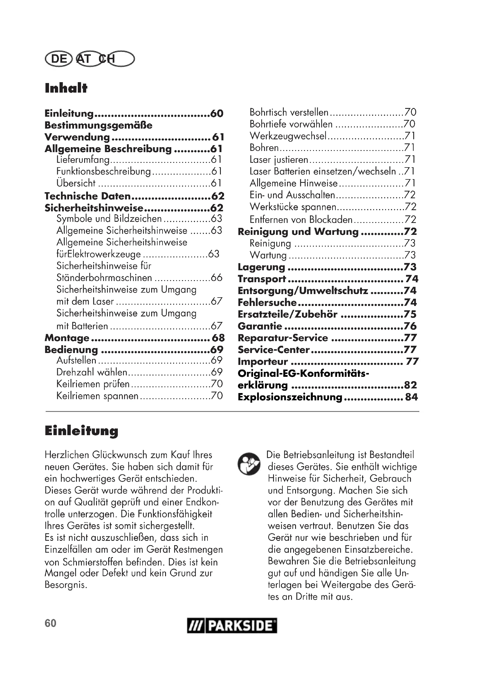 - Einleitung Herzlichen Glückwunsch zum Kauf Ihres neuen Gerätes. Sie haben sich damit für ein hochwertiges Gerät entschieden. Dieses Gerät wurde während der Produkti- on auf Qualität geprüft und einer Endkon- trolle unterzogen. Die Funktionsfähigkeit Ihres Gerätes ist somit sichergestellt. Es ist nicht auszuschließen, dass sich in Einzelfällen am oder im Gerät Restmengen von Schmierstoffen benden. Dies ist kein Mangel oder Defekt und kein Grund zur Besorgnis. Bohrtisch verstellen p. 70