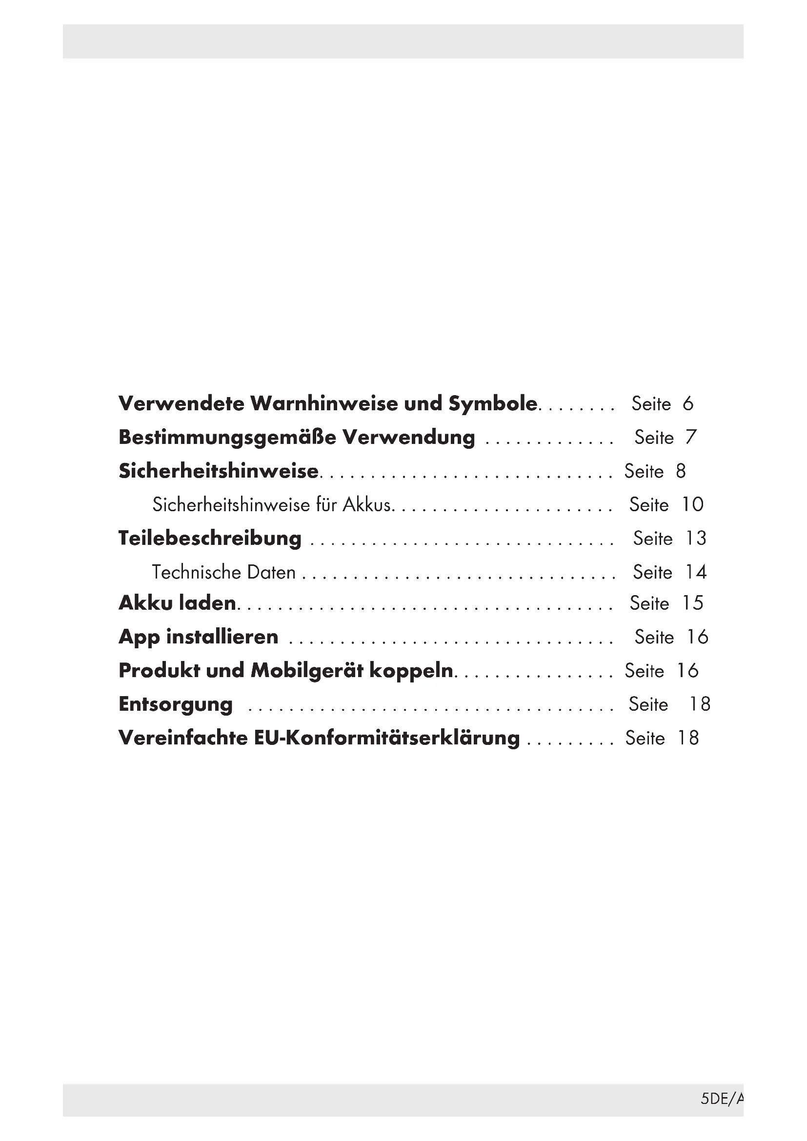 FITNESS CONNECTÉE SSG 500DE/AT/CH Kurzanleitung Seite 5 GB/IE Quick start guide Page 19 FR/BE Guide de démarrage rapide Page 33 NL/BE Startgids Pagina 47 PL Skrócona instrukcja obsługi Strona 61 CZ Krátký návod Strana 75 SK Krátky návod Strana 89Diese Kurzanleitung ist fester Bestandteil der Bedienungsanleitung. Sie dient dazu, dieses Produkt sofort in Betrieb nehmen zu können. Um alle Funktionen des Produkts vollständig nachlesen zu können, wählen Sie bitte den Link Bedienungsanleitung im App-Menü Einstellungen aus. Sie können die vollständige Bedienungsanleitung auch von der folgenden Website herunterladen: http://www.lidl-service.com Bewahren Sie diese Kurzanleitung an einem sicheren Ort auf. Händigen Sie alle Unterlagen bei Weitergabe des Produkts an Dritte mit aus. Lesen Sie vor der Verwendung die Bedienungsanleitung und beachten Sie insbesondere die darin enthaltenen Sicherheitshinweise. This quick start guide is a fixed part of the operating instructions, which enables you to start up your product immediately. In order to fully understand all functions of the product, please select the link to the Device user manual in the app’s Settings tab. You may also download the full operating instructions from this website: http://www.lidl-service.com Keep this quick start guide in a safe place. When passing this product on to third parties, please be sure to include all documentation. Read the operating instructions before use, and pay particular attention to the safety instructions included in the operating instructions. Ce petit guide de démarrage rapide fait partie intégrante du mode d’emploi. Il sert à la mise en service immédiate de ce produit. Pour pouvoir lire l‘intégralité des fonctions du produit, veuillez sélectionner le lien Manuel de l’Utilisateur dans le menu Paramètres de l‘application. Vous pouvez également télécharger le mode d‘emploi complet sur le site Web suivant: http://www.lidl-service.com Conservez ce petit guide de démarrage rapide dans un endroit sûr. Lors d‘une cession à tiers, veuillez également remettre tous les documents. Lisez le mode d‘emploi avant utilisation et portez une attention particulière aux consignes de sécurité qu‘il contient.Deze snelstartgids maakt een vast deel uit van de gebruiksaanwijzing. Het dient ervoor om het product direct in gebruik te kunnen nemen. Kies de link Device user manual in het app-menu Settings om volledig na te lezen over alle functies waarover het product beschikt. U kunt de volledige gebruiksaanwijzing ook downloaden van de volgende website: http://www.lidl-service.com Bewaar deze snelstartgids op een veilige plaats. Overhandig alle documenten bij het doorgeven van het product aan derden. Lees voor gebruik de gebruiksaanwijzing door en let daarbij vooral op de veiligheidsaanwijzingen die erin staan. Niniejsza instrukcja skrócona jest integralną częścią instrukcji obsługi. Umożliwia natychmiastowe uruchomienie produktu. Aby w pełni zrozumieć wszystkie funkcje produktu, należy skorzystać z łącza do Instrukcja obsługi w zakładce Ustawienia w aplikacji. Pełną instrukcję obsługi można też pobrać z tej strony: http://www.lidl-service.com Tę skróconą instrukcję obsługi należy przechowywać w bezpiecznym miejscu. W przypadku przekazania produktu osobom trzecim należy dołączyć wszystkie dokumenty. Przed użyciem należy przeczytać instrukcję obsługi i zwrócić szczególną uwagę na zawarte w niej wskazówki bezpieczeństwa. Tento stručný návod je nedílnou součástí návodu na obsluhu. Slouží k tomu, aby bylo možné tento výrobek ihned uvést do provozu. Abyste dokázali zcela přečíst všechny funkce výrobku, vyberte odkaz Uživatelský manuál v aplikační nabídce Nastavení. Také si můžete stáhnout kompletní Návod k obsluze z následující webové stránky: http://www.lidl-service.com Uchovávejte tento krátký návod na bezpečném místě. Při předání výrobku třetí osobě předejte i všechny podklady. Přečtěte si návod k obsluze před použitím a dodržujte zvláště bezpečnostní pokyny v něm obsažené. Tento stručný návod je neoddeliteľnou súčasťou návodu na používanie. Slúži na okamžité uvedenie tohto produktu do prevádzky. Kompletné funkcie produktu nájdete pod odkazom Používateľská príručka v menu aplikácie Nastavenie. Kompletnú používateľskú príručku si môžete tiež stiahnuť z nasledujúcej webovej stránky: http://www.lidl-service.com Túto stručnú príručku uschovajte na bezpečnom mieste. V prípade postúpenia produktu ďalším osobám odovzdajte aj všetky dokumenty patriace k produktu. Pred použitím si prečítajte tento návod na používanie a venujte osobitnú pozornosť predovšetkým bezpečnostným upozorneniam, ktoré sú v ňom uvedené.5DE/AT/CH Verwendete Warnhinweise und Symbole........ Seite 6 Bestimmungsgemäße Verwendung ............. Seite 7 Sicherheitshinweise............................. Seite 8 Sicherheitshinweise für Akkus...................... Seite 10 Teilebeschreibung .............................. Seite 13 Technische Daten ............................... Seite 14 Akku laden..................................... Seite 15 App installieren ................................ Seite 16 Produkt und Mobilgerät koppeln................ Seite 16 Entsorgung .................................... Seite 18 Vereinfachte EU-Konformitätserklärung ......... Seite 186 DE/AT/CH FITNESS-SMARTWATCH Verwendete Warnhinweise und Symbole In dieser Bedienungsanleitung werden folgende Warnhinweise verwendet: GEFAHR! Dieses Symbol mit dem Signalwort „GEFAHR“ bezeichnet eine Gefährdung mit einem hohen Risikograd, die, wenn sie nicht vermieden wird, eine schwere Verletzung oder den Tod zur Folge hat. WARNUNG! Dieses Symbol mit dem Signalwort „WARNUNG“ bezeichnet eine Gefährdung mit einem mittleren Risikograd, die, wenn sie nicht vermieden wird, eine